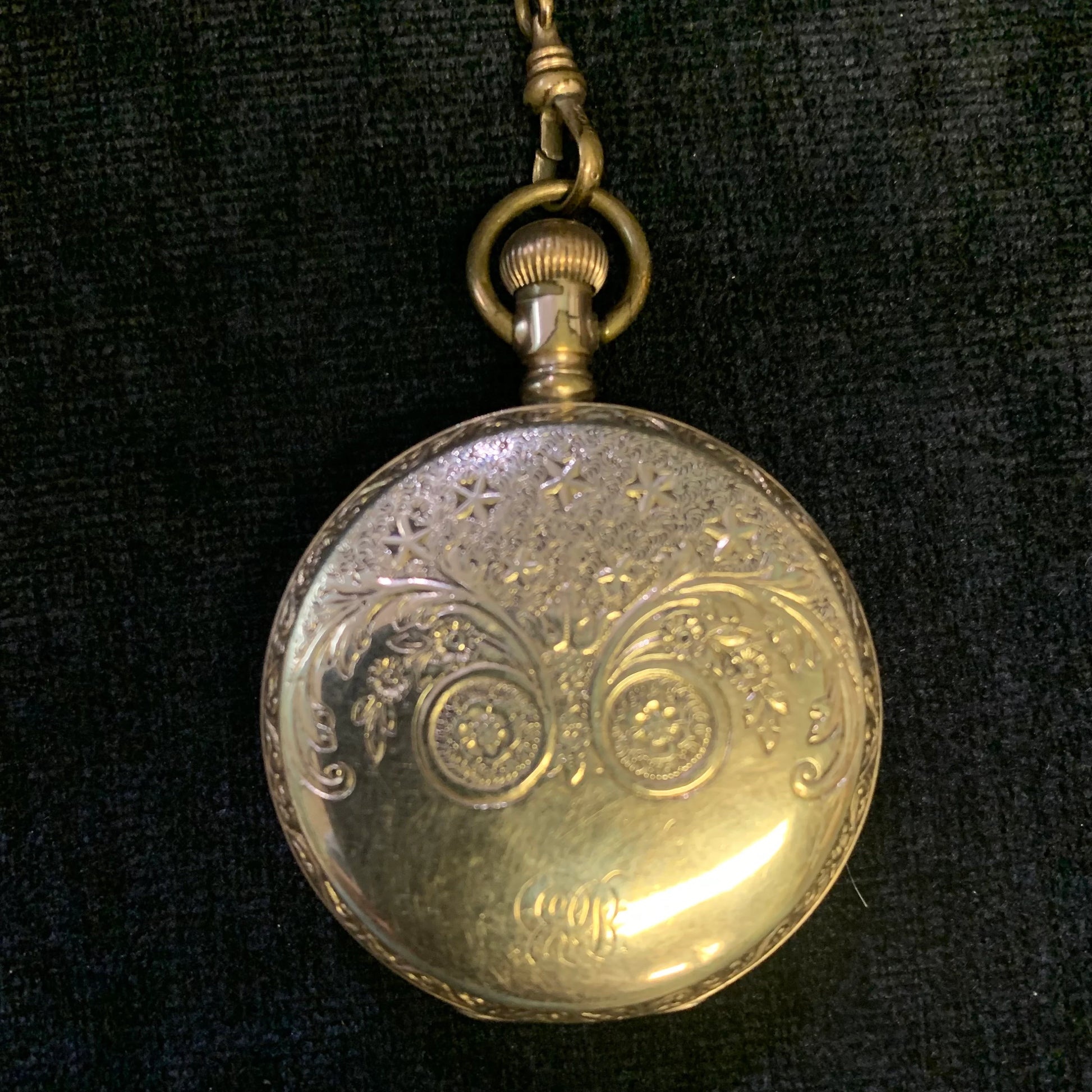 This is a 14 karat gold pocket watch made by Elgin in Elgin, Illinois. This watch has beautiful inscribed designs around the front and back of the watch. There is also "EB" inscribed into the front. The front of the watch unlatches to reveal the clock face. The back also unlatches and it opens to the inside of the clock. The serial number found on the inside of the clock is 6634686. Based on the serial number this particular pocket watch was likely made in 1897. The clock has a diameter of 1.5" and it is just over 0.25 in height. The chain and handle together are just over 8" long. The chain has a charm at the end that has an "E" inscribed into it.