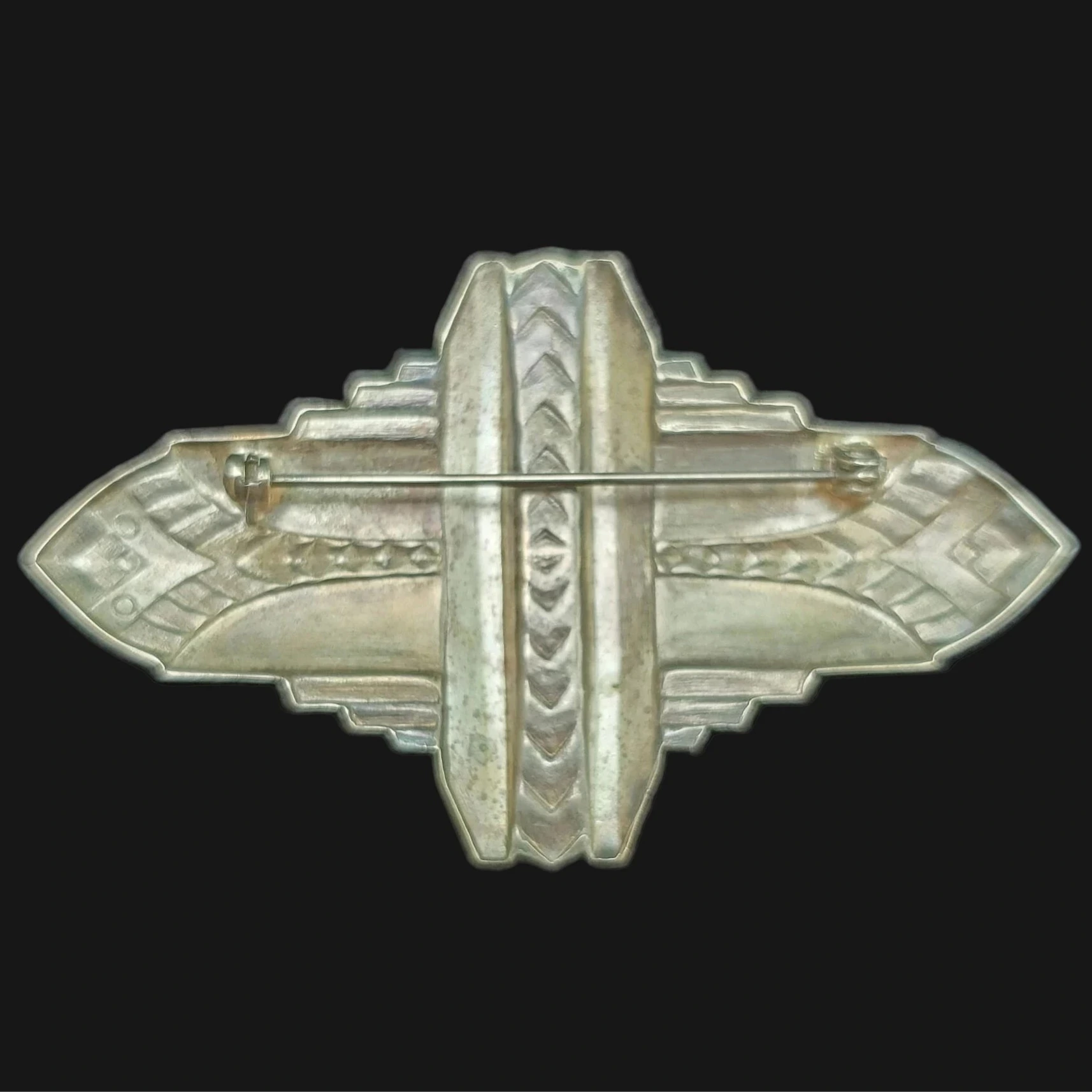 This Art Deco pin was made in the 1940s. Art Deco design originated with architecture in France before World War 1 and soon started to influence furniture, jewelry, fashion, household items, cars, and even trains. The style is known for its bold geometric forms created with fine components, and often representing luxury and wealth. The pin is in great condition with a flat black glass setting topped with a crystal stone.