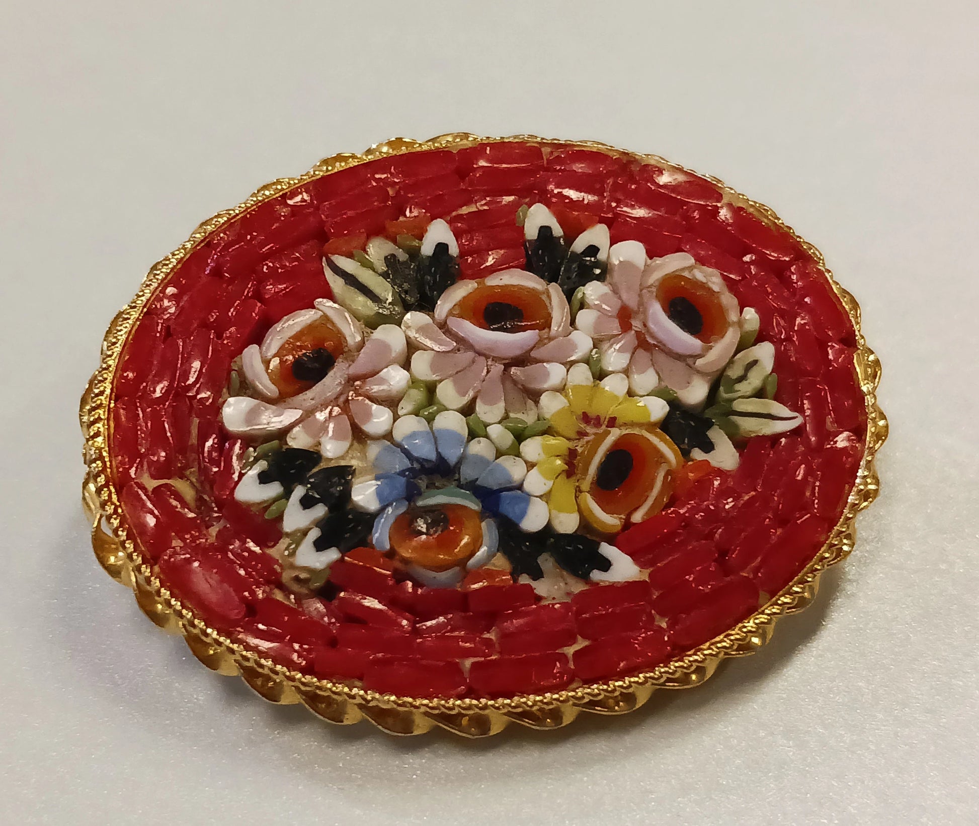 Composed of glossy red Italian beads, and an adorable floral pattern, this brooch is sure to liven up any coat, scarf, or dress. The brooch is a gold tone base, with painted stones and Italian glass beads arranged in an intricate, and gentle design. At 1.5in long (see photos), this pin is elaborate, yet unobtrusive, and ready to go home with someone who will appreciate its artistry. The whole of the pin is in good condition, with minimal signs of age (see photos), making it ready to wear on day one.