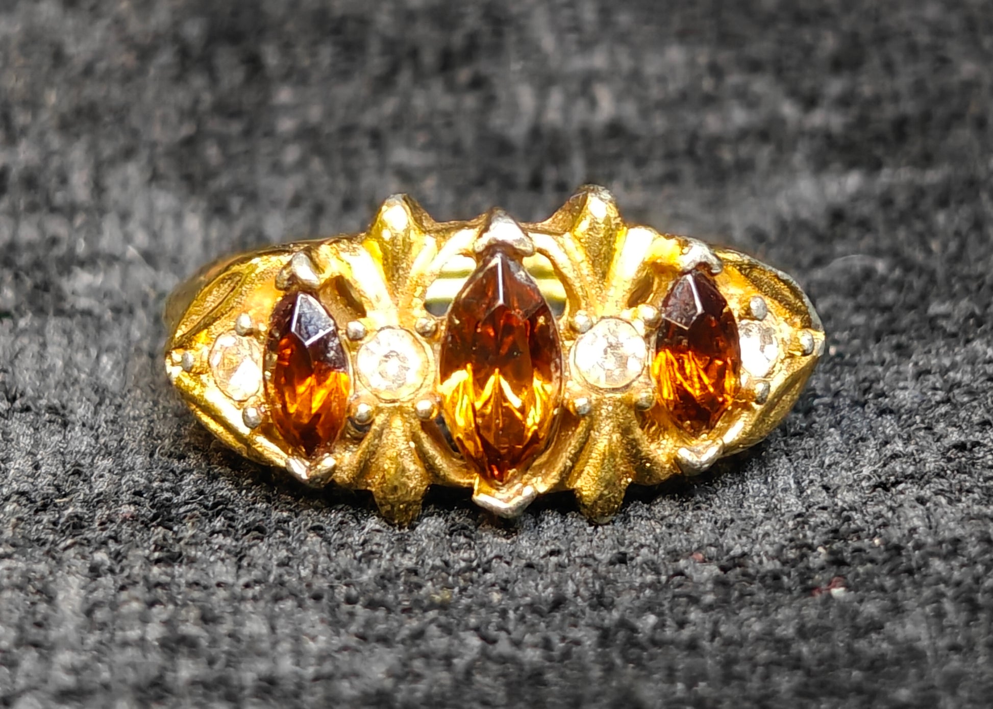 Item: Gold -tone ring with large honey colored central setting and 2 smaller honey colored settings. each setting is book-ended by a small Austrian Crystal.