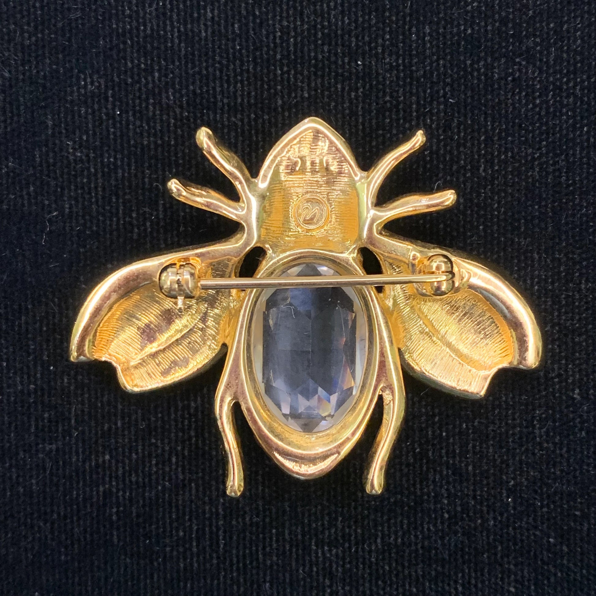 This stunning bee pin from Swarovski is the perfect addition to a collection of Bee or Bug Brooches. The beautiful large crystal body reflects light colors wonderfully. The gold frame complements any color it is paired with. The piece is in excellent condition with no visible scratches or marks. This is a terrific example of the fantastic crystals the Swarovski company is famous for creating.