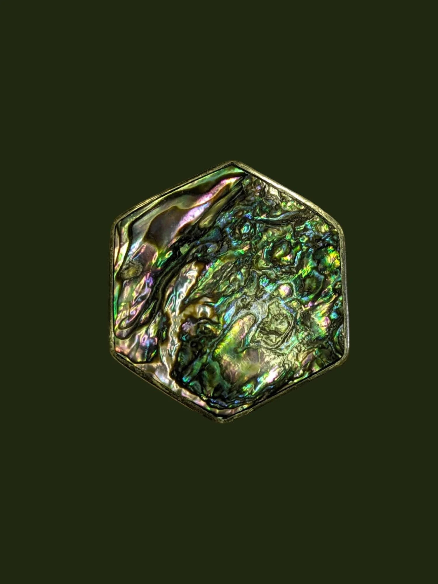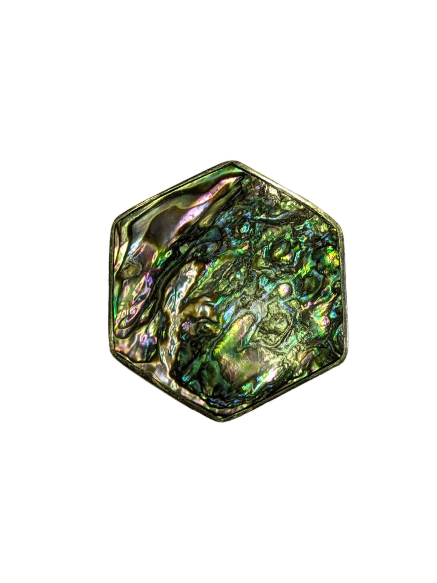 This Is A Beautiful Set of Teardrop Shaped Earrings with a matching Pendant/Pin. The pendant is covered with a large piece of abalone shell which covers the entire hexagonal shape with just a line of alpaca silver around the outside and on the backside. There is a silver loop on the back to use the pendant as a necklace. Just put it on any plain silver chain you may have. Or use the pin back, which is on the pendant and wear it as a brooch. The pin back works fine but the bar has a tiny bend, which does not affect the use. (see photos).