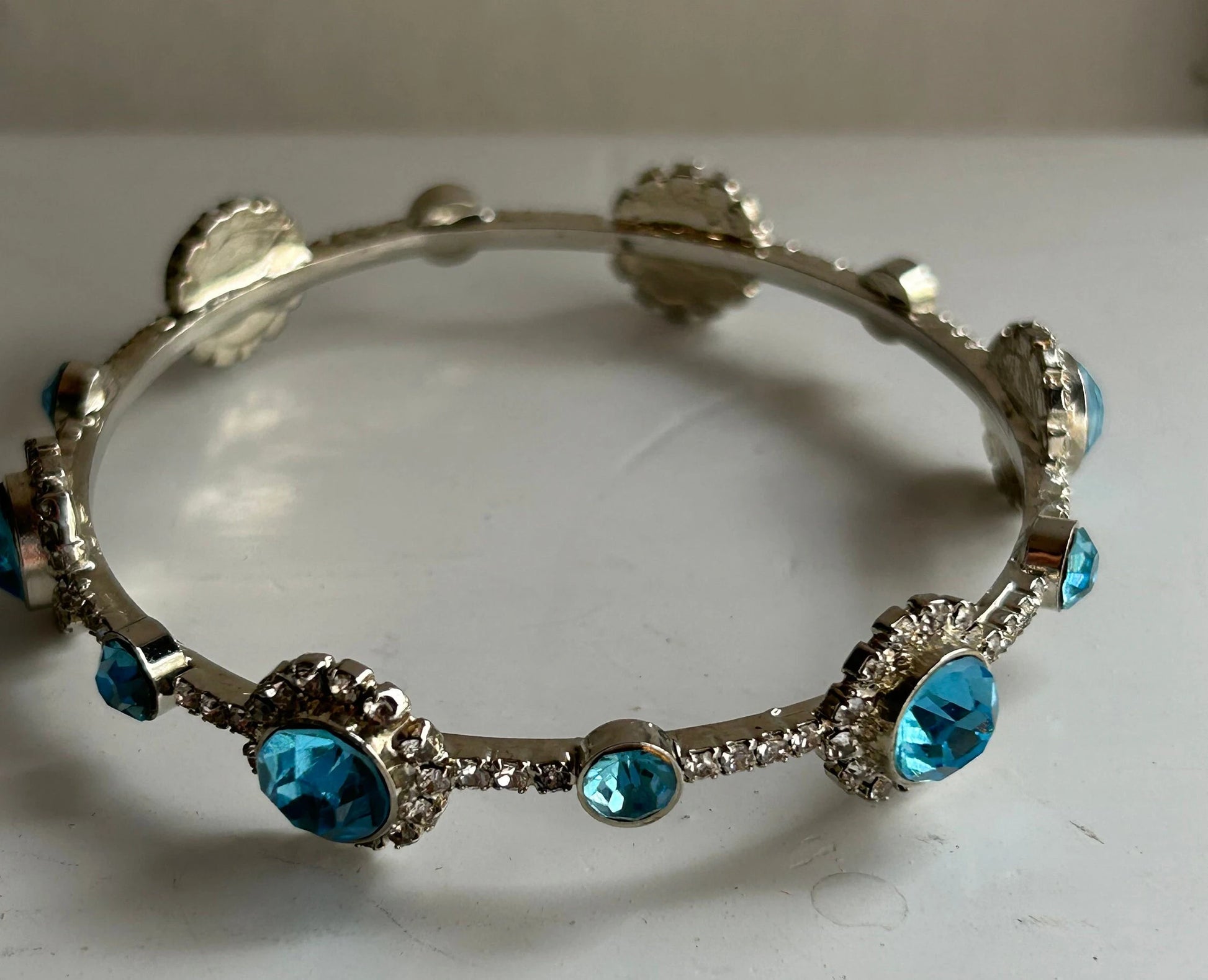 This wonderful vintage bangle bracelet would make a lovely addition for you prom night out or for the "something blue" at a wedding! In wonderful condition. The Bangle has an inside diameter of 2.5 inches. All settings are in place.