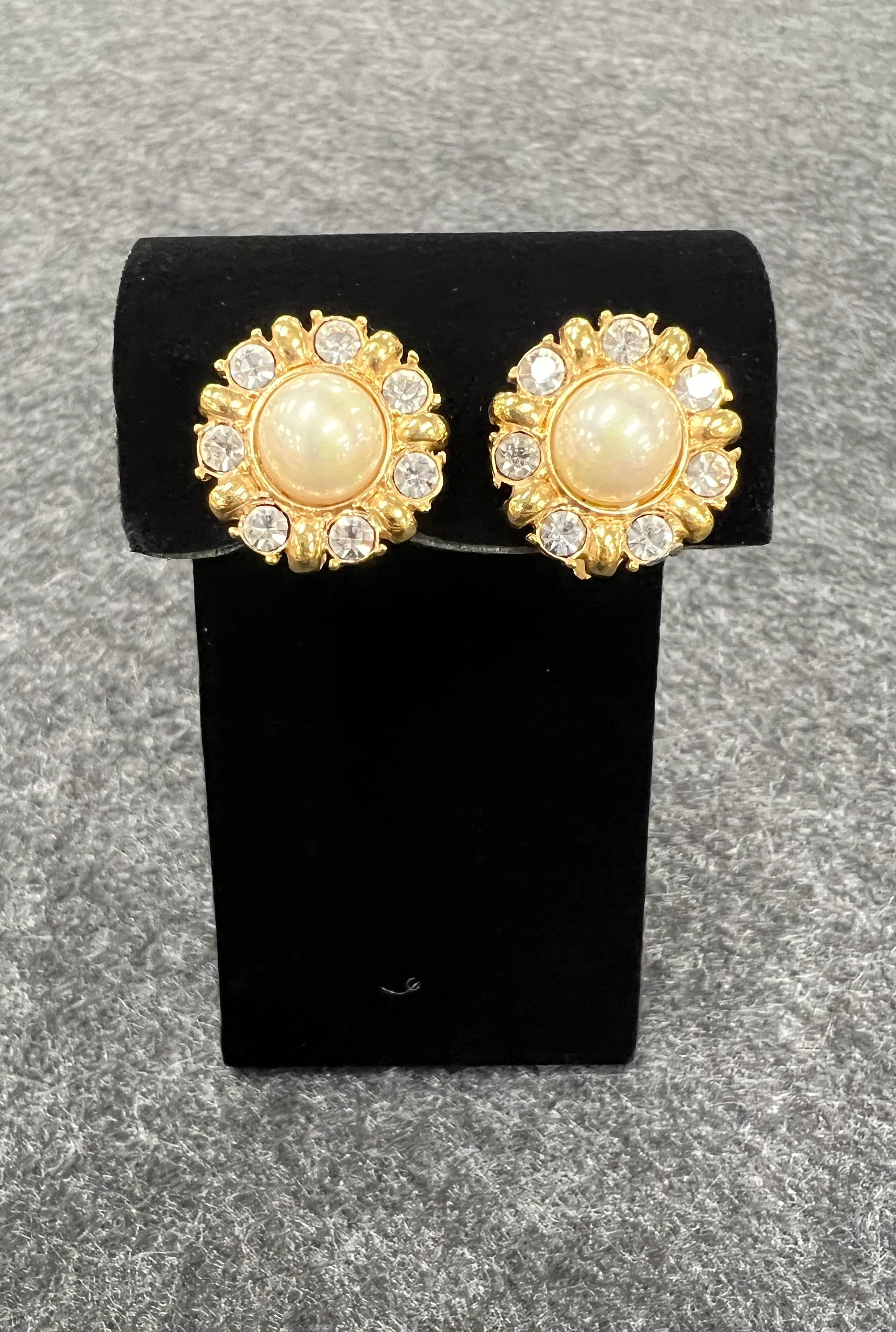 Aressa - Genuine Crystal Clip On Earrings - Vintage Pearl on Gold tone circled in Crystal Rhinestones