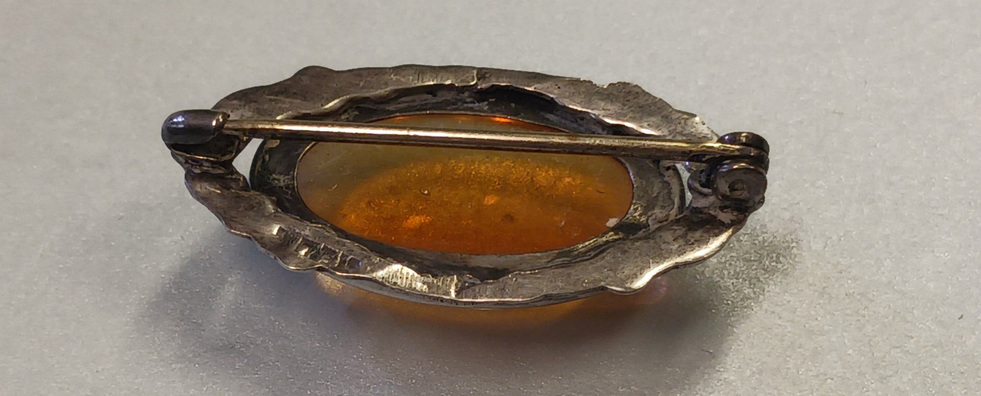 This is a rare and especially dazzling little collar brooch, is ready to take your next outfit or Bohemian Glass collection up a notch. At 1.5" in length and just a little over half an inch tall, it packs a real punch inner color. This pin in it's sterling silver base holds a sparkling cabochon of Bohemian Dragon's Breath Opal. Dragon's Breath opal is not a class of genuine opal, but rather man made glass. The manufacturing process involves adding molten metal to Czech glass in order to create its reflective shine. There are other kinds of these cabochons that even reflect deep purples and fiery reds. They are usually referred to as "Mexican Opals". This one has a very subtle charm, with its citrus-like, orange base which reflects flashes of lavender and white. The overall condition of the brooch is very good. The closure pin is functional (same type of pin used in the late part of the 1800s), the cabochon, which is rather large, and sterling silver base have minimal signs of wear, aside from some traces of residue around the hinges (see photos) that can be easily cleaned up. Ultimately, this would make a very unique gift for yourself or someone in your life.