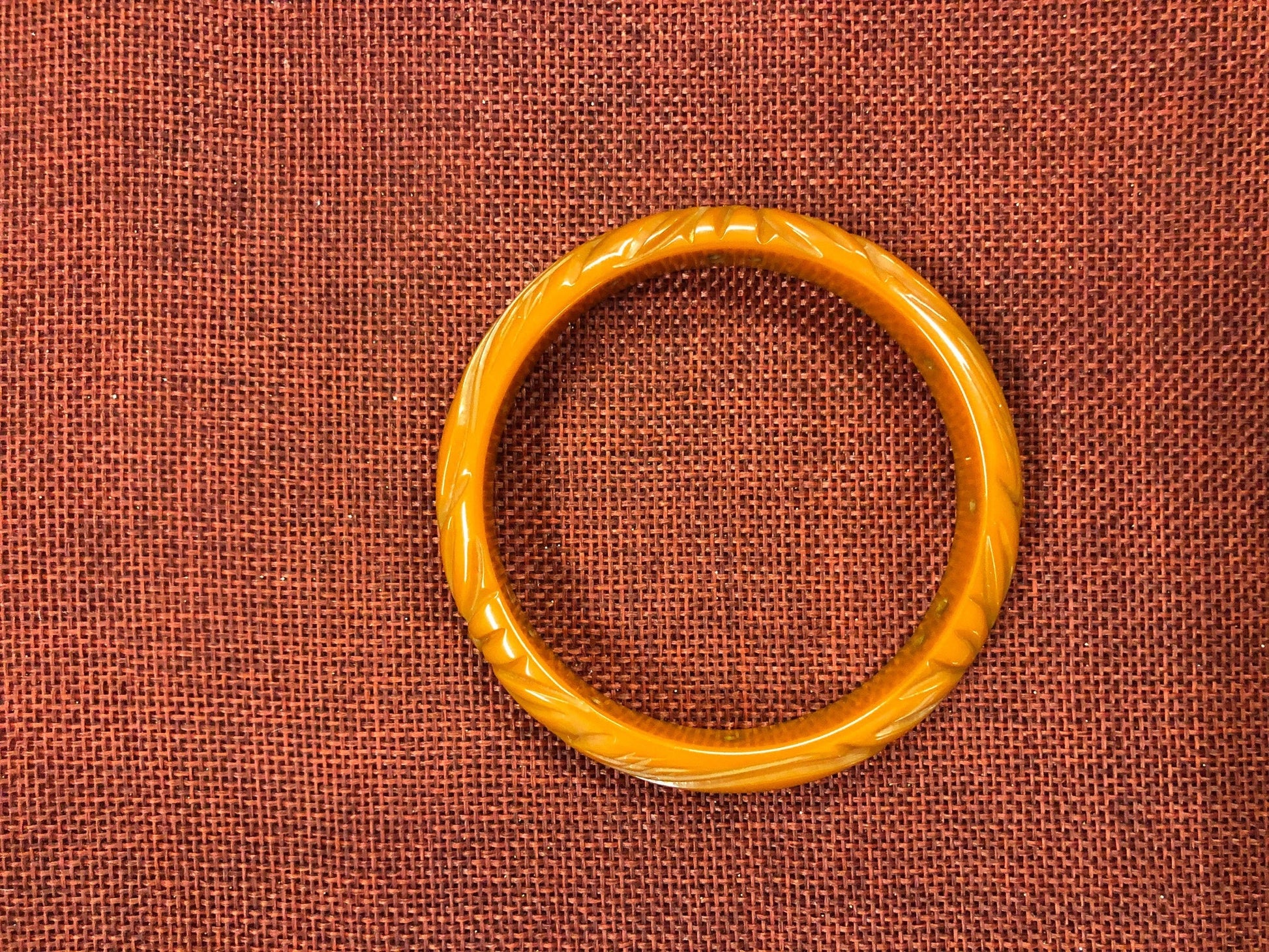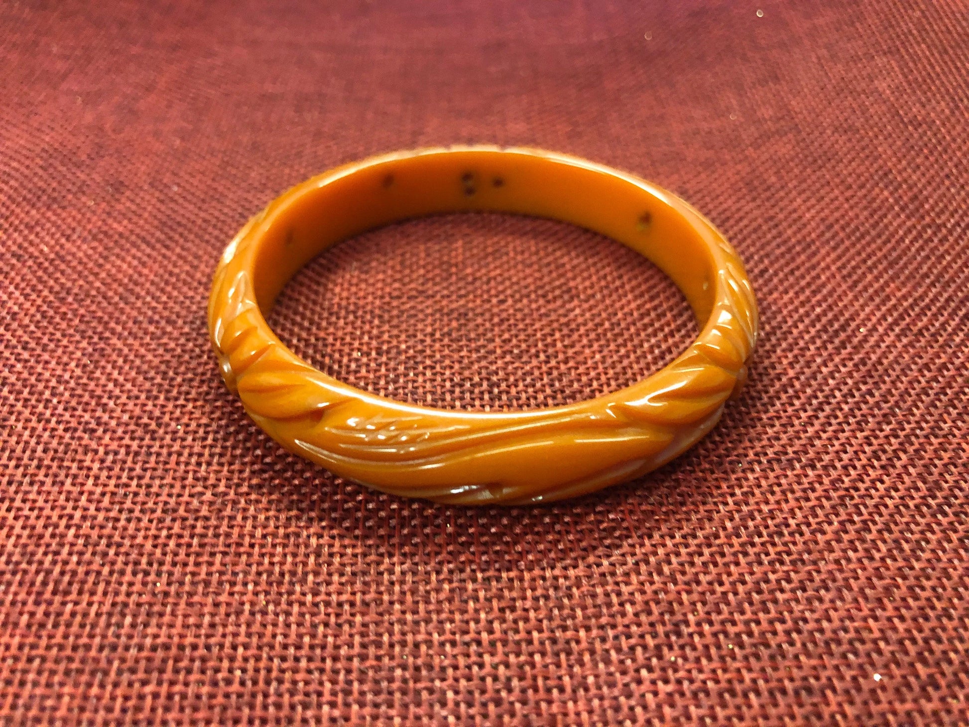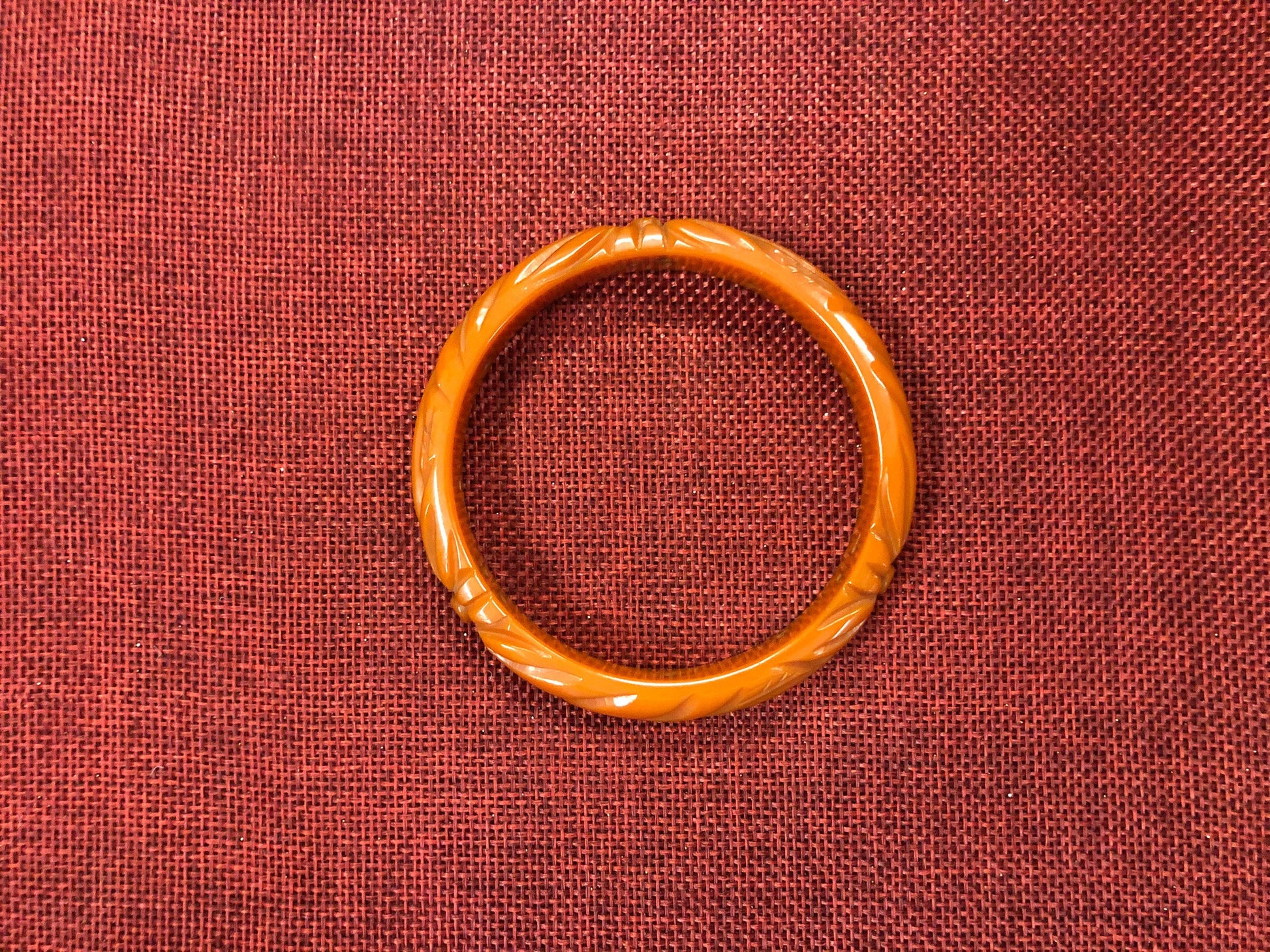 This beautiful bakelite bangle is carved with flower designs and is a rust orange. It has a diameter of 3'' across and 2.5'' inside. It is a great gift or an addition to your vintage look.