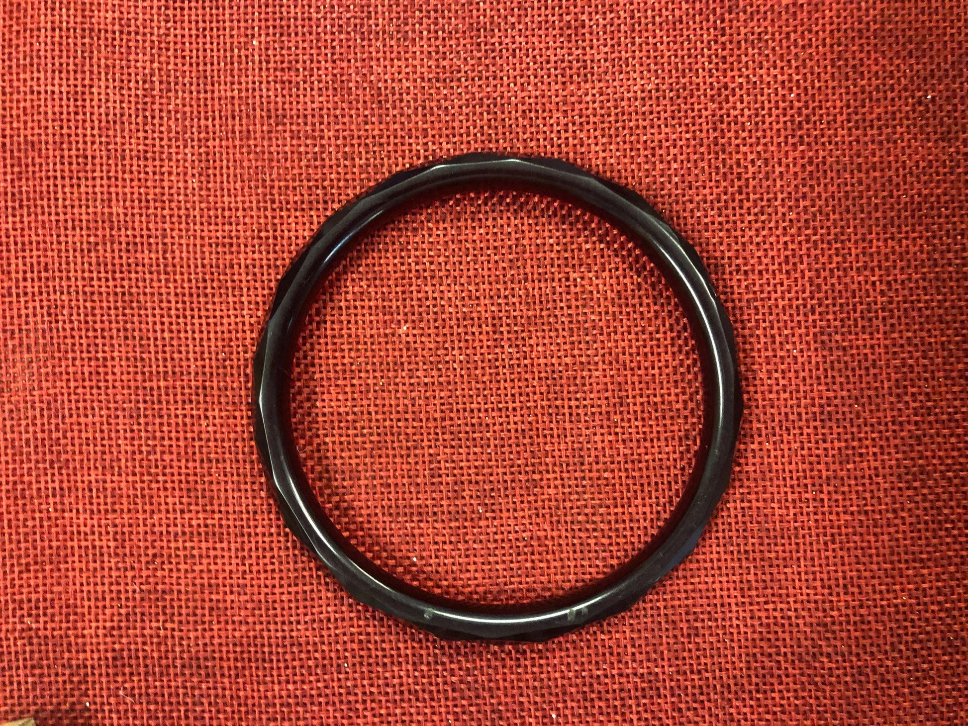 This beautiful dark cherry colored bangle is made of Bakelite with diamond edges. It is a very large size and looks like red honey. A beautiful addition to your vintage wardrobe.