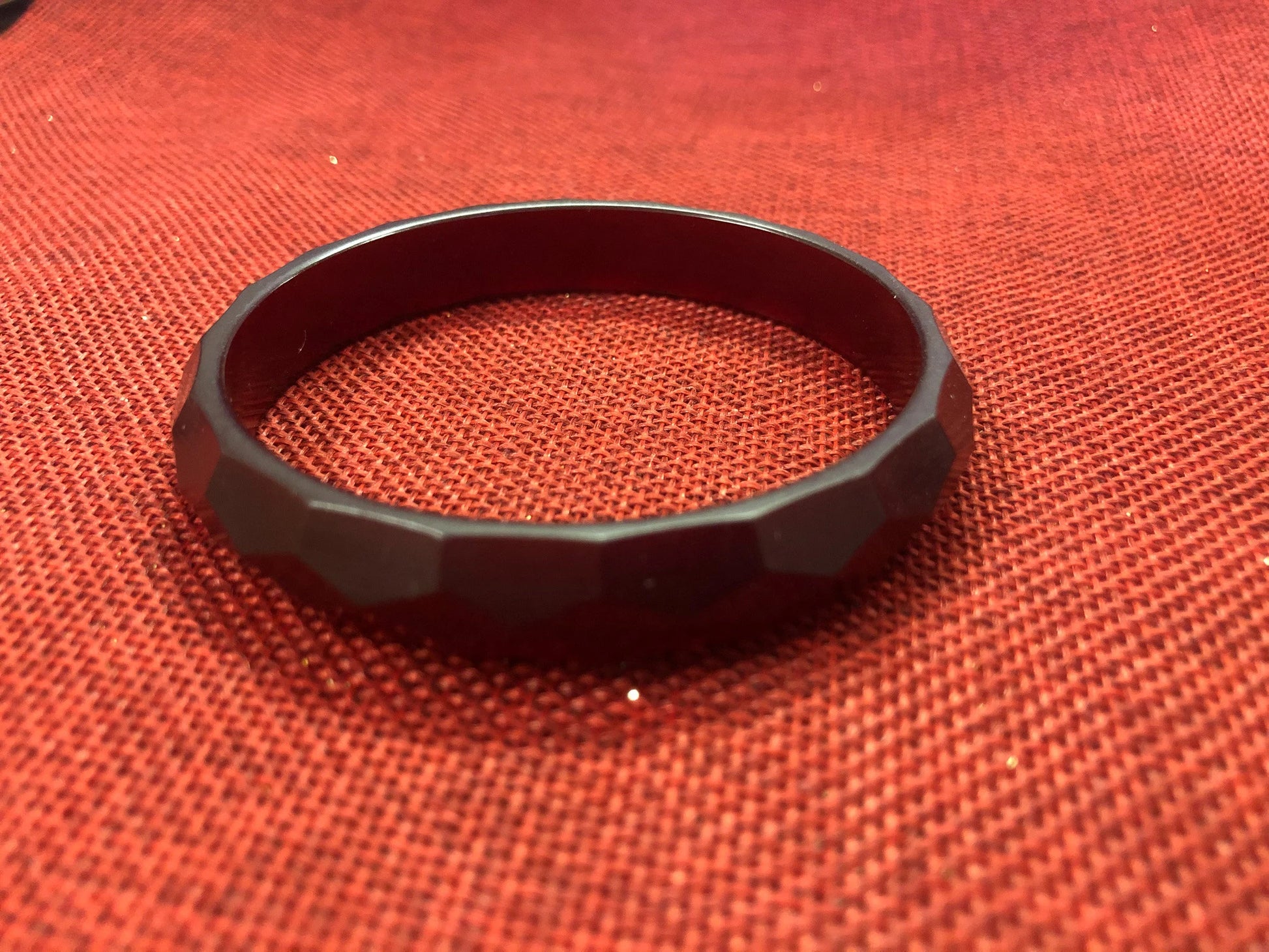 This beautiful bakelite bangle is a beautiful, deep, whiskey red with diamond cutting on the sides. It is a great gift or an addition to your vintage look.