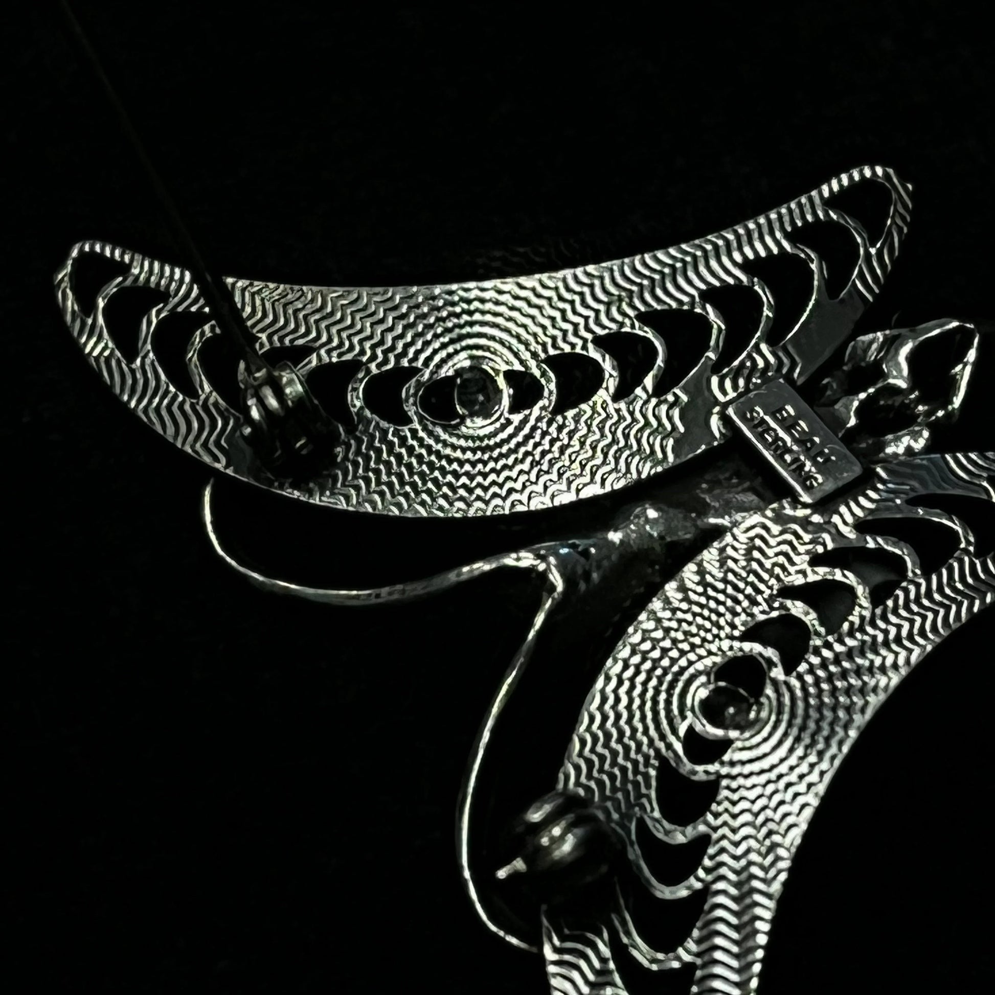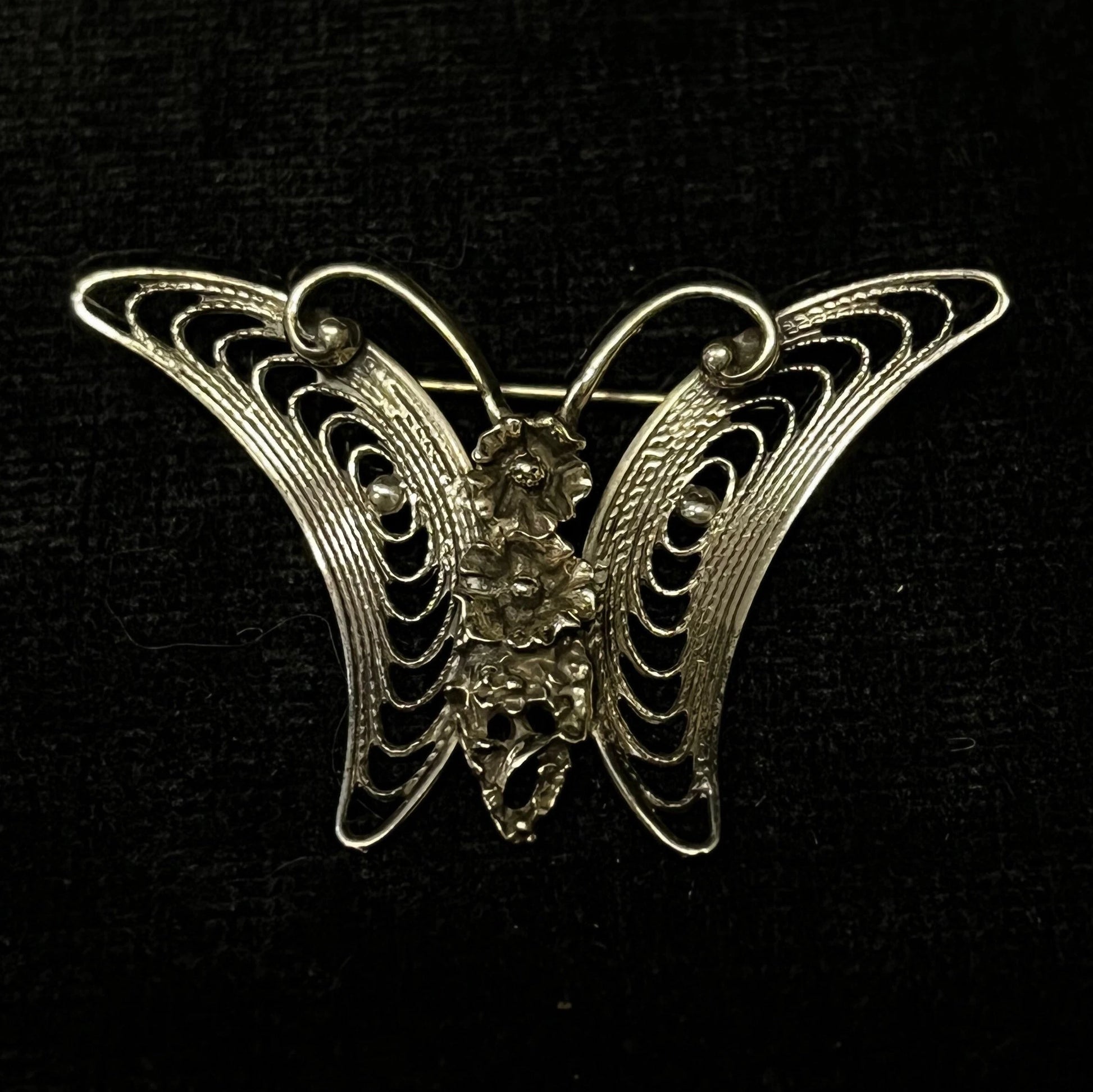 This beautiful delicate brooch is a figural butterfly, and the body is a row of flower blossoms. The wings are crafted with a delicate filigree design. The entire pin is made of sterling silver by the company BeauCraft Inc. The pin which could be fastened on your shoulder to, like a real butterfly, testing a new spot, is 2" x 1.25".