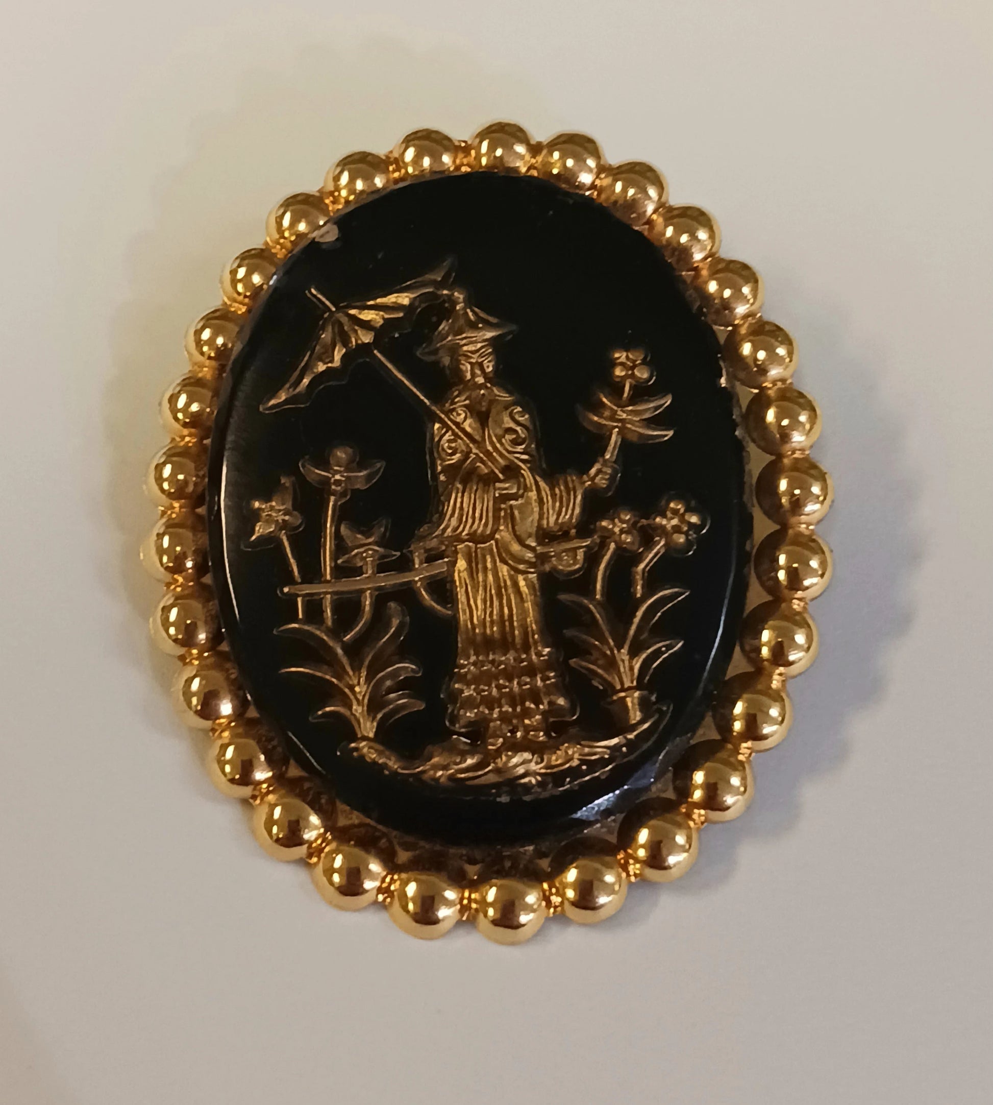 The item for sale is a beautifully unique art brooch. At 1.5in wide and 2in long, this item packs a lot of detail into its small size. The base and bubble trim of the item are a gold tone metal, which holds a glass oval cabochon. The cabochon has a clear top, but a bottom that's been painted black in order to better display a golden, 3D design. The art within depicts an older man in early Eastern fashion (possibly Chinese), he is wearing a straw hat, has a sword attached to his back, and is holding a paper parasol in one hand, and a flower in the other. He is surrounded by tall grass, and flowers similar to the one he's holding. The condition of this piece is very good. It has minimal imperfections (see photos), and the pin itself is fully functional.