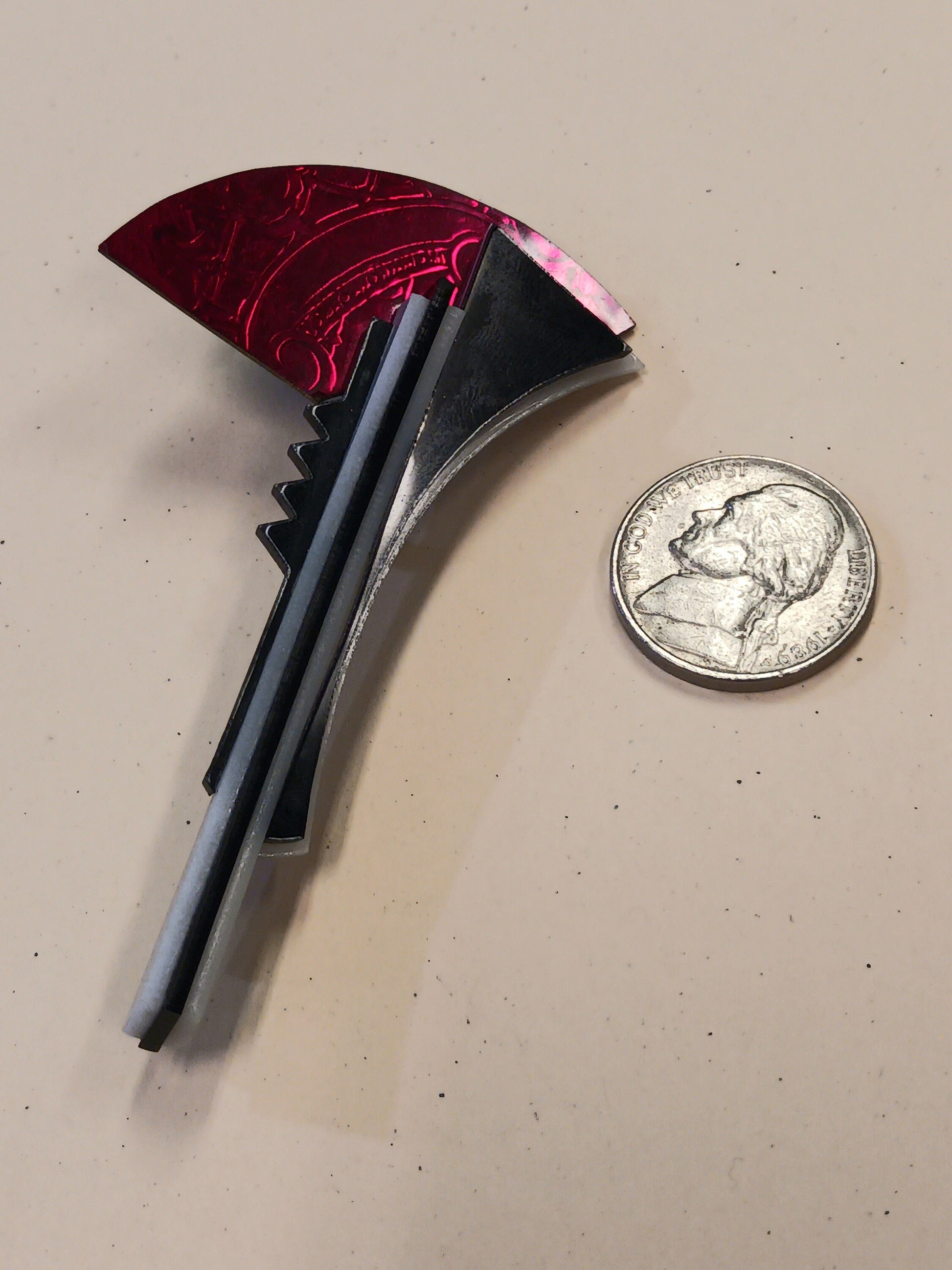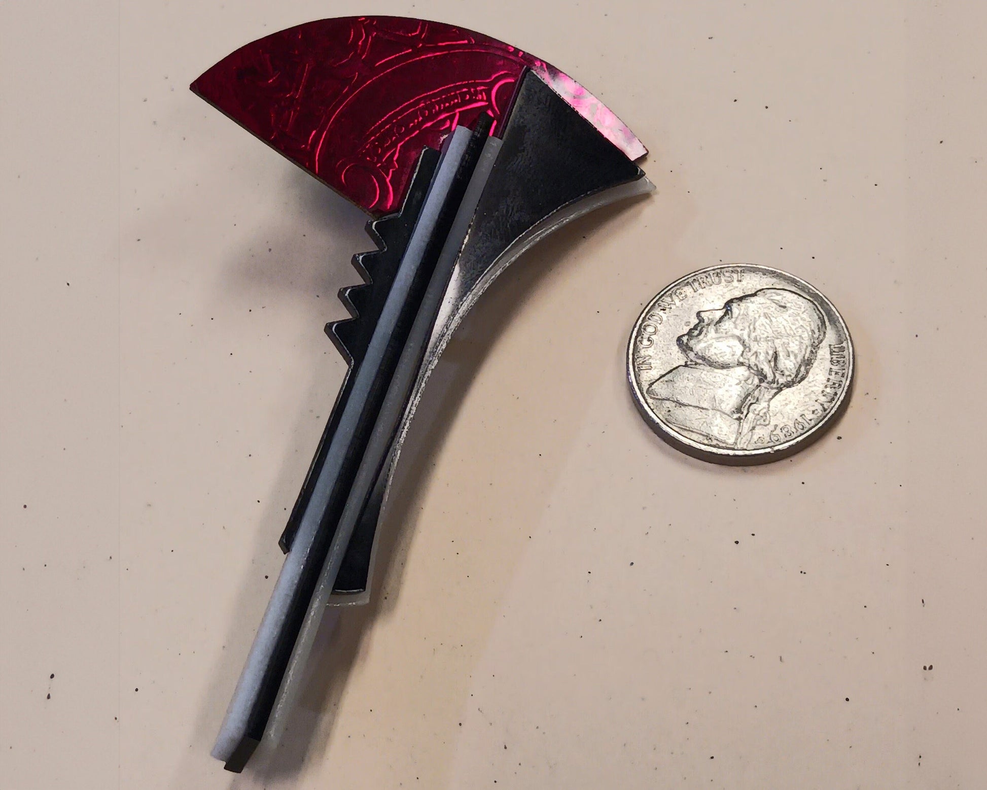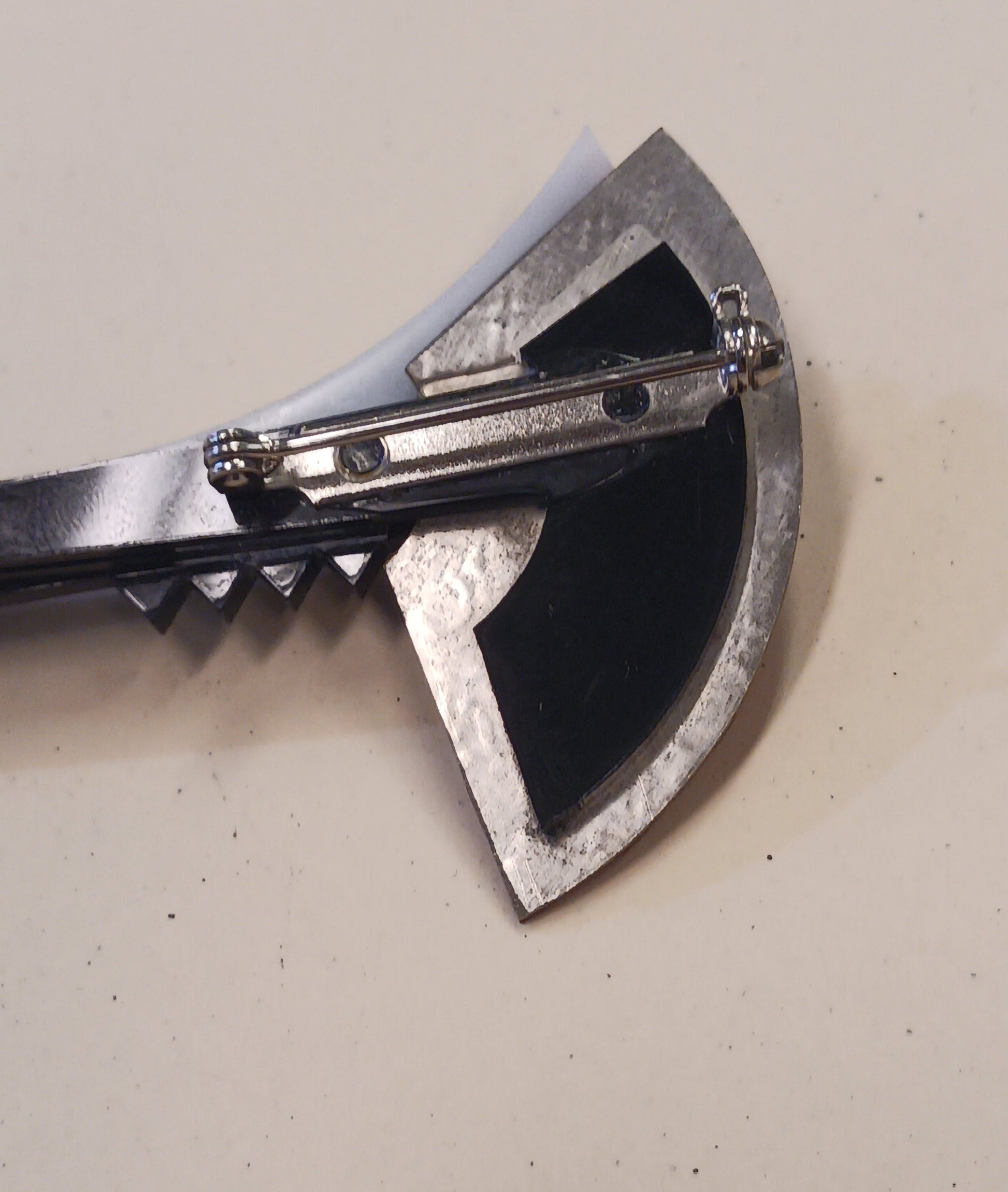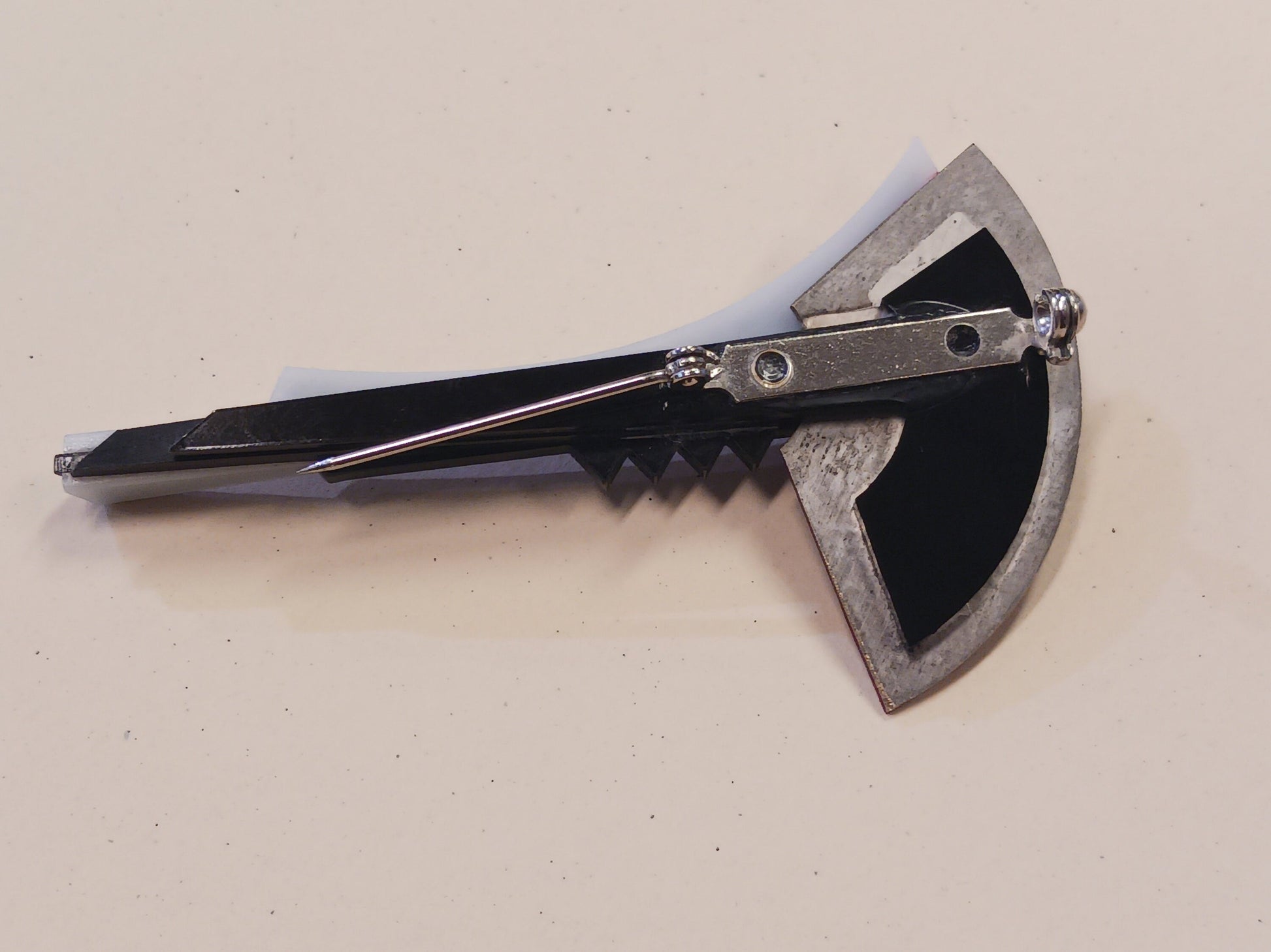 This is a large and truly unique plastic and acrylic Art Deco style brooch. The brooch is 3" long and composed of separate pieces of black and white plastic, each carved into geometric shapes, then layered into a design. At the top of this complex base is a fan-shaped topper of reflective red, which has a subtle pattern of squares and swirls. The brooch is in overall good condition. The pin on the back is fully functional. This terrific mid-century modern brooch is a large statement piece, ready to please the next owner.