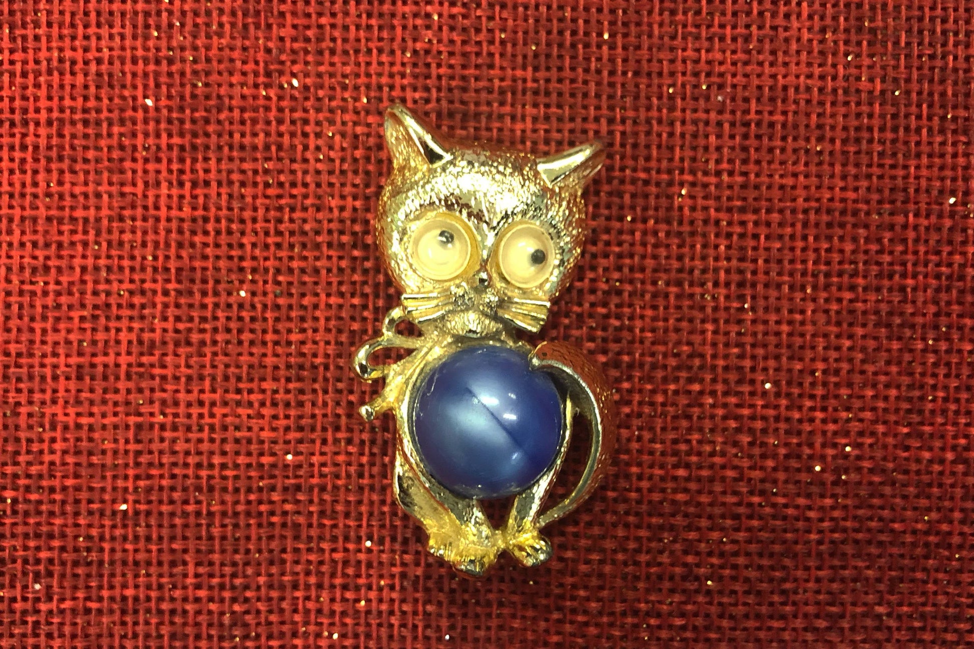 Blue And Gold Googly Eyes Jelly Belly Cat Pin/Brooch - Vintage