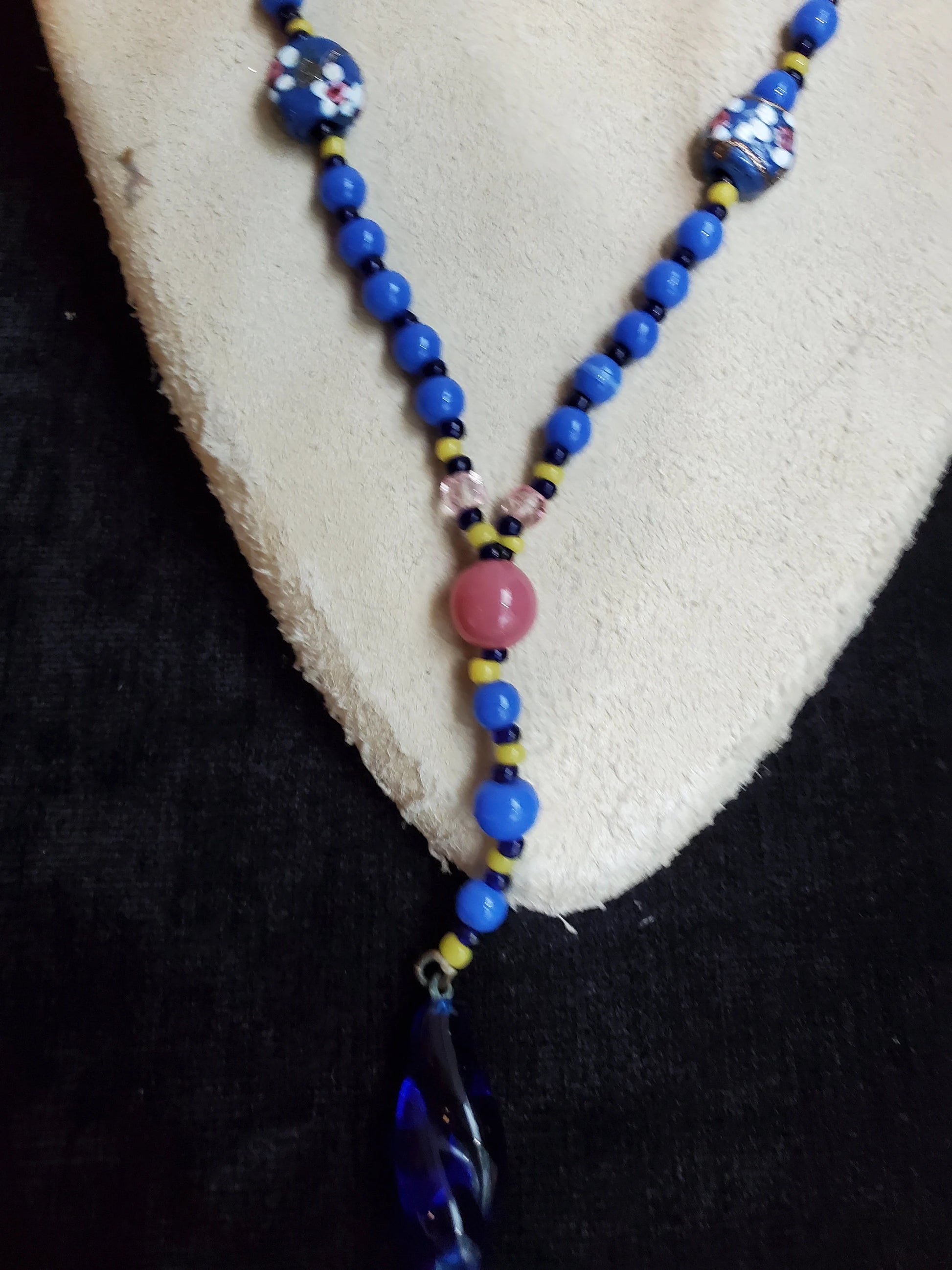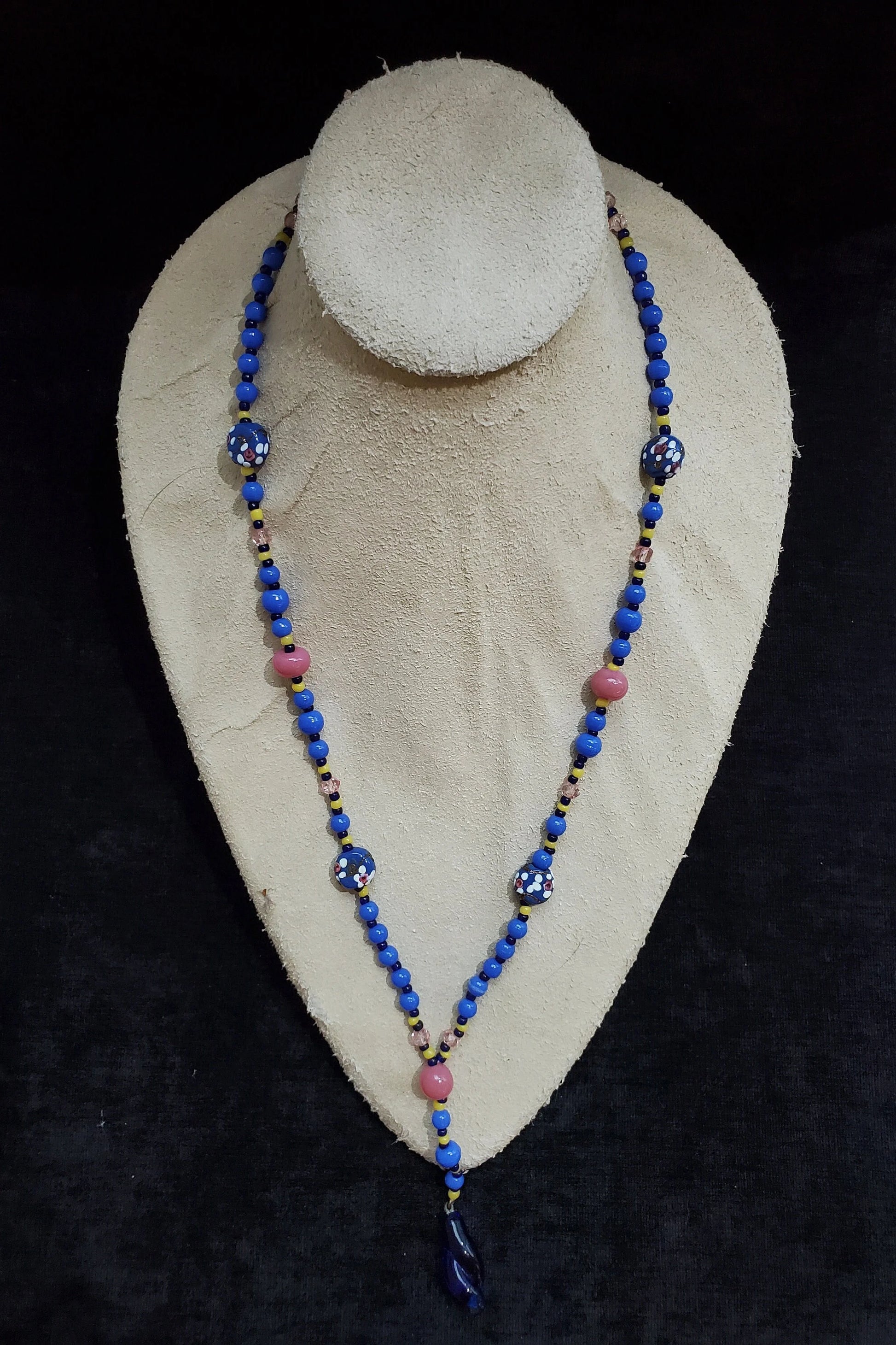 Made with Italian Murano glass beads, at a length that swings with every move, this necklace is a must have to pair with that white summer dress. There is a swirled glass bead pendent at the very bottom of the pink, blue and yellow opaque beads, and interspersed, are four larger beads with floral designs and 4 pink beads. The necklace is in wonderful condition, see photos.