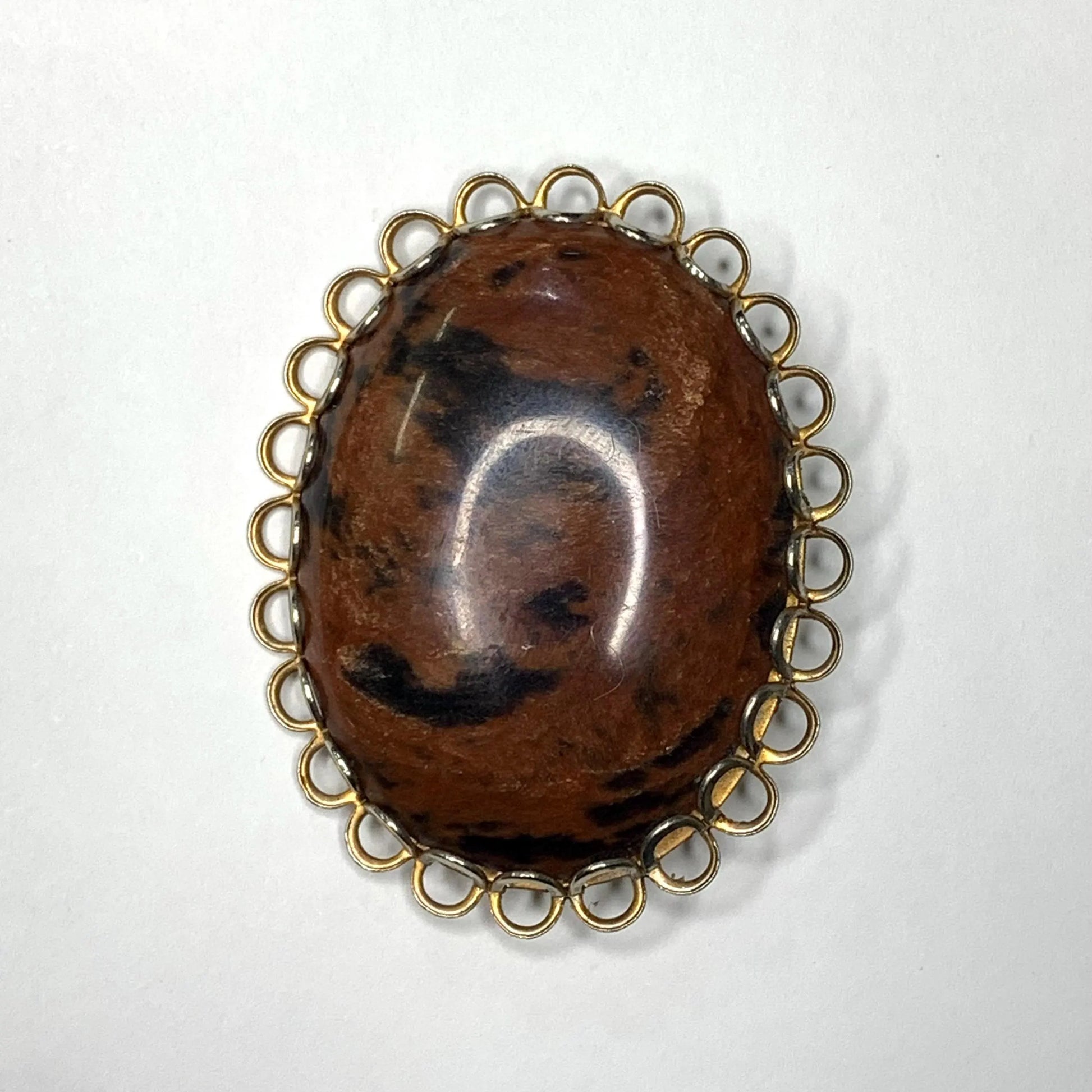 Brown and Black Stone Brooch with Silver-Tone and Gold-Tone Border