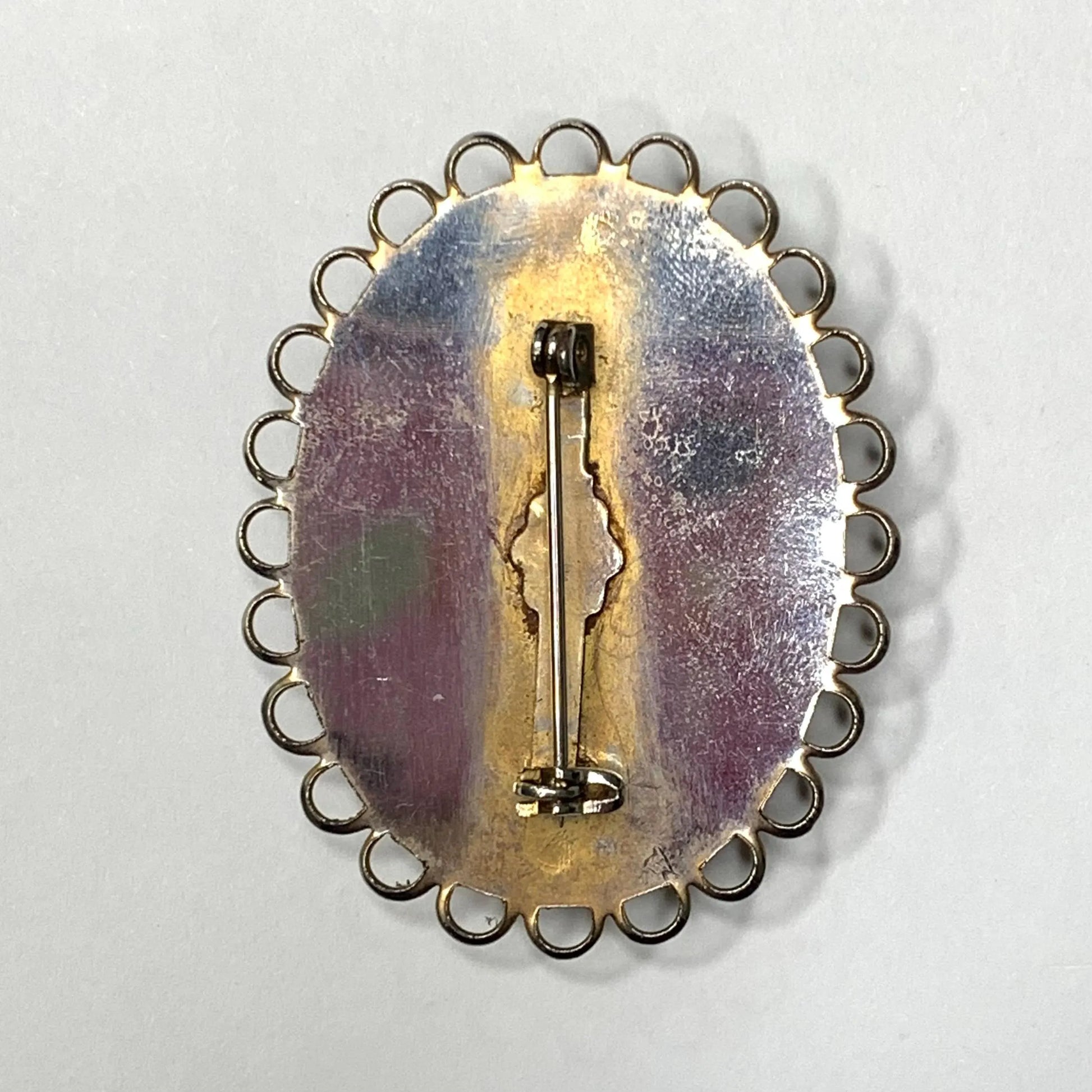 This pin is the perfect addition to your favorite black jacket. The black and brown pattern of the stone makes this pin an excellent way to add some interest and detail to any plain black top. The piece is in excellent condition with no marks or scratches.