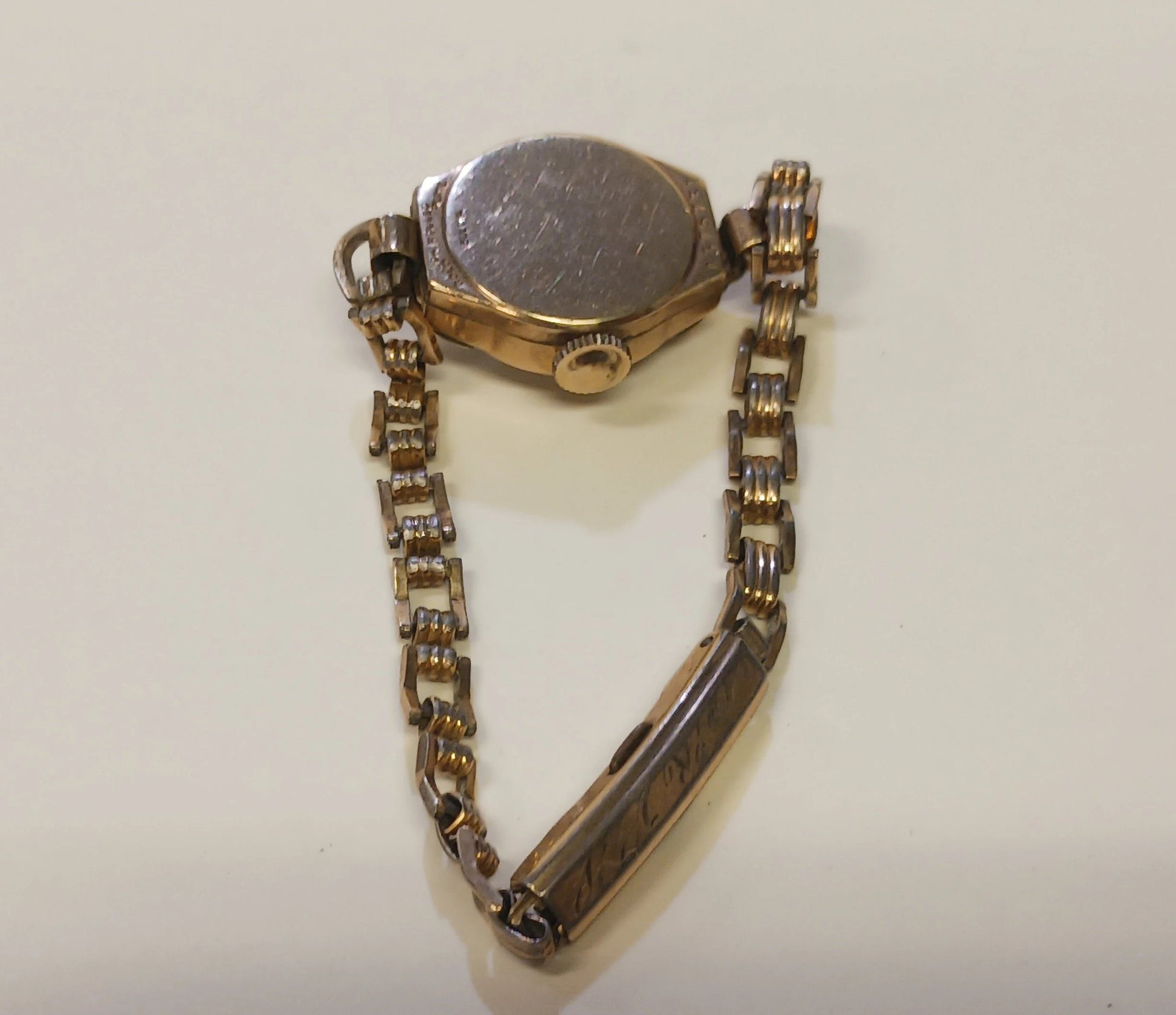 This lovely vintage 1940s ladies watch was made by the Bulova company! Established in 1875 and still existing today, Bulova has made their company name famous, by producing high quality watches and jewelry. The watch, itself, bears the Bulova name on the face and is marked 10k rolled gold plating. The Watch has a dial along its right side, which has limited functionality. The watch chain may not be the watch's original chain, as it is 12k gold filled and has various engravings on its clasp (appears to be a name and possibly a date, as maybe was gifted to the person) the inside of the clasp reads, "1/20 - 12k Gold Filled, R/R, PAT. 1. 786. 945. MADE IN U.S.A." The outside reads, "MR VP." Watch band is only approximately 7in around - definitely intended for petite wrists. The watch is not functional, but was well cared for, thus, repair is definitely possible. Gold plating, generally is warrantied for only about 5 years of daily use. The gold plating on this watch is still in great condition some 75 years later.