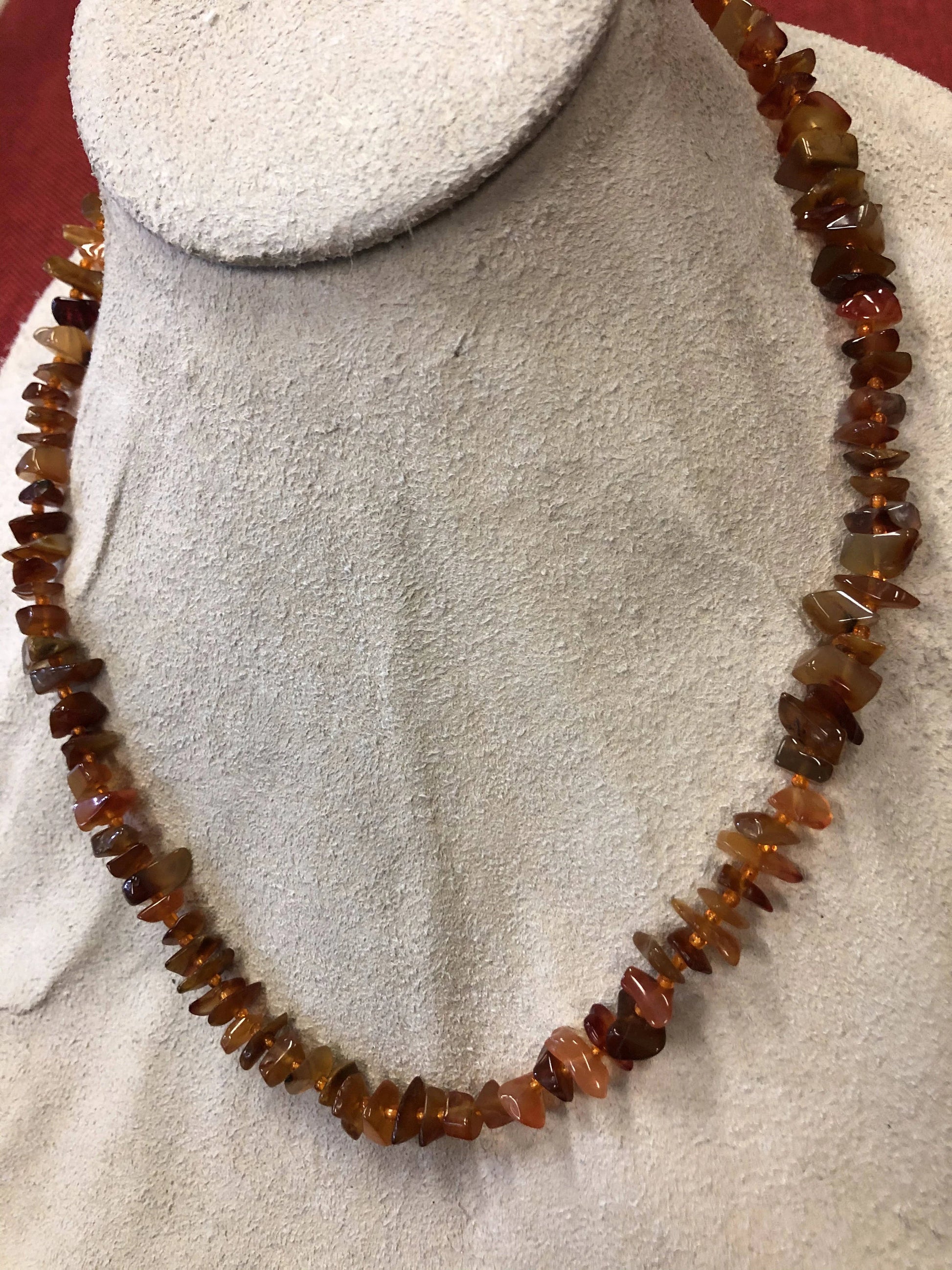 This vintage Carnelian chip necklace is made of red and tan agates separated by small glass beads. It is a beautiful necklace would be an is an excellent addition to those who collect natural stone jewelry or for those who love nature. Fits perfectly with down-to-earth, neutral colors and natural material.
