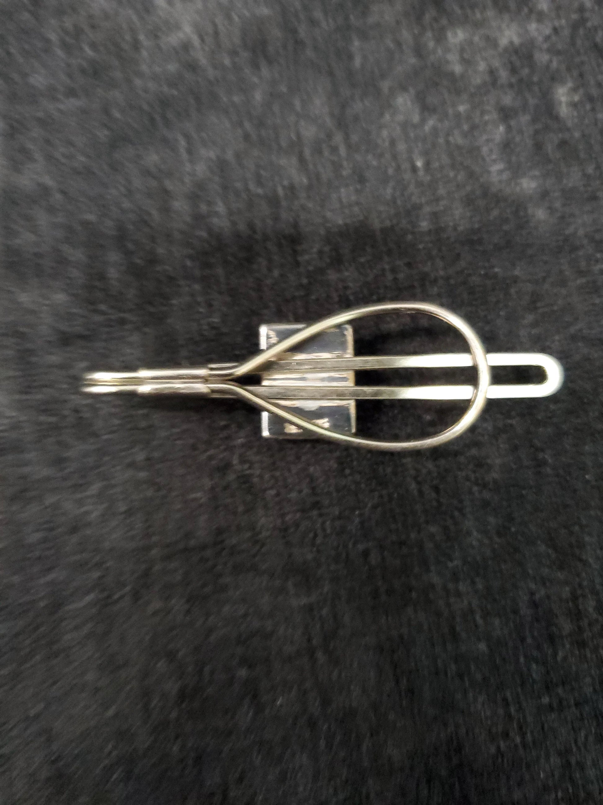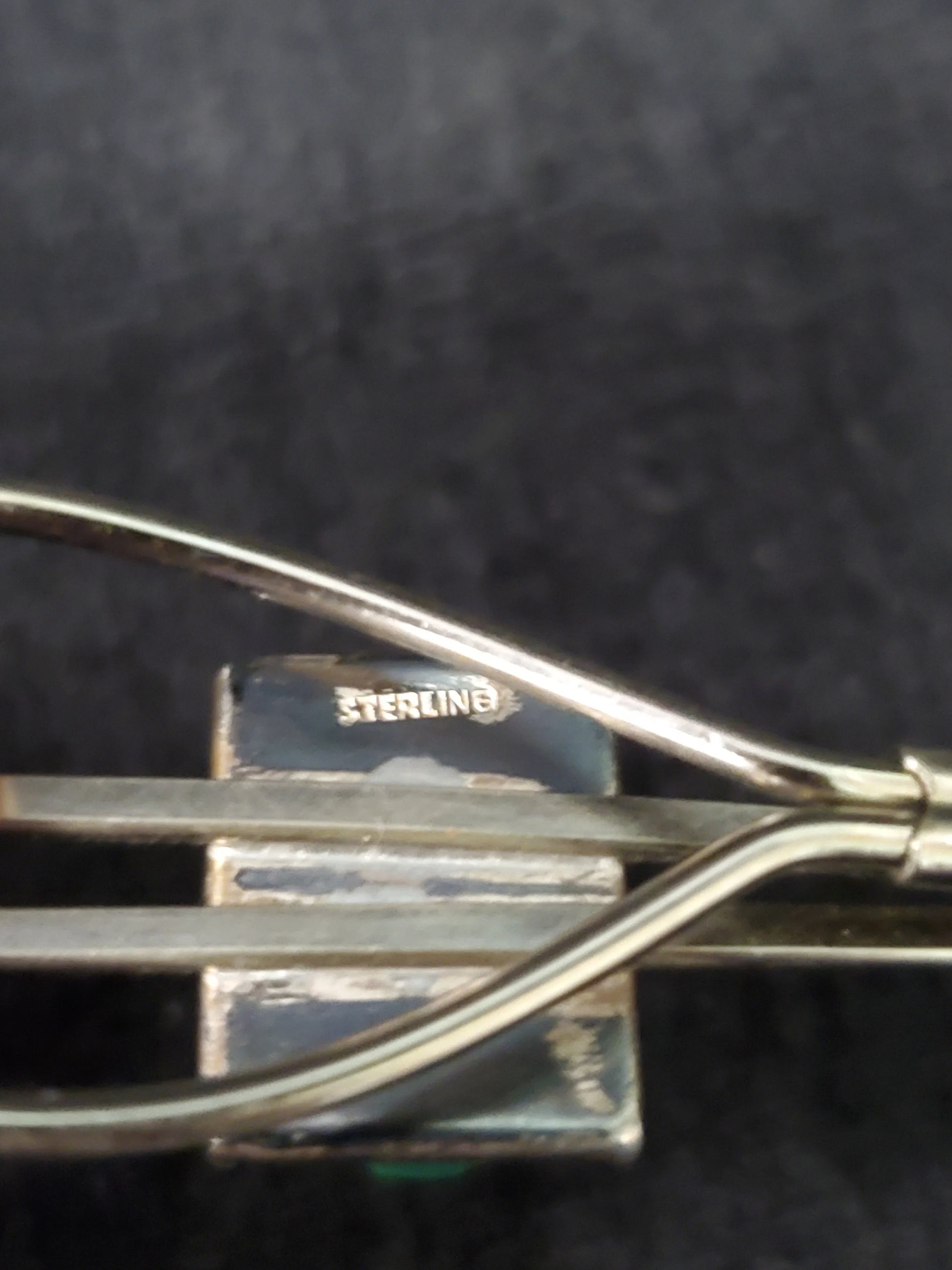 Sterling silver with a carved Jade setting, makes this is a super cool vintage piece. The Jade appears to have a mask design carved into it. This would look fantastic on the black or camel colored tie. If you like vintage tie clips do not miss this one. It is definitely an eyecatcher!