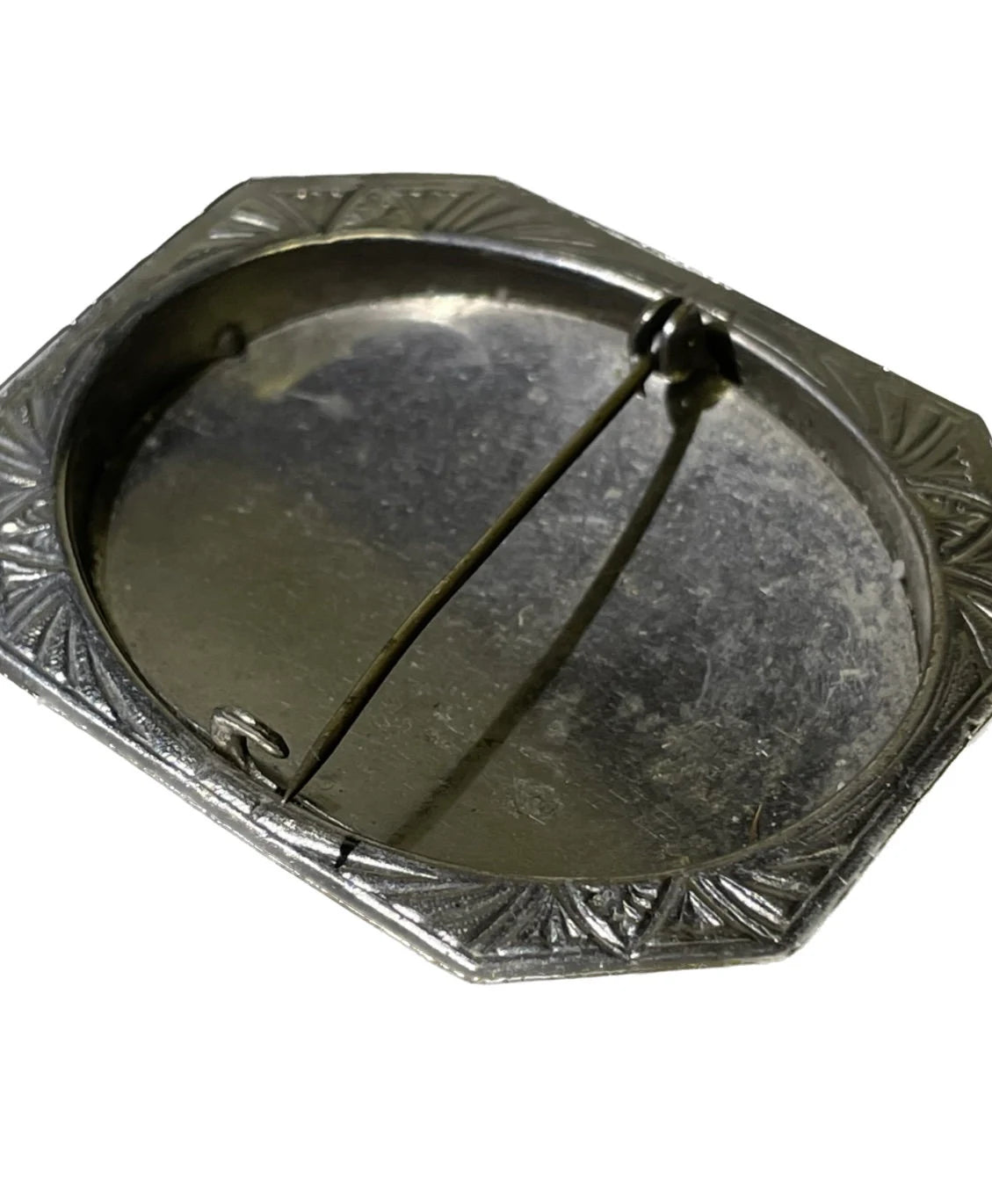 This fabulous and rare brooch features a faux shell cameo, which in reality is molded celluloid with a celluloid painted background. It is very unusual as it has two rhinestone settings. The rhinestones represent the Victorian woman's earring and necklace. The metal surround looks to be tin, and has no marking. It is elegantly embossed to capture the Victorian era style of cameo, and most likely produced between 1875 and 1890. The brooch measures 2" x 1.5" with a C-clasp pin.
