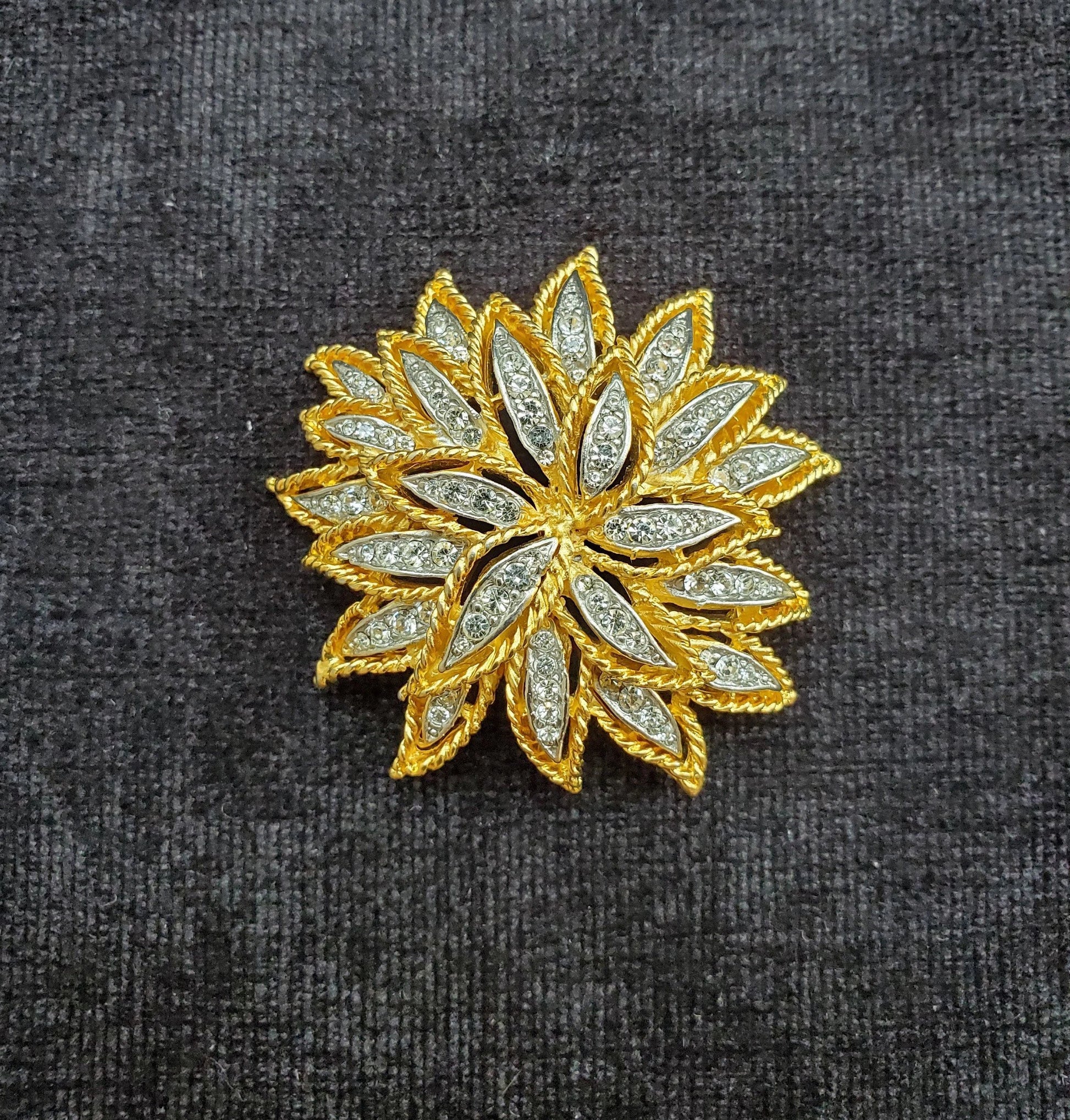 Chrysanthemum Pin or Brooch, Gold tone with Pave Crystal Stones