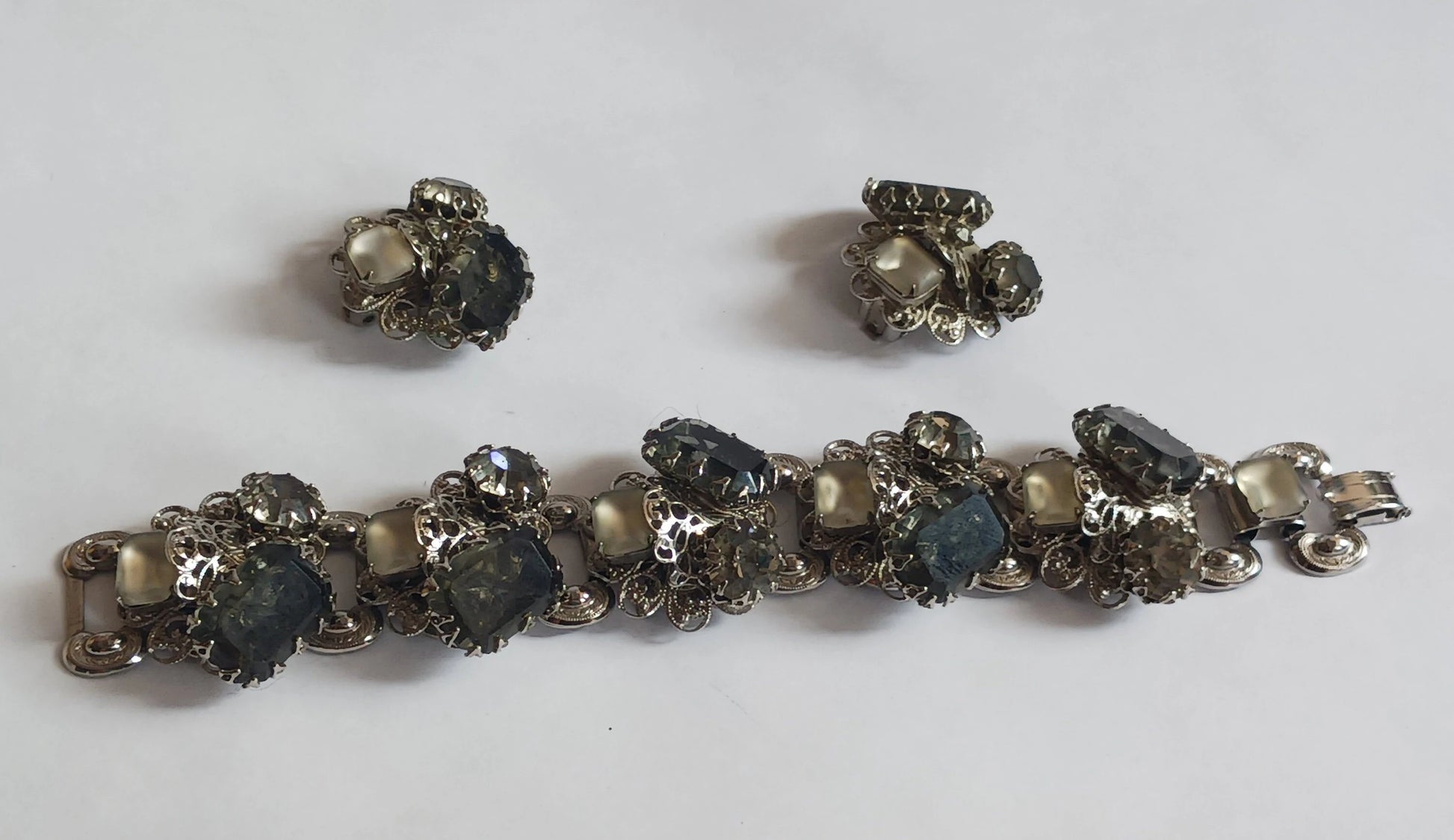 This listing is for an adorably chunky jewelry set in grayscale tones - perfect for just about any kind of outing. The set includes a silver filigree and rhinestone bracelet with matching earrings. The bracelet, including clasps, measures just under 7.5in in length, with each earring being 1in in diameter. Neither the bracelet nor the earrings are missing any stones, but both do show signs of wear and adhesive residue (see photos). A thorough cleaning with rubbing alcohol or hand sanitizer would remove the adhesive and make this set ready to wear.