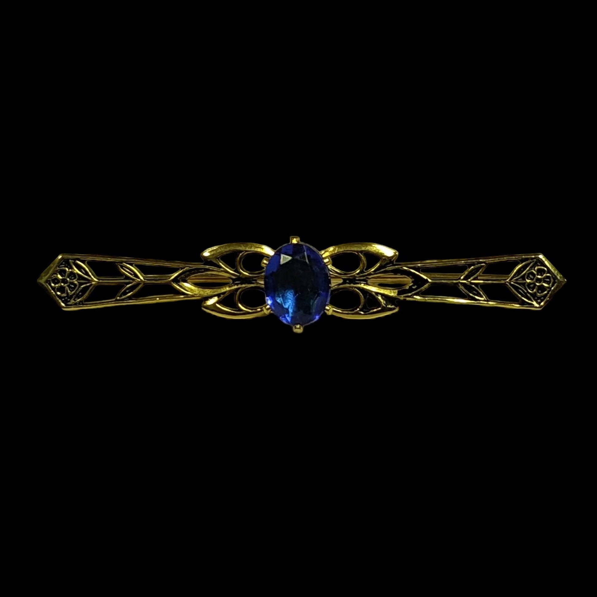 This piece was made in the 1940s, most likely, as a copy of a Victorian collar pin. The original Victorian pin, would have been 14k gold, with a Sapphire Stone.