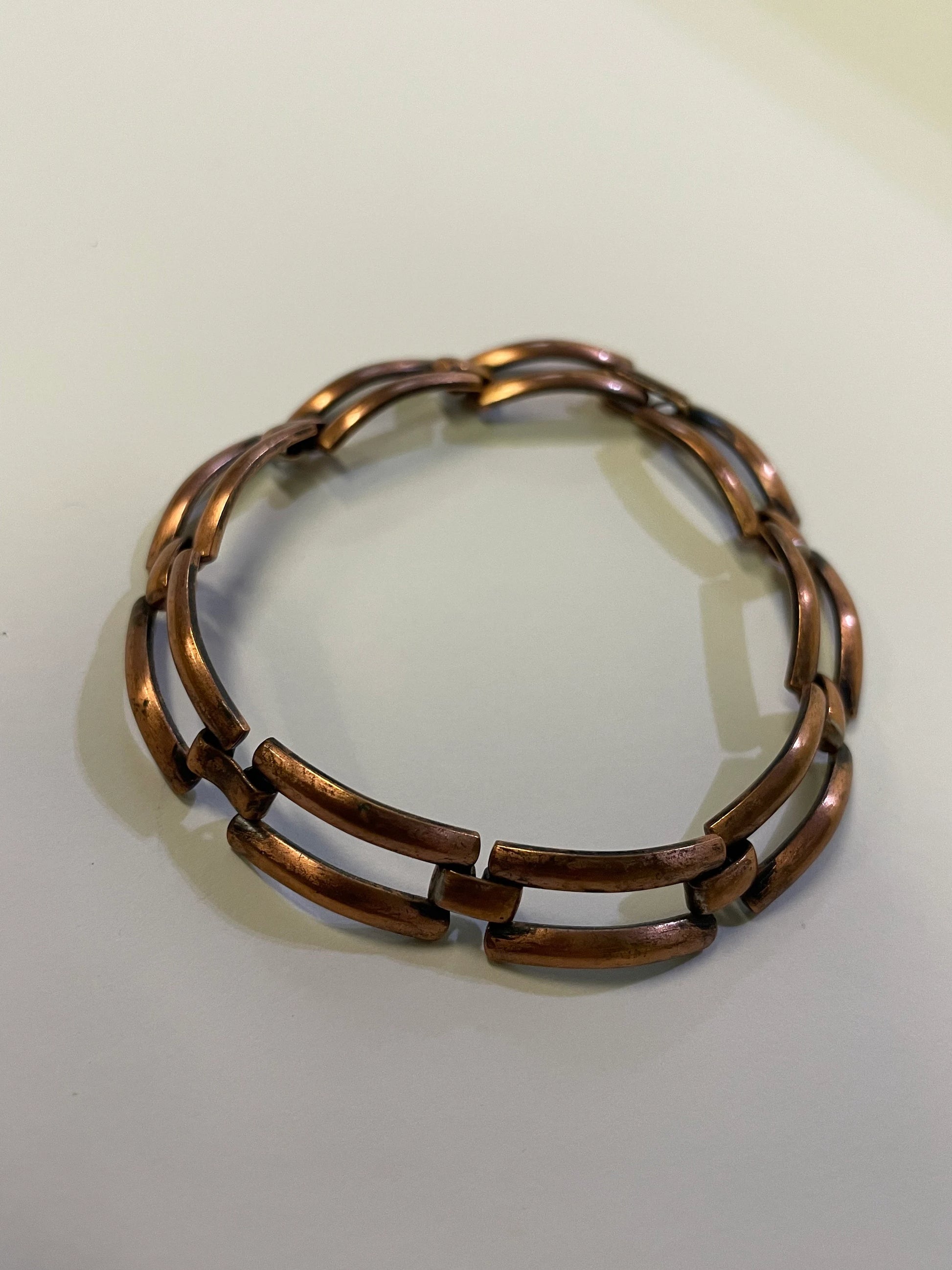This wonderful bracelet would be a great gift or addition to any vintage jewelry collectors! The bracelet measures 7.5" long when unlinked, and has a diameter of around 2.5". This jewelry unclasps very simply and traditionally. It looks great when worn and if you believe in the health benefits of wearing copper, it is a good addition to any wardrobe. The bracelet is in very nice vintage condition, with only small sins of former use, and ready to add to any outfit.