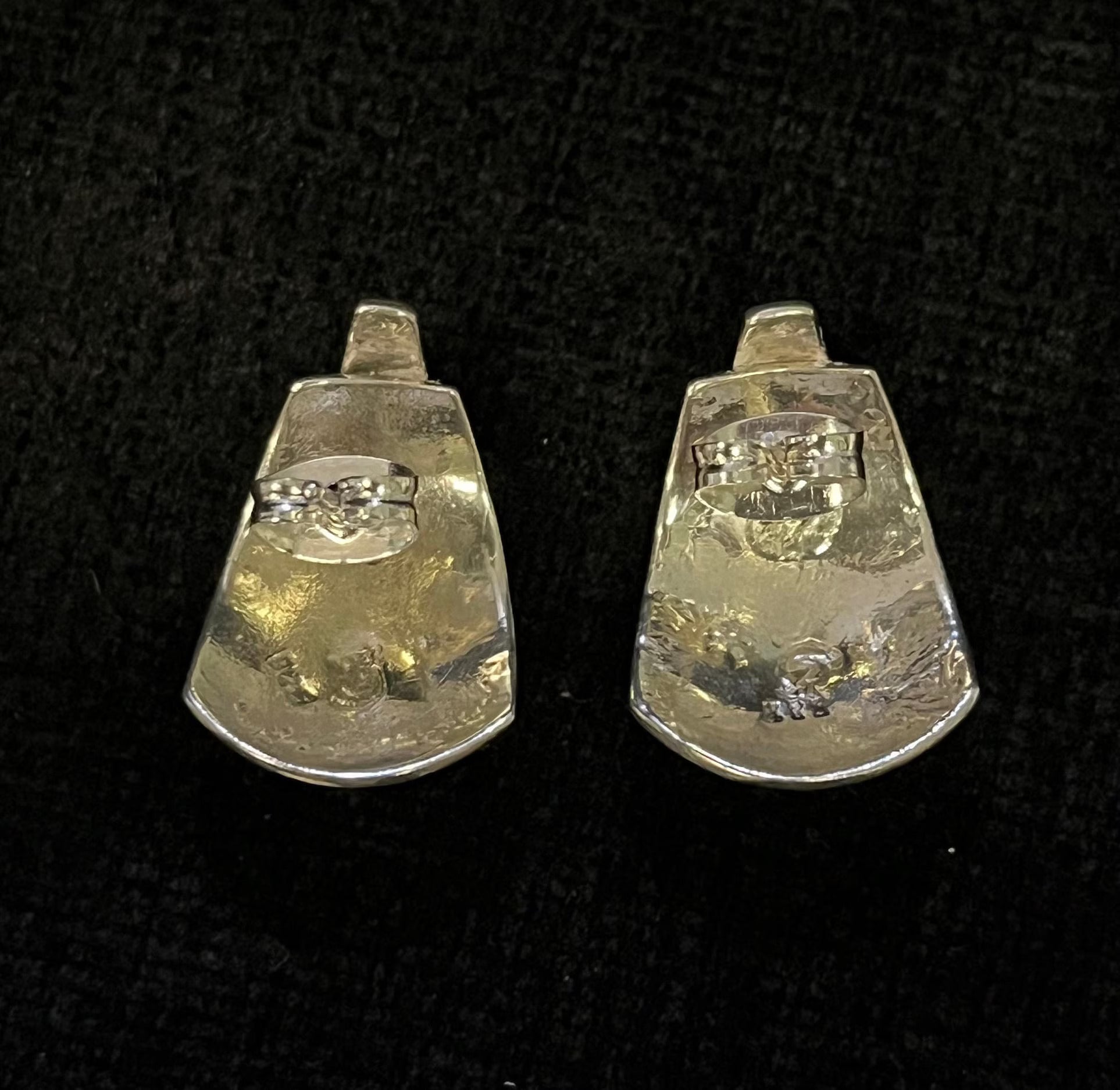 If you are a horse woman at heart, or love the Western look, complete with hat and boots, these simple silver curved earrings with a small hammer edge, may be for you. With their minimalist design, and sleek silver finish, they exude a timeless charm, which may compliment your style. The gentle curvature adds a subtle touch of sophistication, plus it makes them versatile enough for workday wear, when larger earrings maybe too much. Girls working with horses need to be able to quickly react, they cannot worry about their jewelry being an issue. A perfect pair of earrings to wear while working, but also, to carry the busy woman into the evening. They are in very good condition, and a soft tooth brush and little toothpaste keeps them looking beautiful.