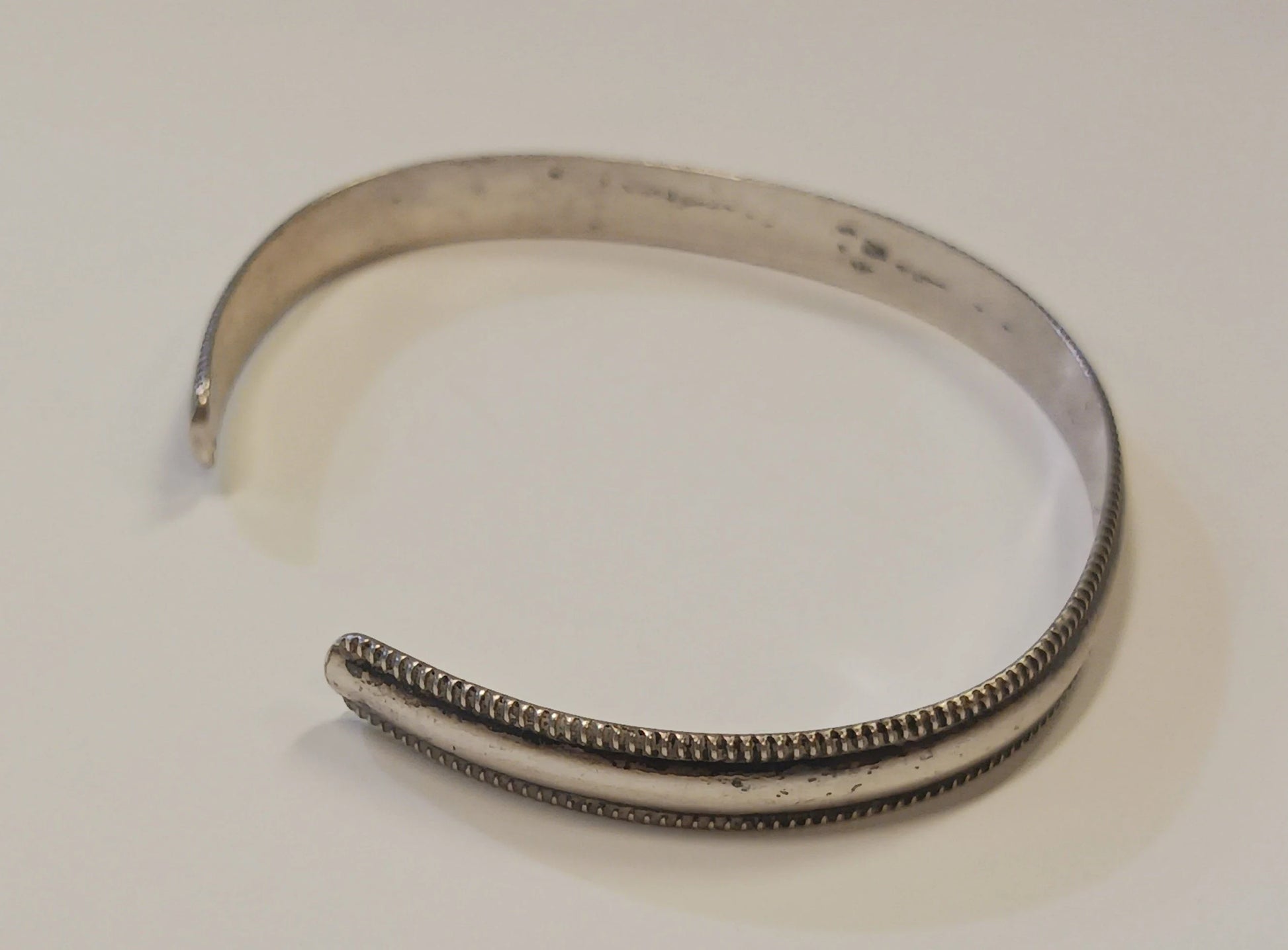 For sale we have a beautifully simple sterling silver bracelet. The band of this piece has a lovely, subtle charm with light braiding for the borders, but an otherwise flat design. This bracelet is quite small, with a width of only 2.25in, but it can be adjusted slightly with a gentle pull to the sides. The left, inside edge of the bracelet is stamped with the word, "sterling," to authenticate it further. This piece is in great condition and could be worn right away, but it does show some signs of discoloration expected for its age (see photos).