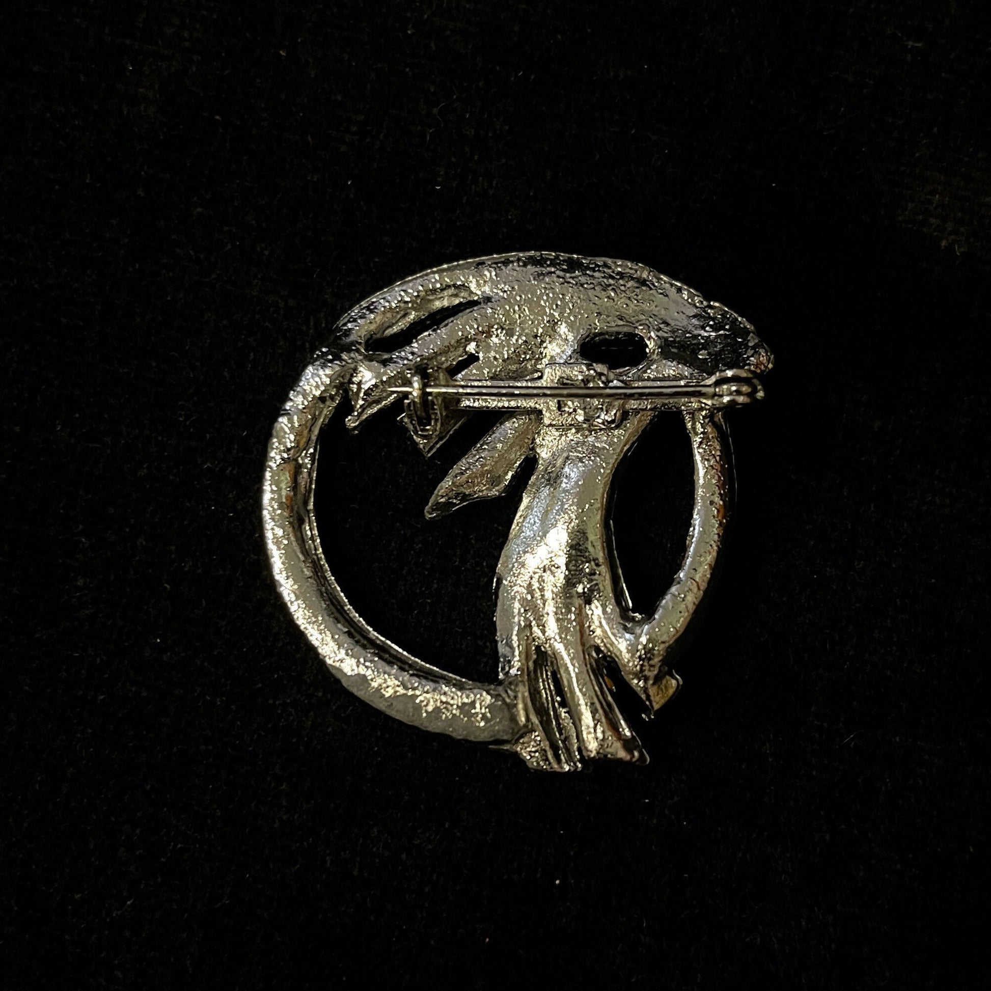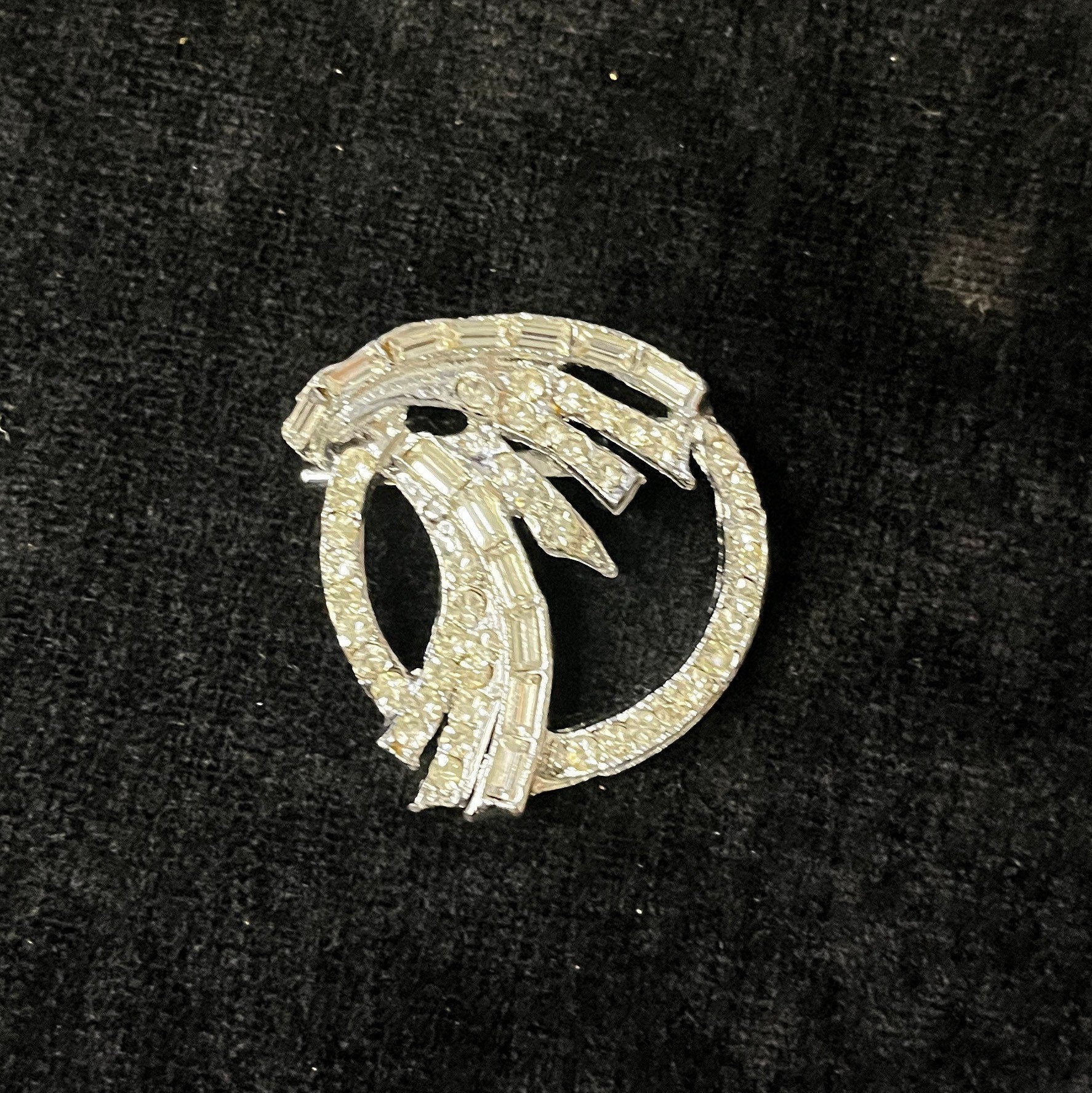This circle brooch is beautifully covered in rhinestones of several shapes and glitters beautifully in the light. The circle is closed around beautiful downward sweeps of the silver toned crystals. All the stones are still nicely set, even though is from the 1940s. This would be perfect for a wedding to hold the veil or add to a special hat for the holidays.