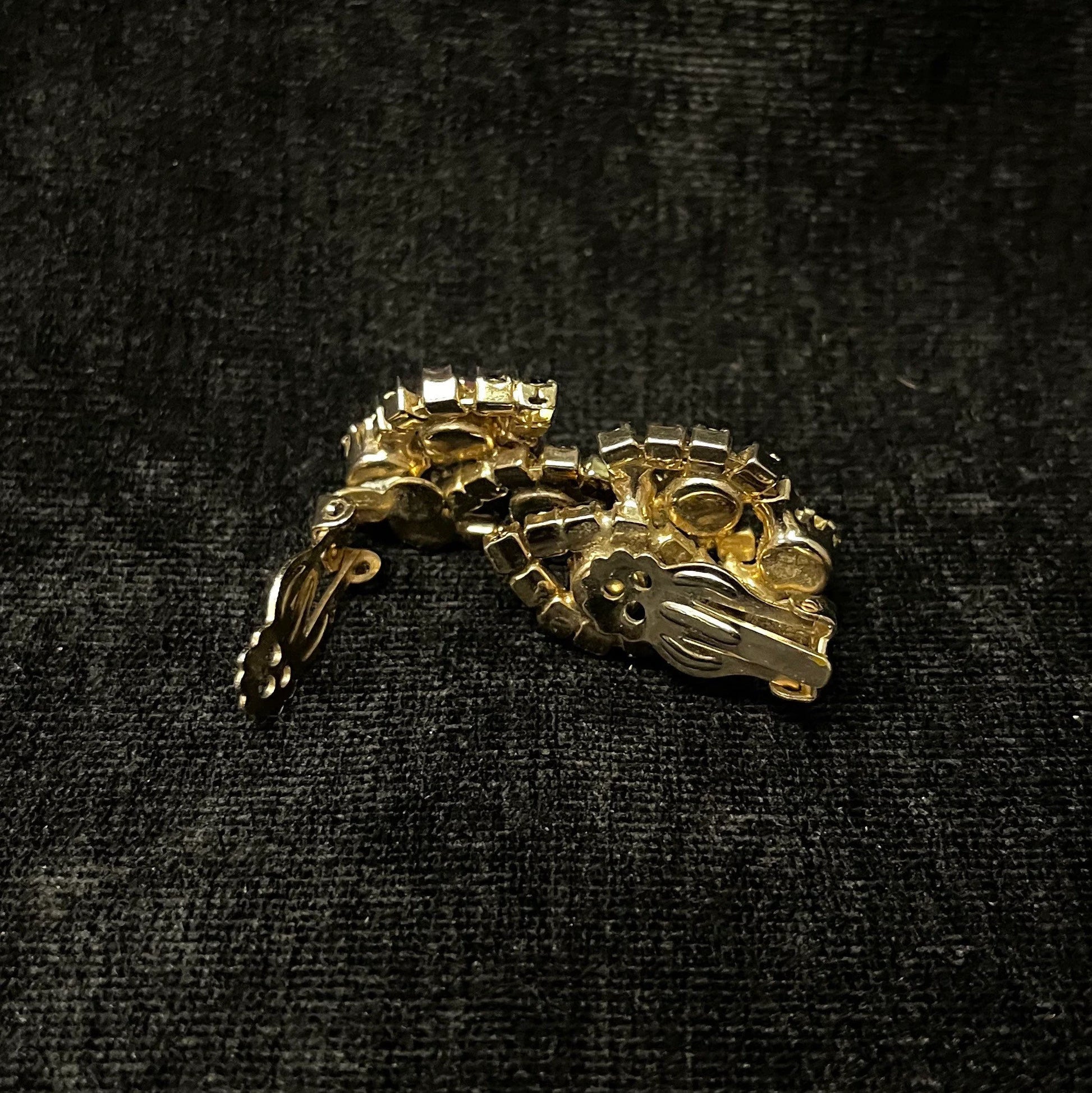 Are you looking to add some statement jewelry to your collection for evening or fancy dates? This pair of fabulous ear rings is for you! These beautiful Red and Pink Crystal Aurora Borealis Rhinestone earrings are clip ons from the 1950s. They do not have a Makers Mark, but they are quality all the way. With the deep almost burgundy red rhinestones set in a leaf shape around one pink toned aurora borealis and a rosey pink rhinestone. These are held together with a small cluster of three rhinestones of one pink tones aurora borealis and two of the rosey pink rhinestones of different sizes.