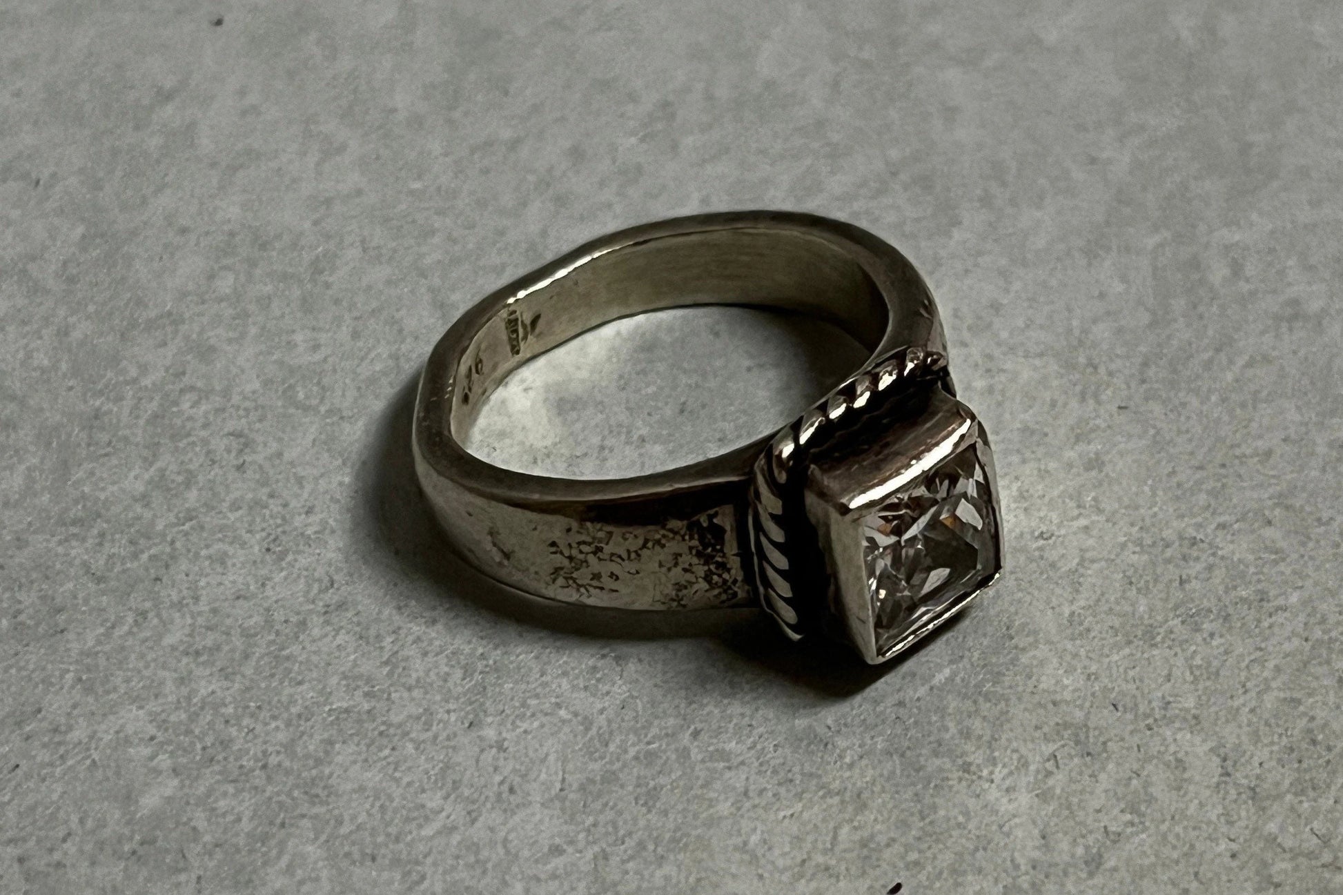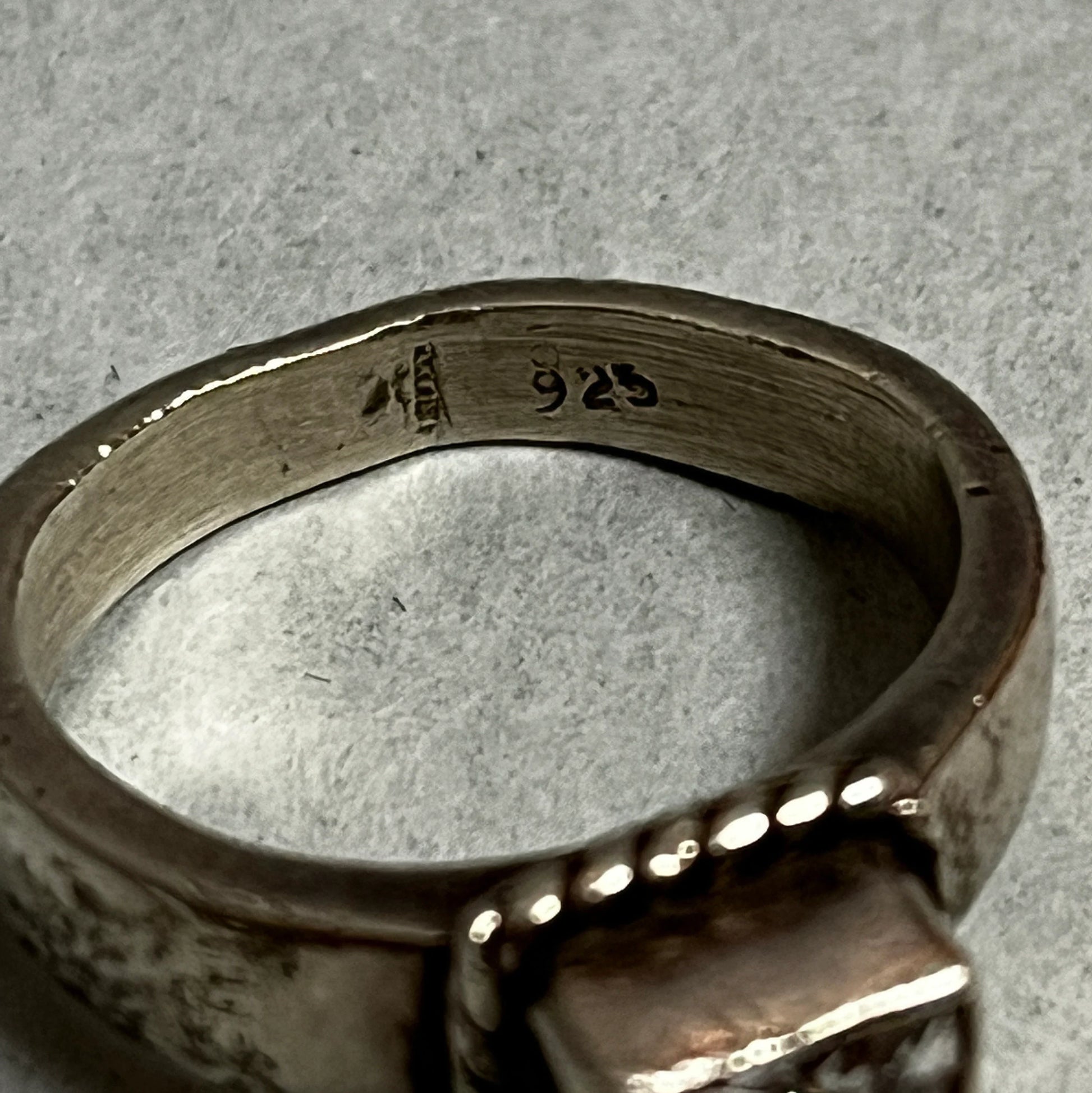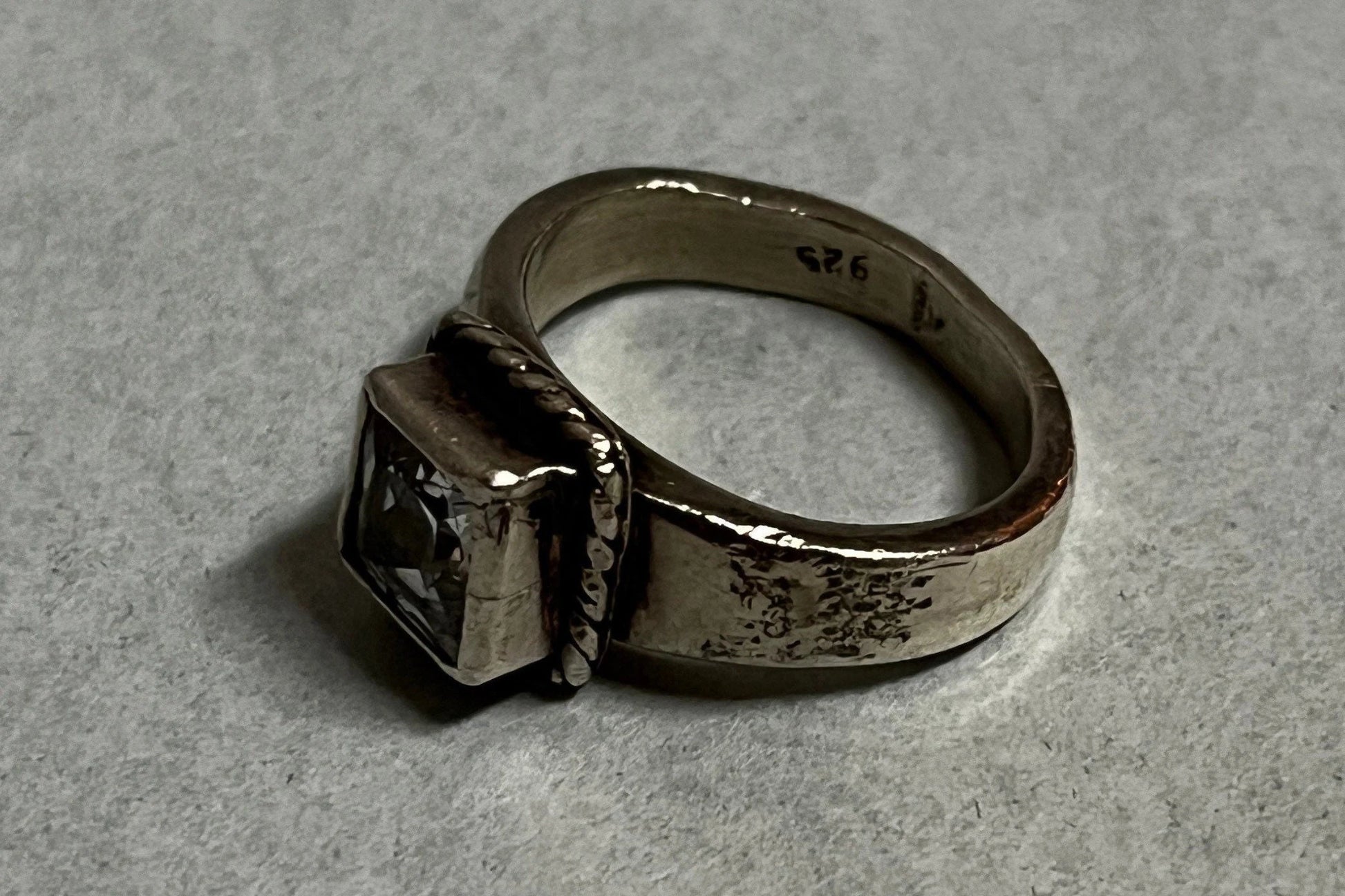 This cubic zirconia ring has a twisted rope sterling silver design around the square setting. Perfect for a Christmas party or something to stand out at an event, this ring could be anything from classy to causal. Paired with a dark dress and simplistic jewelry it would be the center of attention. Paired with other silver rings and jewelry, and jeans and the ring would be a lovely statement ring to tie together a soft glam outfit. The ring has the look of being hand made. The outer shell has the crafting marks when viewed with a magnifying glass.