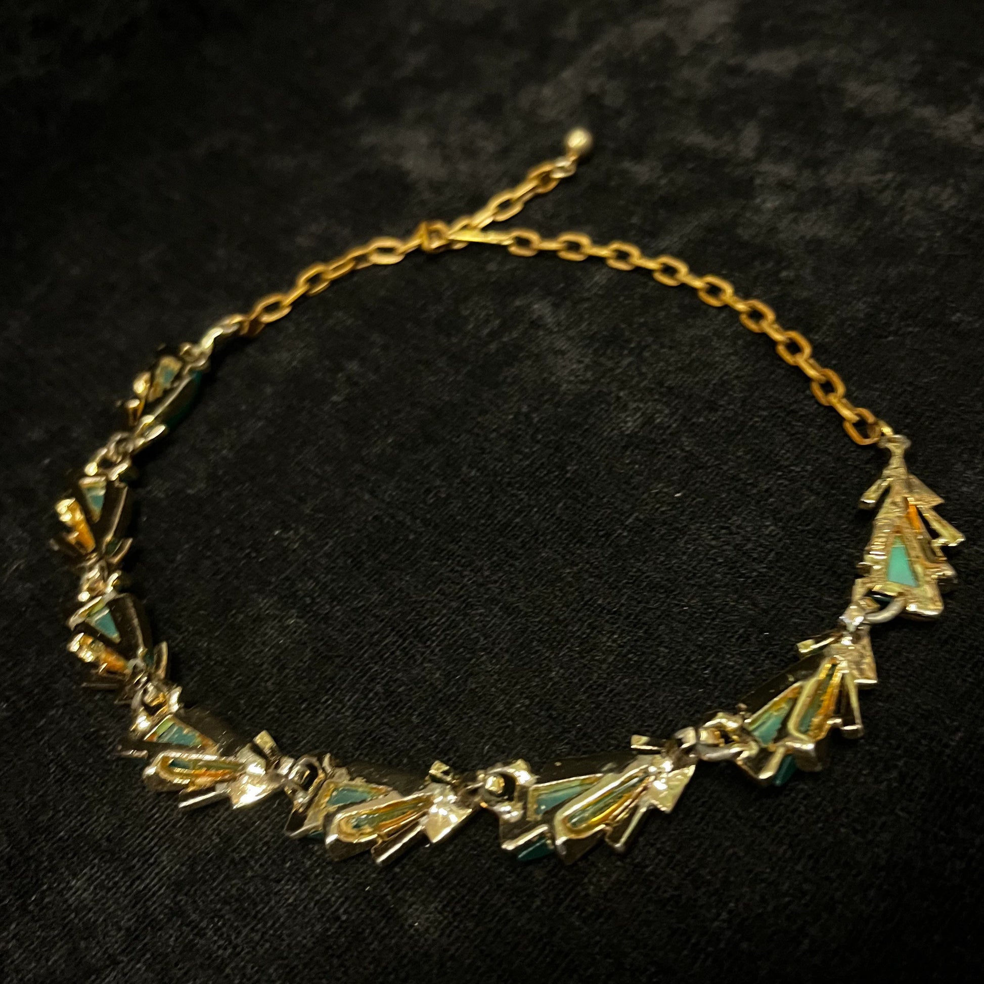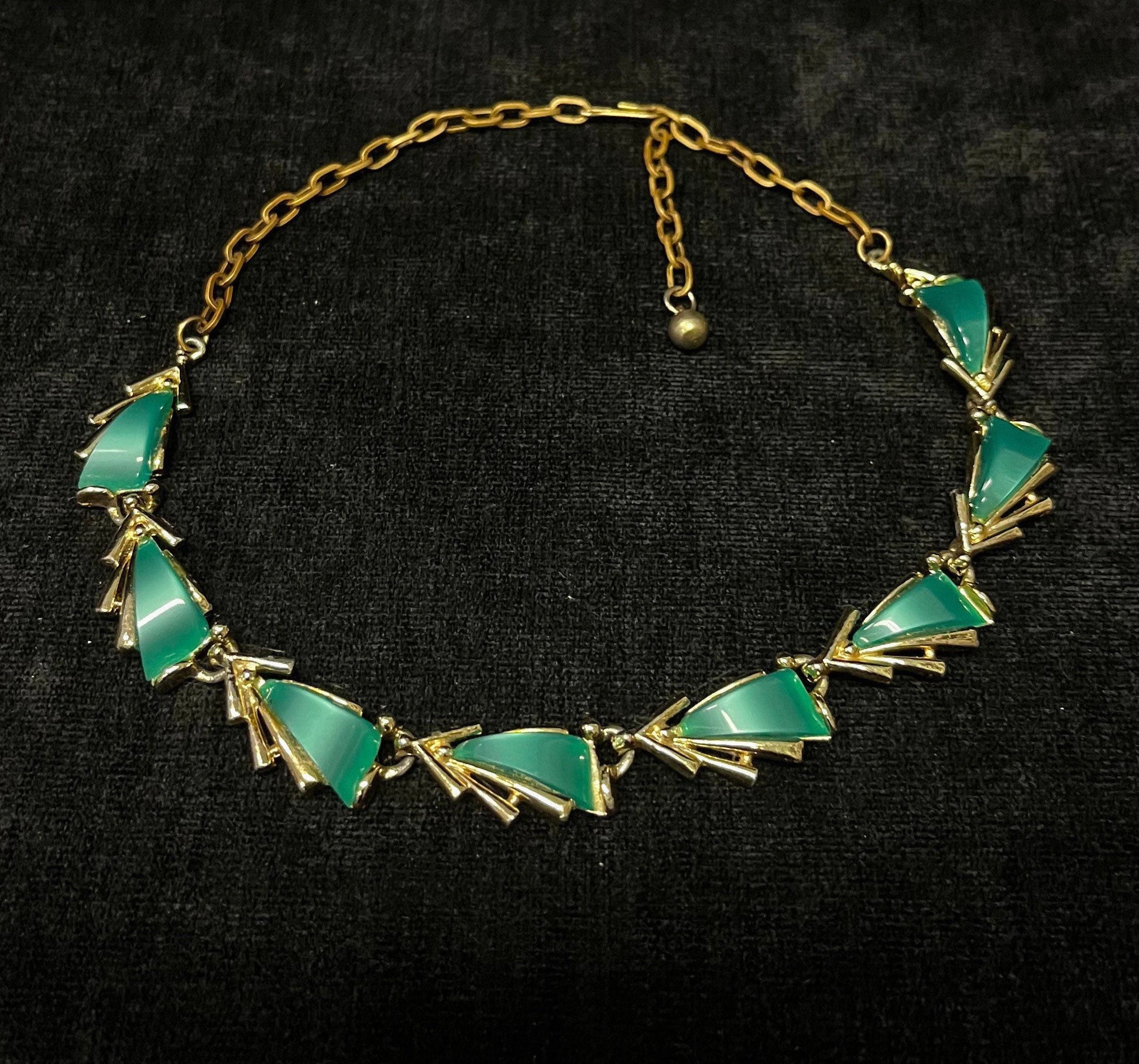 This beautiful choker necklace is short enough to sit right on your collar. The sail shaped Lucite Moon glow green cabochons set with gold tone mountings is truly an elegant look. Th makers Mark is "ART" which was used from after 1955 until about 1970 by Arthur Pepper.