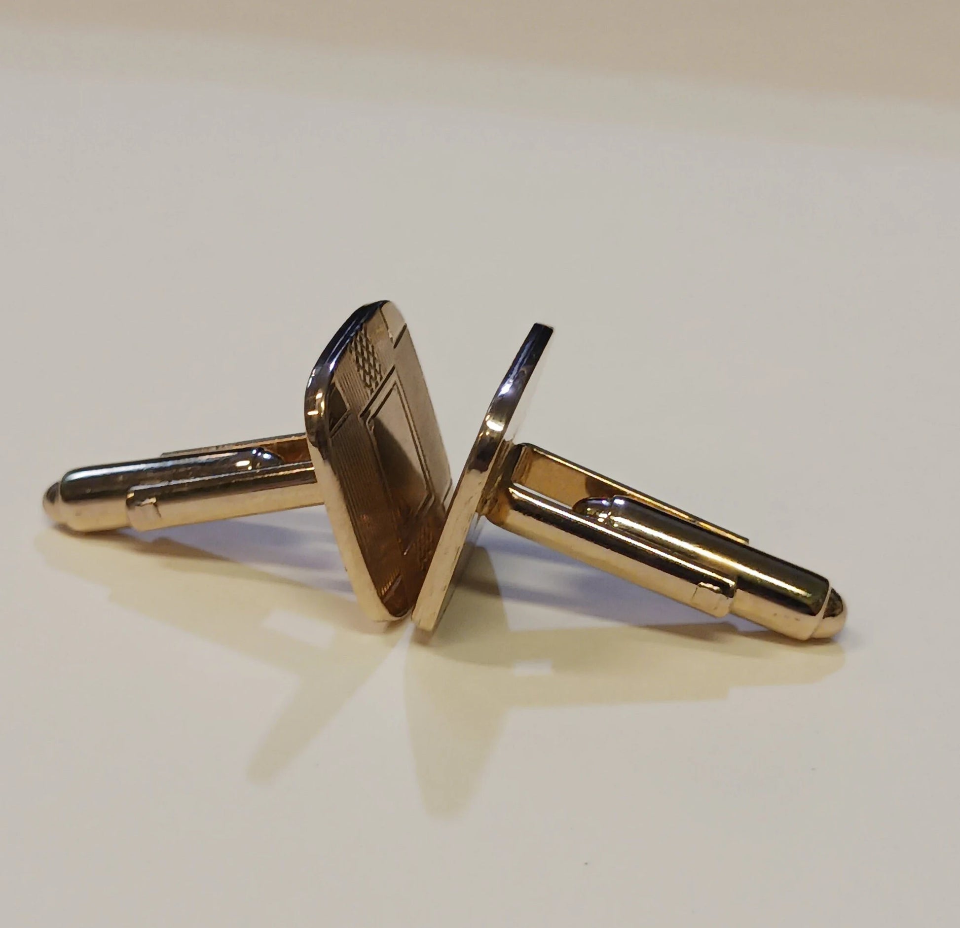 Add a touch of vintage flair to your suit or dress shirt with these Art Deco cuff links. The cuff links are marked "gold plated" and are square with an intricate, geometric design. The face of the cuff links has a pinstripe base pattern, four tiny triangles in each corner, and a large flat rectangle in the center, with a lattice pattern sitting behind it. The faces are a little over half an inch long, with the whole side length of each cuff link being 1.25in. There is no makers mark on them, but they are truly quality. These cuff links are in good condition, with only light wear on the surface, making them ready to wear on day one.