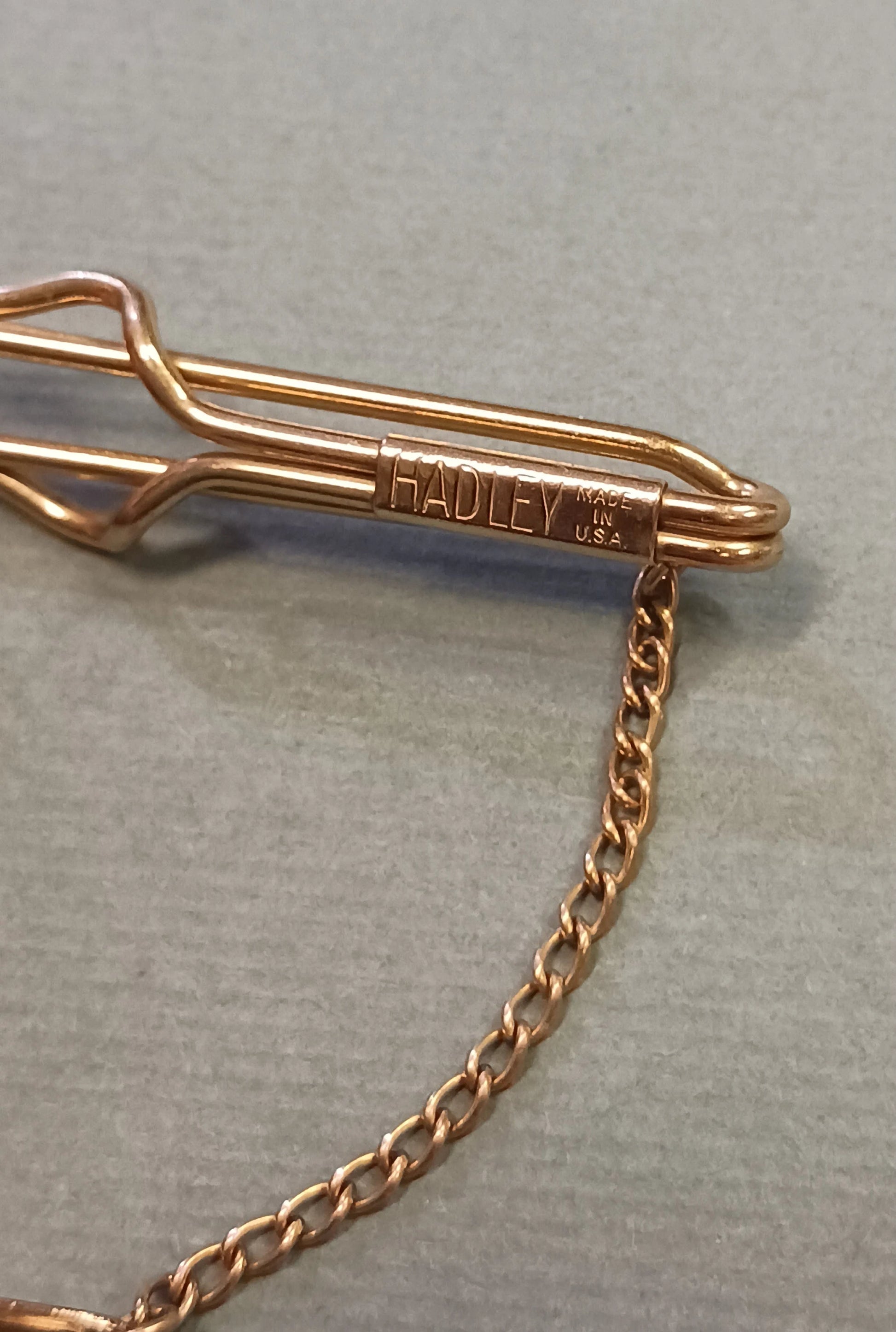 Looking to be the classiest person in the room at the next formal event? Look no further! This gold-tone tie bar is signed Hadley Menswear. At 2.25" in length, this accessory is very stylish. A fine chain hangs from the tie bar, and in the middle of the chain, there is a small gold square, it is a 0.5" pendant with a boxy center that is engraved with diagonal arcs. The back of the clip has the Hadley stamp, as well as made in the United States (see photos). The Clip is in overall good condition, making it ready to wear or giftable on day one. This tie clip screams a 1940 to 1950 look. Be a stylish man!