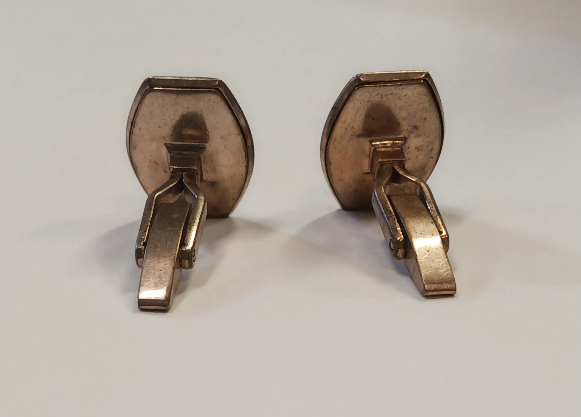 For sale is a pair of vintage, Art Deco style cuff links in gold tone metal, and adorned with oblong, red glass decals. When fully extended, each link comes out to a standard 1.25in length, making them a good fit for most materials. The faces of the links are 0.5in wide and 1in long. The manufacturer of these links is not known, nor printed anywhere on the item, but the Art Deco movement was most prevalent from 1920-1943, before being over taken by the Abstract movement. Given this, these are in very good condition for their age. The links are fully in tact, with no missing parts, the static bars are also fully functional. They do show some signs of age in the form of discoloration (see photos), but these are otherwise very wearable, and would make a nice addition to a formal look.