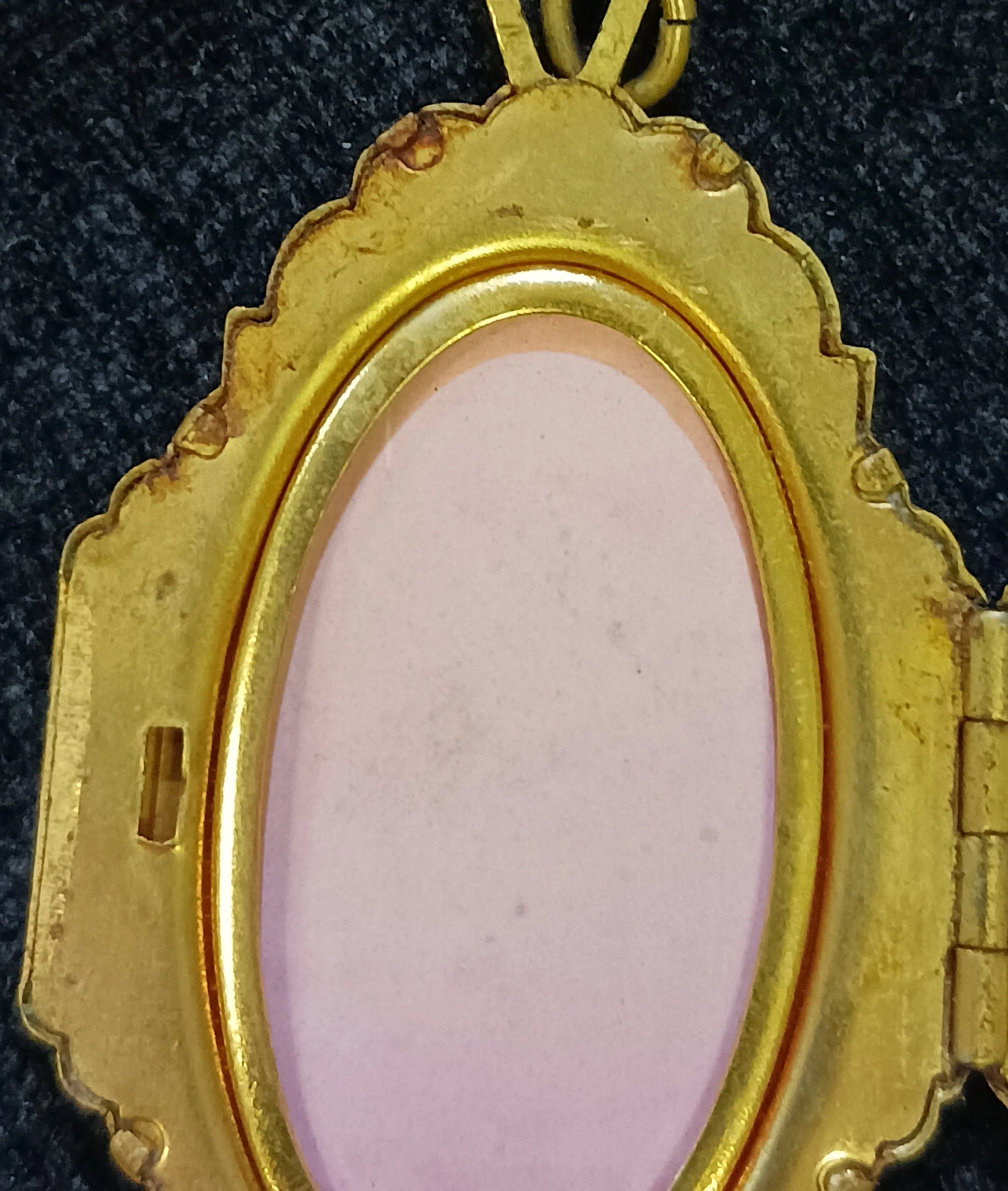Do you have a chain or thin cord that could use a bit of vintage charm? This locket may be just for you! This gold tone, Art Deco style locket is made to hold two tiny photos. It was produced at a critical time in the history of the United States, when 2 World Wars bookended each other. Many couples were split up as the 2 wars raged in Europe, many lost lovers, thus, lockets, such as this one, became very popular to give and receive. The length of this piece is 2.25in, and it has a width of 1.25in when closed (2.5in when open). The hinge and clasp are both perfectly functional, and the insides are padded with pink paper. The locket does show general signs of wear, including scratches and some tint deterioration along the inside (see photos). Despite this, the item is still perfectly sweet, with its face depicting flowers and a heart framed by lace. This could secretly hold a new set of lovers.