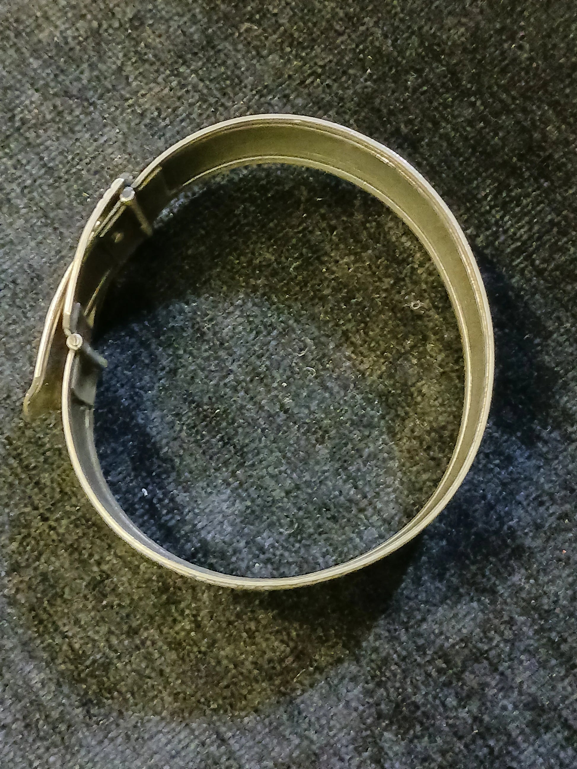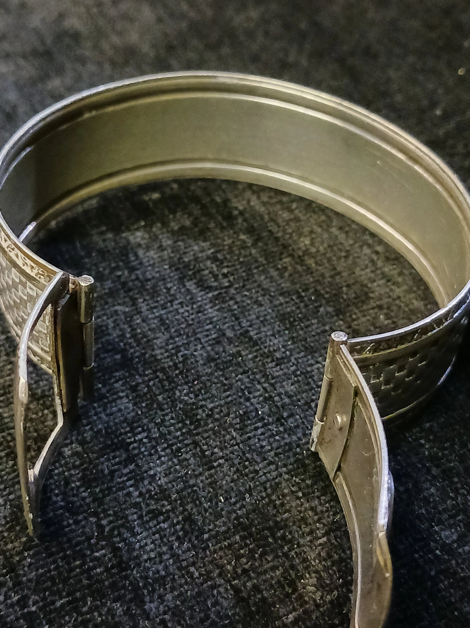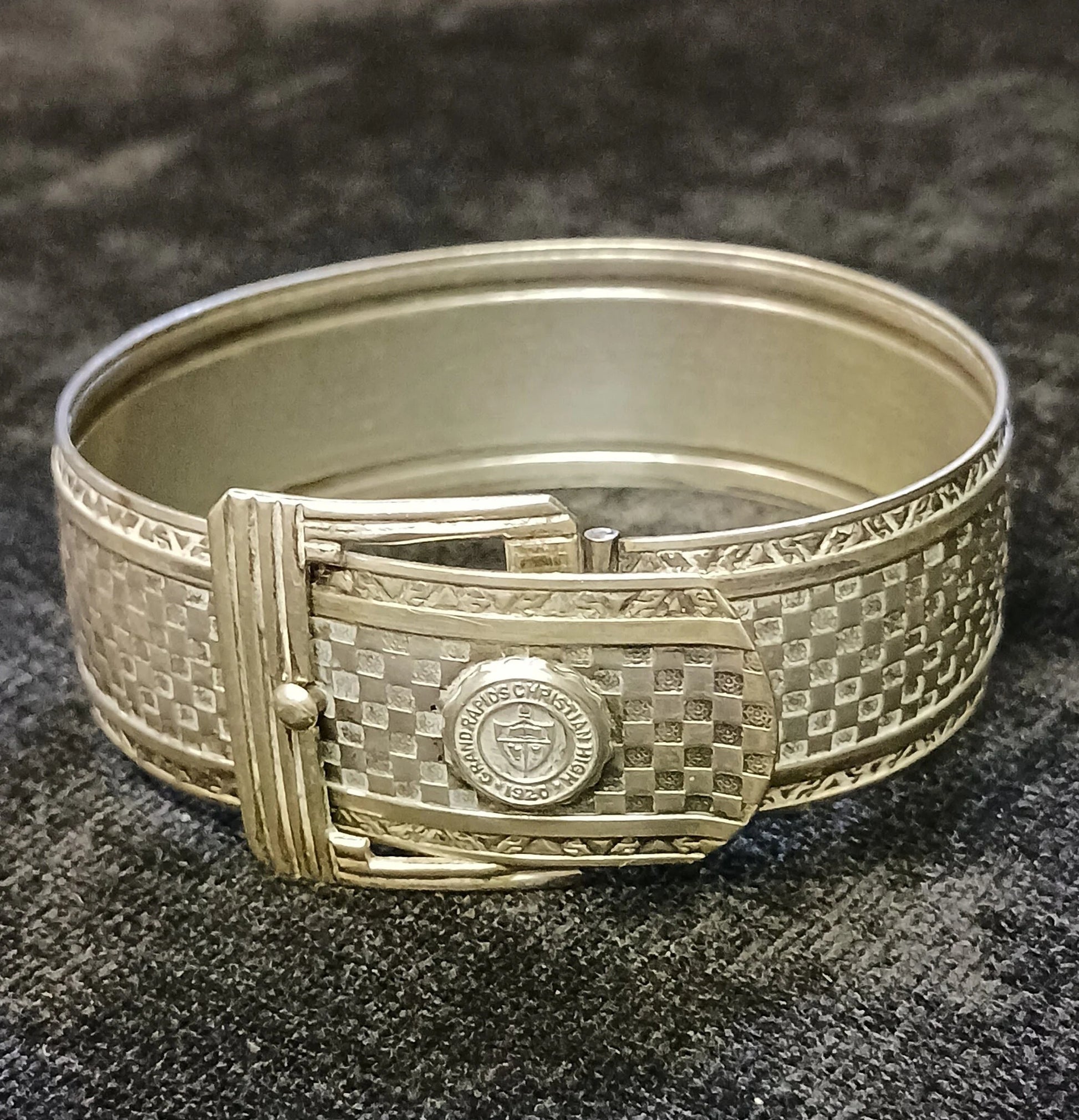 This High School memento is a truly unique piece of Michigan history. The band of the bracelet is in a basket weave pattern, on 0.75in thick silver metal, with a small school crest welded on near the buckle clasp, which states, "GRAND RAPIDS CHRISTIAN HIGH - 1920," the school name, year it was established. Within the clasp, there is also a patent number that reads, "1.899.058." The exterior of the bracelet is a very shiny silver tone with a basket weave core and geometrical borders. The bracelet is a rather petite size. When closed, the diameter is only 2.25in, making this ideal for a smaller wrist. Overall, the item is in good condition with only some tiny spots of discoloration (see photos). If you know someone who went to Grand Rapids Christian High, this bracelet may be for you.