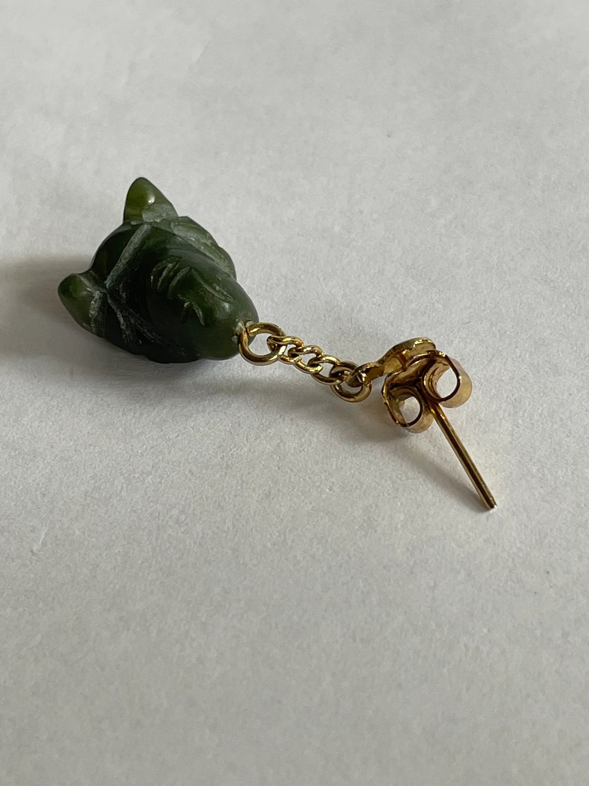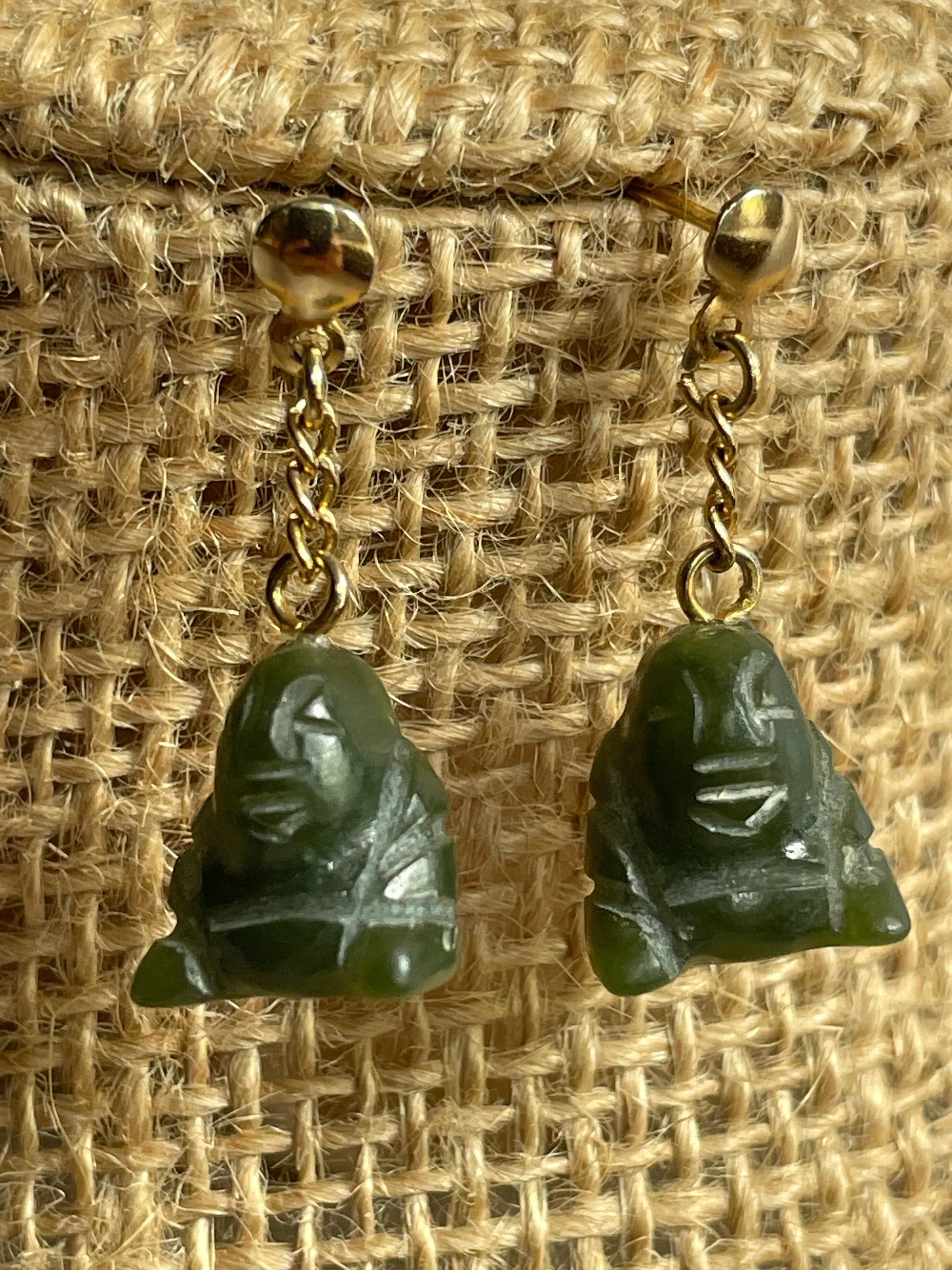 For a simple touch of zen, consider adding these earrings to your collection. For sale is a pair of earrings with gold tone posts, and Buddha carved into genuine jade chips. The jade is cold to the touch, hefty for its size, and shows signs of inclusions and color variations, ensuring its quality. These earrings are in excellent condition, and show minimal signs of age. All this means that these earrings are ready to be gifted and worn.