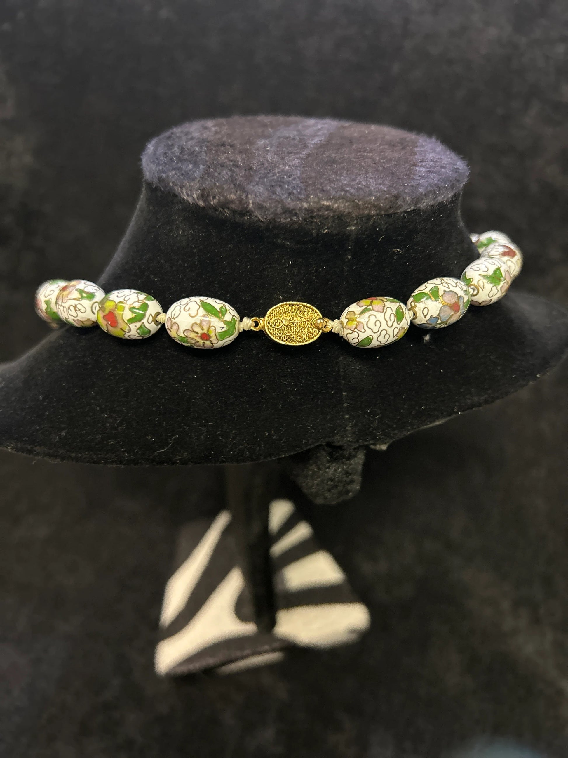 Beautiful Vintage Chinese Beaded Necklace. The beads are made of cloissonned metal. They feature lovely colorful flowers with a gold toned metal patterned inlay and a white background. This necklace is quite long at 27 inches. It has a nice locking clasp that works well.