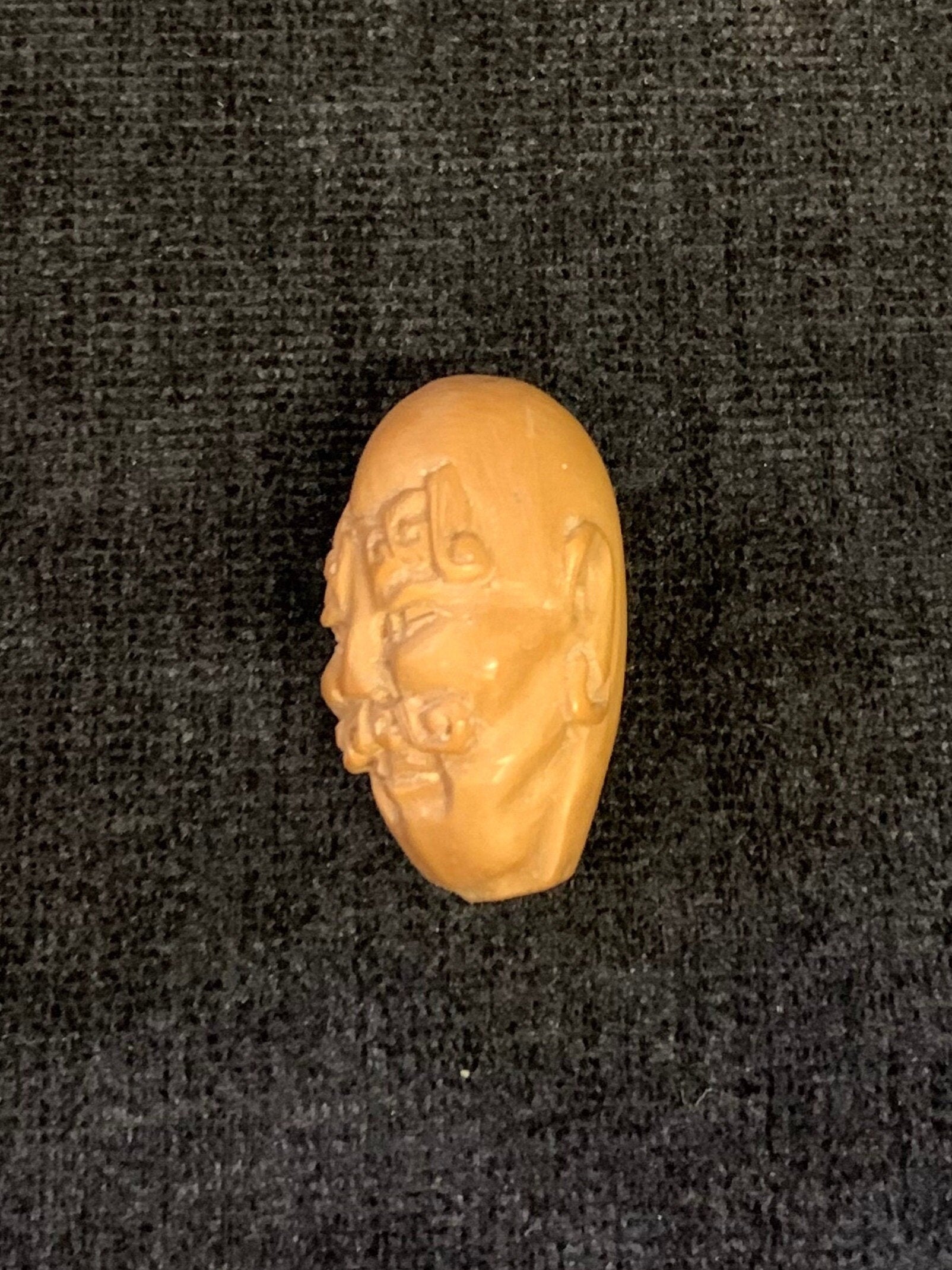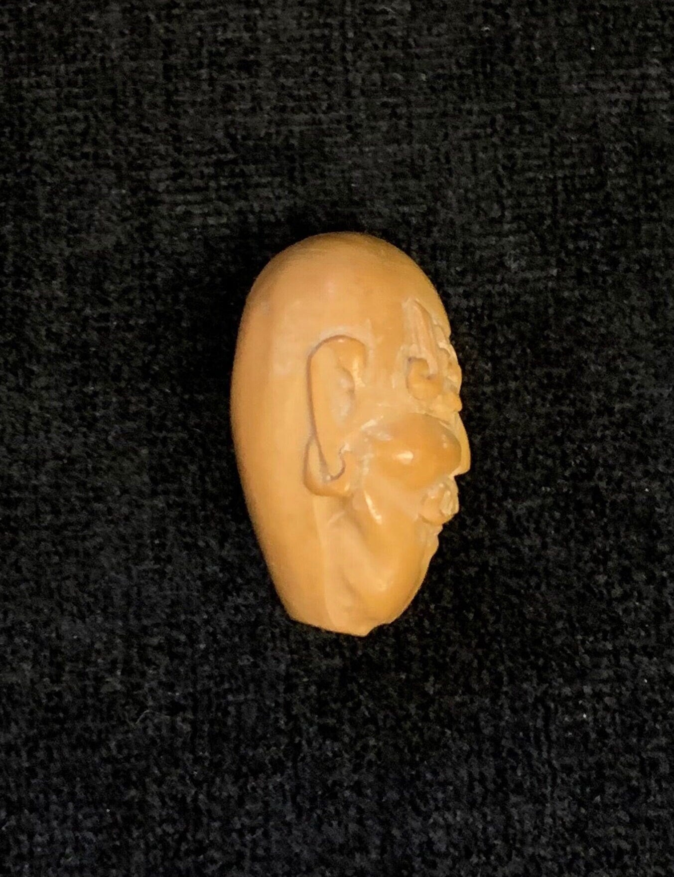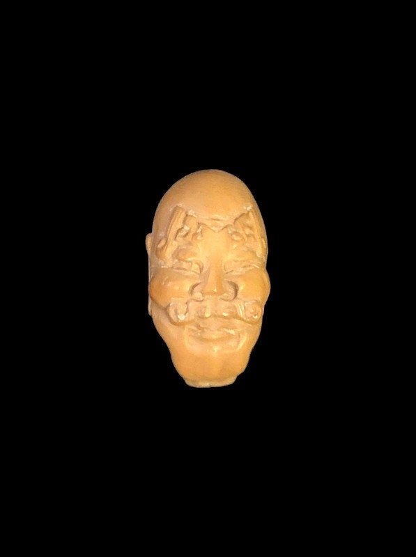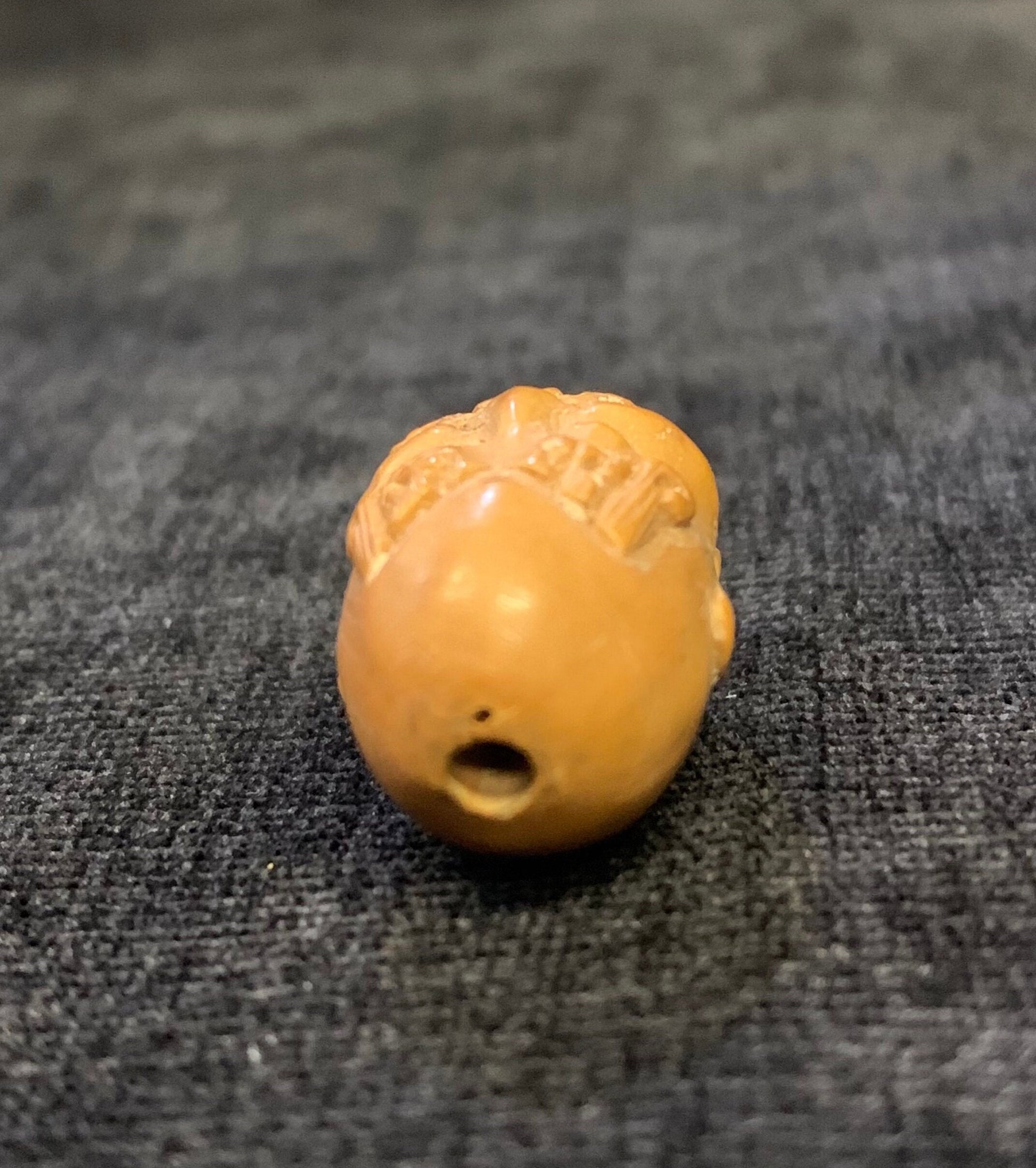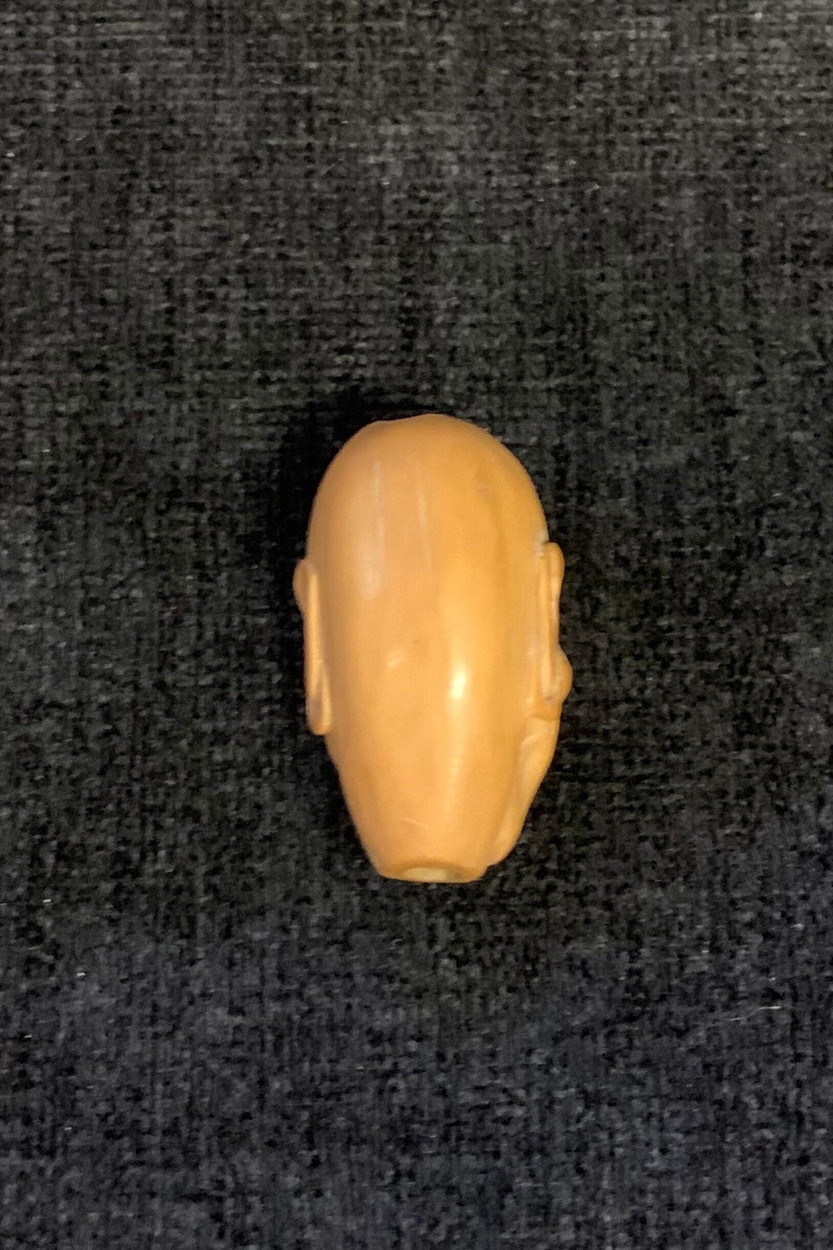 This is a handmade Mala bead carved from an olive nut. It is highly detailed and you can tell that it was crafted with care. This is a one-of-a-kind bead, as the artist carves each one along the lines of the nut's growth. Mala beads are typically used in prayer and meditation. This particular bead is just over 1" long, 0.5" wide, and 0.5" tall. The wonderful face is smiling and open to friendship.