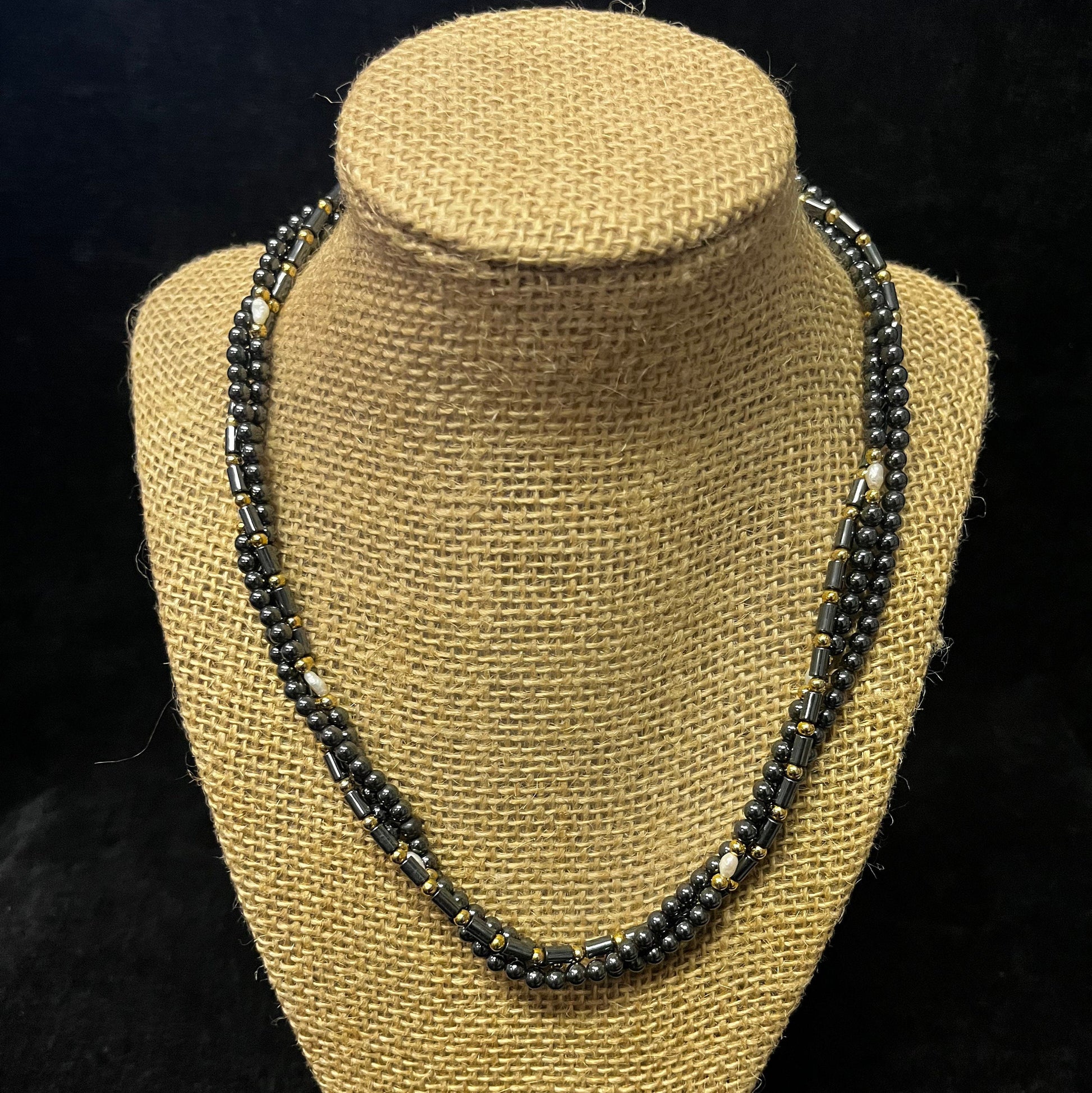 Hematite 3 Strand Layered Necklace With Gold and Pearl Accents