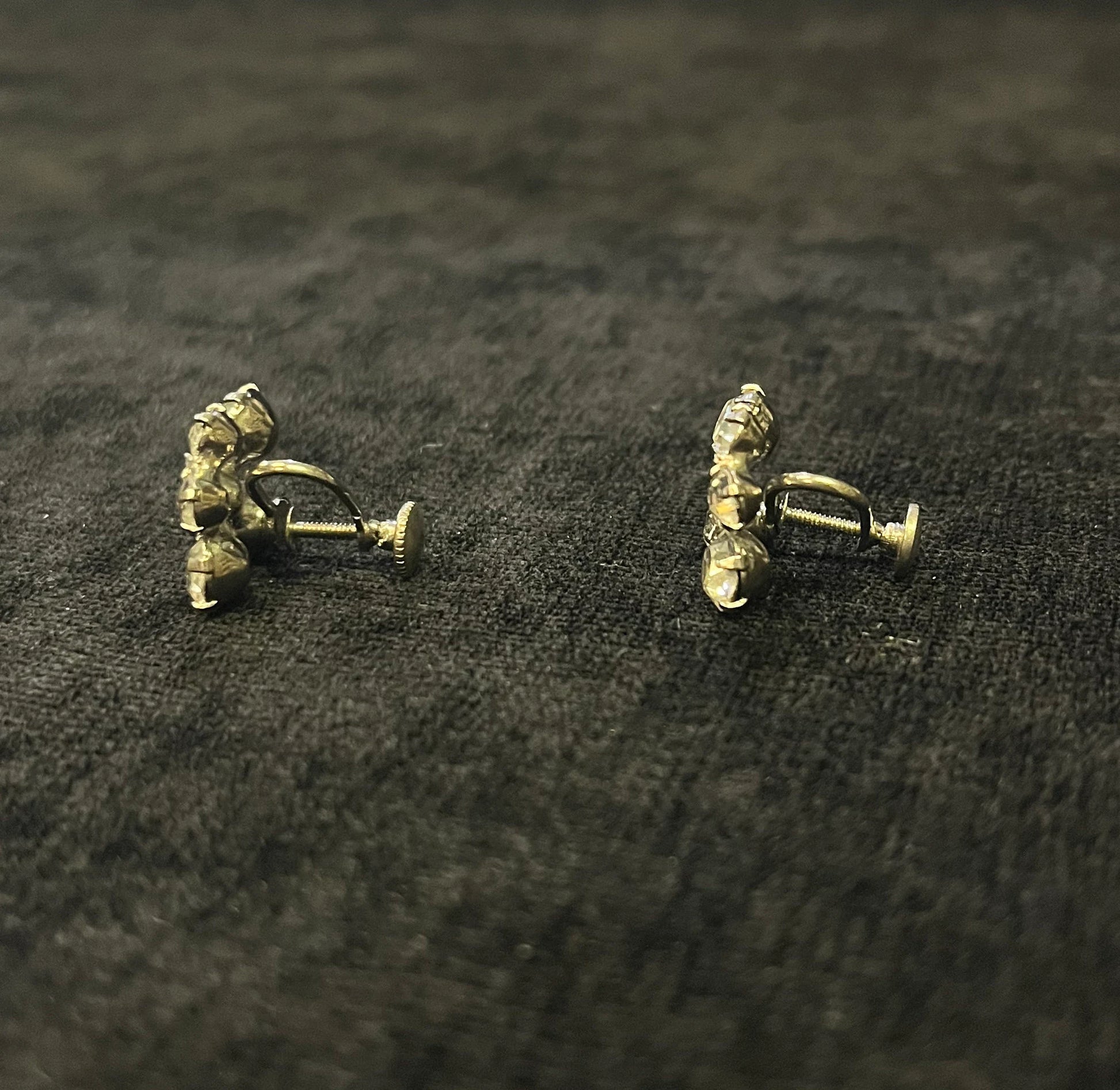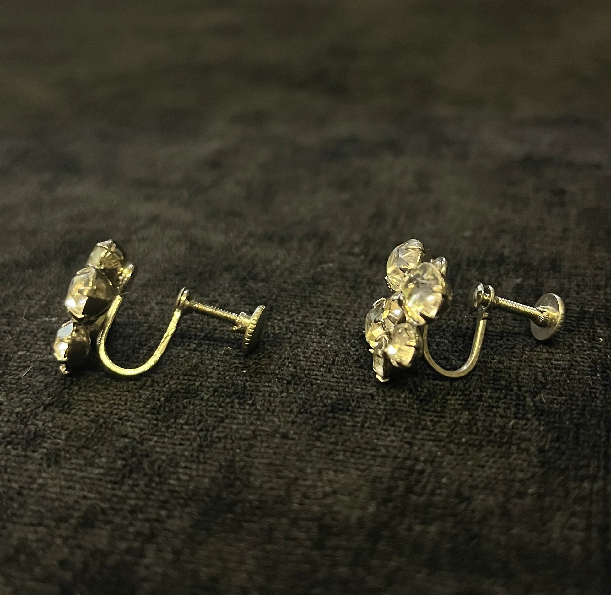 These high grade crystal earrings with the floral design are exquisite and captivating pieces of artistry and craftsmanship. These earrings have the ability to add a touch of luxury to any setting. The rhinestones used in these designs are carefully selected for their clarity, cut, and brilliance, ensuring that they reflect light in a mesmerizing way, creating a dazzling display of shimmer and sparkle. These clip on earrings reflect a sense of vintage taste and elegance. They are in great condition.