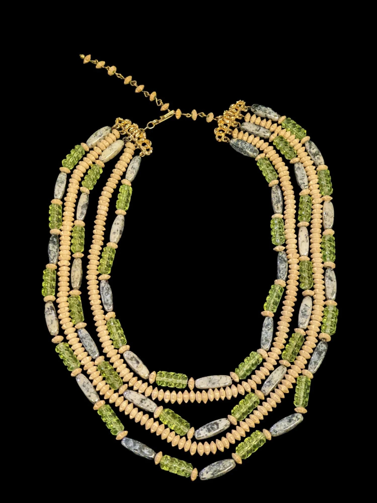 Lovely, HOBE' signed, 5 Strand Beaded Necklace. Adorable small flower shaped wooden beads, spiral carved citron Crystal interspersed with black and white speckled stone beads. Has a gorgeous gold toned clasp and adjustable closure that uses the wooden flower beads as an adjustable link chain.