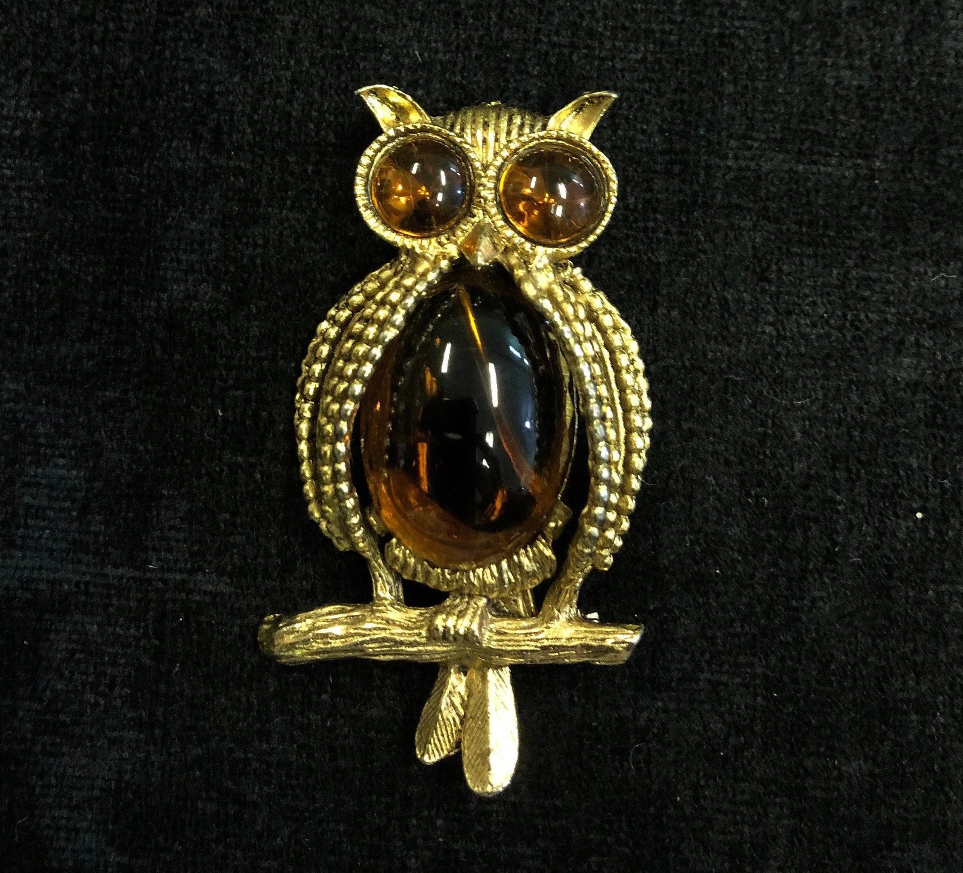 Hobé Owl Pin with Glass Topaz Jelly Belly Center - Mid Century, Figural Brooch