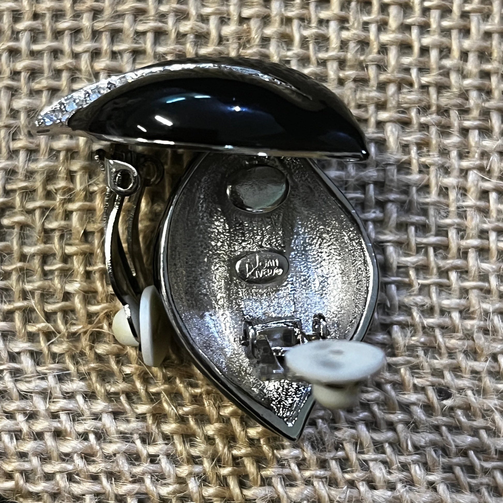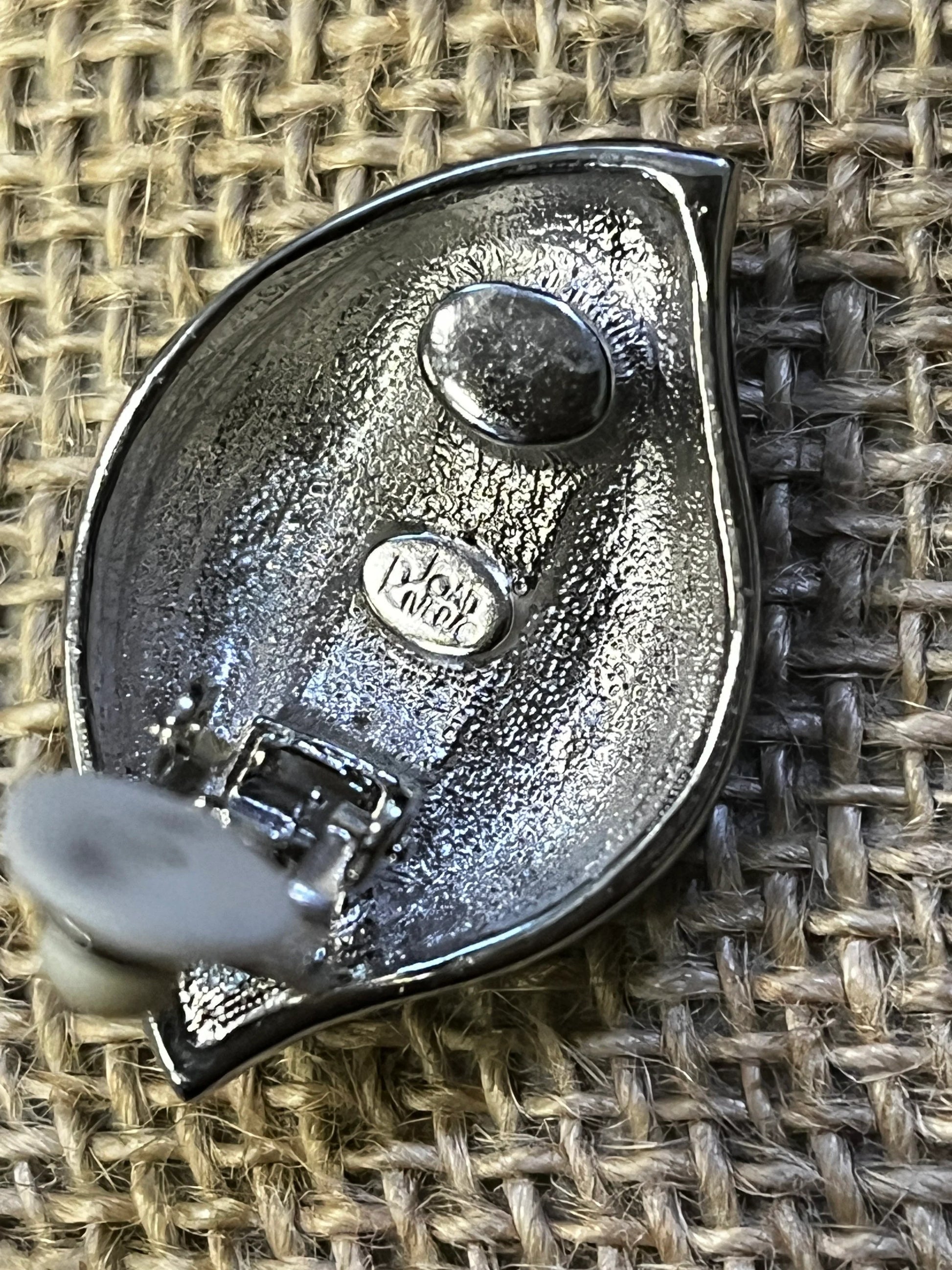 Designed to resemble a split leaf, these earrings are black with a split of crystal gemstones. Ready for an elegant black tie event, the clip on earrings will stay comfortably for a whole night. They were designed by the Joan Rivers Company and the Makers Mark Joan Rivers is on the back of the earrings.