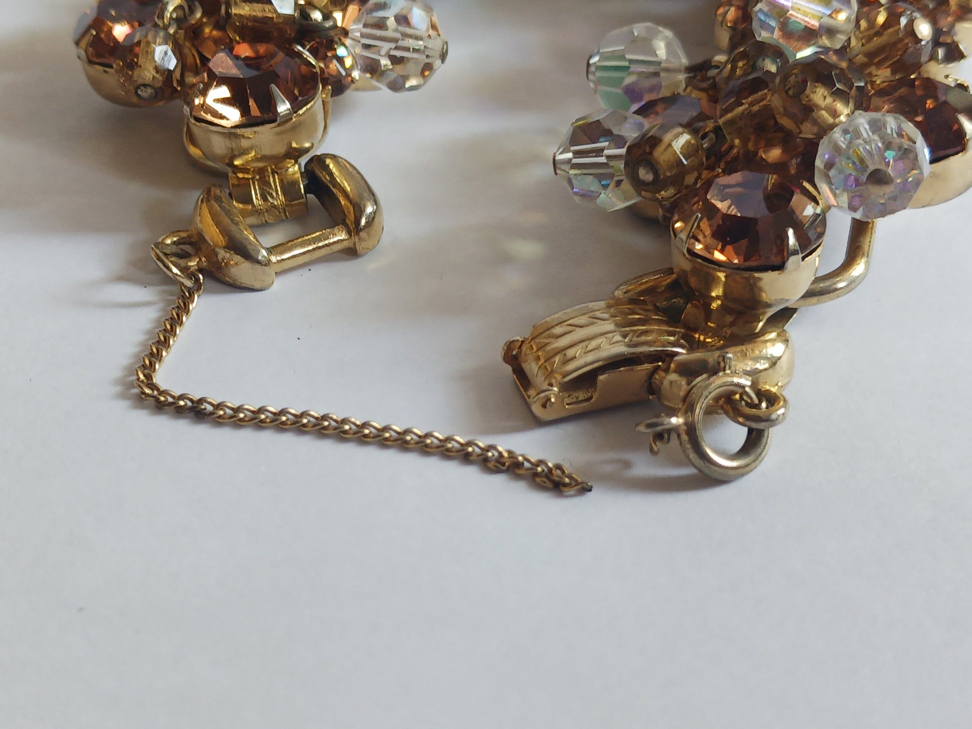 If you know someone who loves vintage pieces that really shine, look no further. This listing is for one of Juliana Gray's Cha-cha jewelry sets. The set includes one bracelet, and a pair of matching clip-on earrings. Both pieces are composed primarily of beads in both clear and honey tones, and topaz colored rhinestones set on a gold plated base. The length of the bracelet, excluding clasps, is 6.25in, and each earring is 1.25in in diameter. Please note, that the set is in overall good condition, but shows signs of wear and has a broken circle clasp (see photos). With a light clean and some repair, this will be a set that truly puts a flattering spotlight on the wearer.