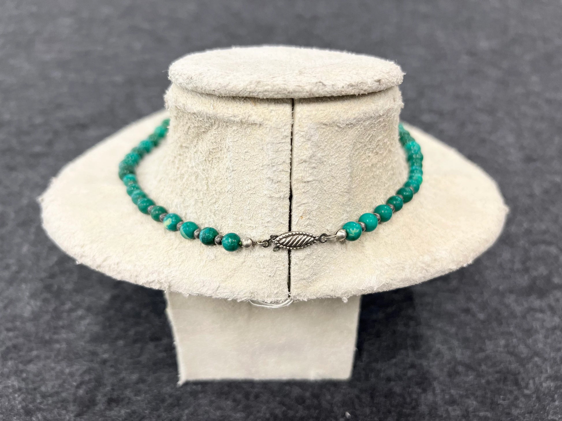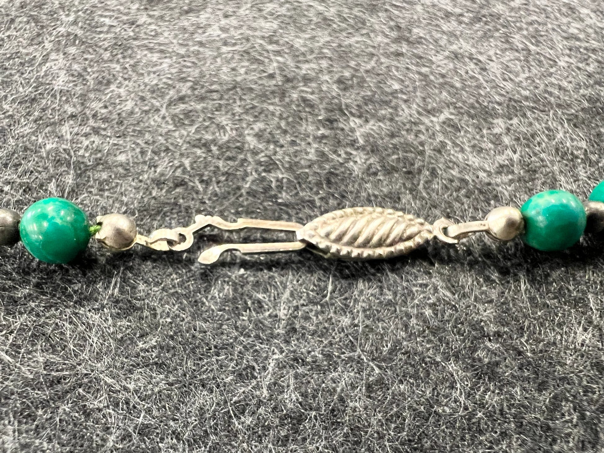 This is a Kelly Green Agate Necklace, perfect for all Seasons. It is Mid Century Boho Style at 25" Long with sterling silver ball separators between Graduating Green Agates. A beautiful summer necklace when the stones are cool to the touch, or at Christmas when they warm from laying against the skin. Great gift for the lady in love with the color Green. This vintage necklace is in wonderfull condition.