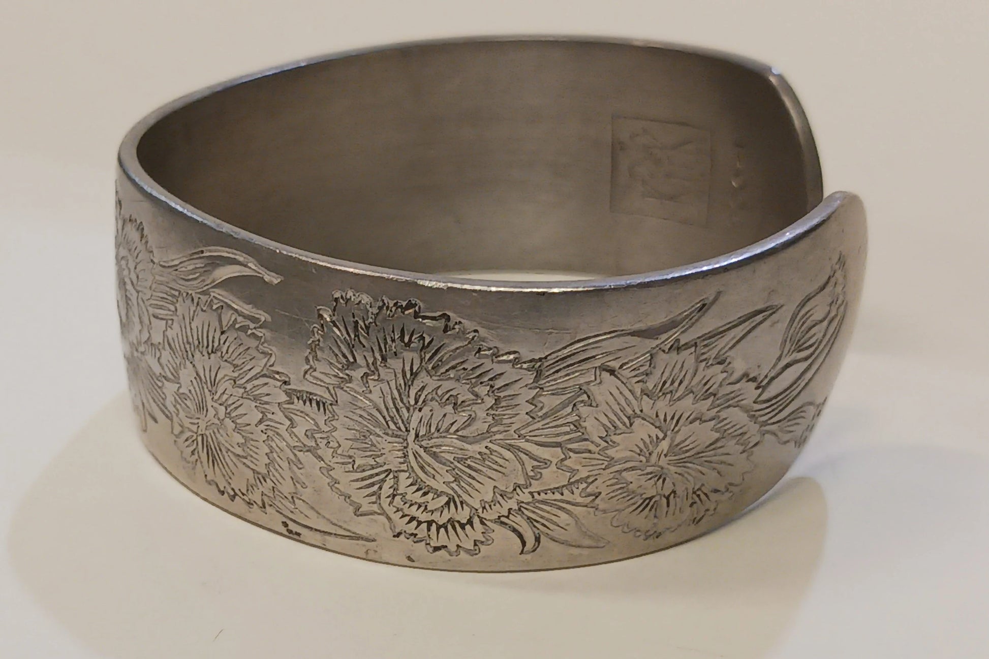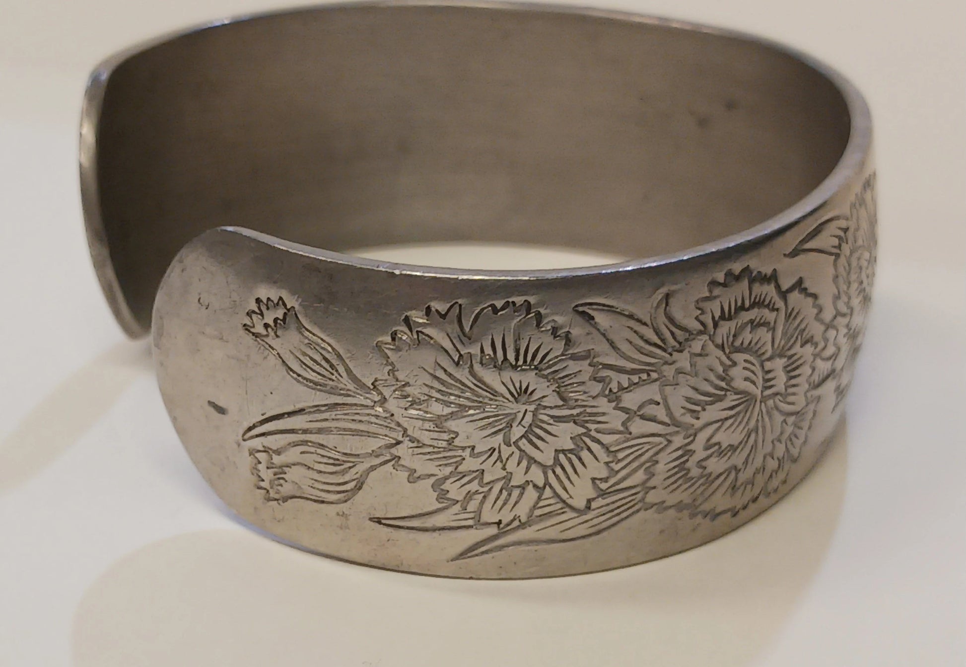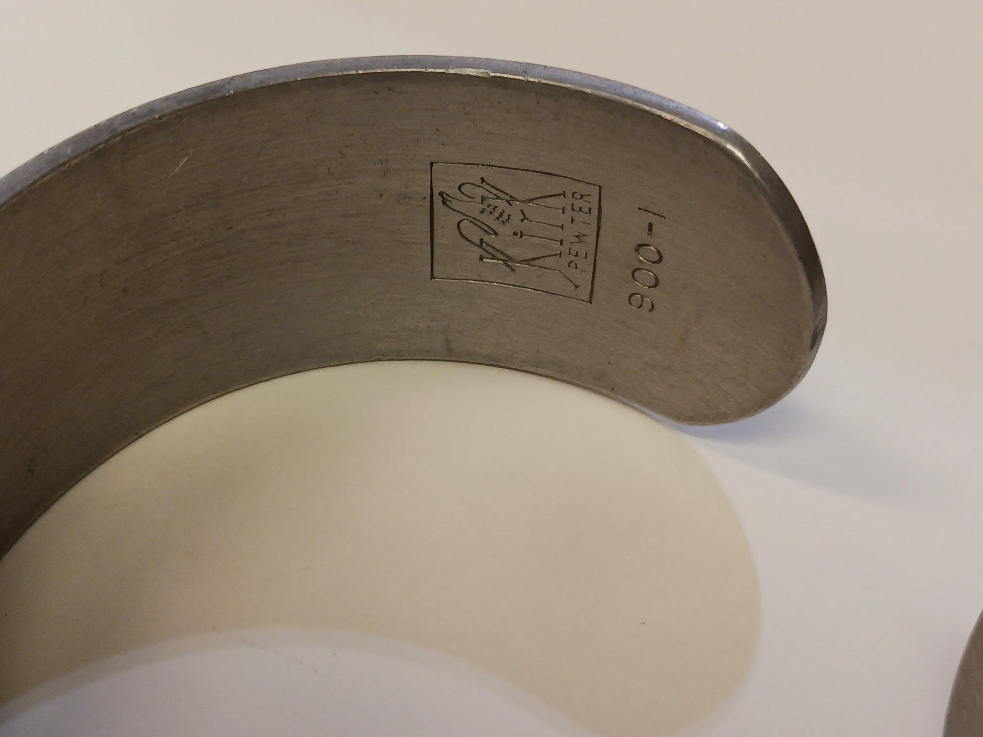 The company that produced this piece has quite a storied history. It went through a few different names before officially being founded in 1904 under the name Stieff Company. The Stieff Company changed hands several times and survived until 1990. This cuff was created between 1979-1989, after the Stieff Company purchased their rival, S. Kirk & Son. As part of the purchase agreement, Stieff Company agreed to add the Kirk name to their name, becoming the Kirk-Stieff Company. As such, this cuff, and all jewelry and products made during this period, bear a "Kirk" Makers Mark. The cuff has a width of 1", with a diameter of 2.5", which can be somewhat adjusted with a gentle pull to the sides. At the inside ends, there are a couple of different markings. The left end reads, "Carnations," while the right bears the "KirK PEWTER 900-1" stamp. The bracelet is in good condition, with a low shine and limited signs of wear. There are a few small surface-level scratches, which are to be expected on a vintage pewter piece. (see photos). Otherwise, this bracelet is beautiful and ready to go to a good home.