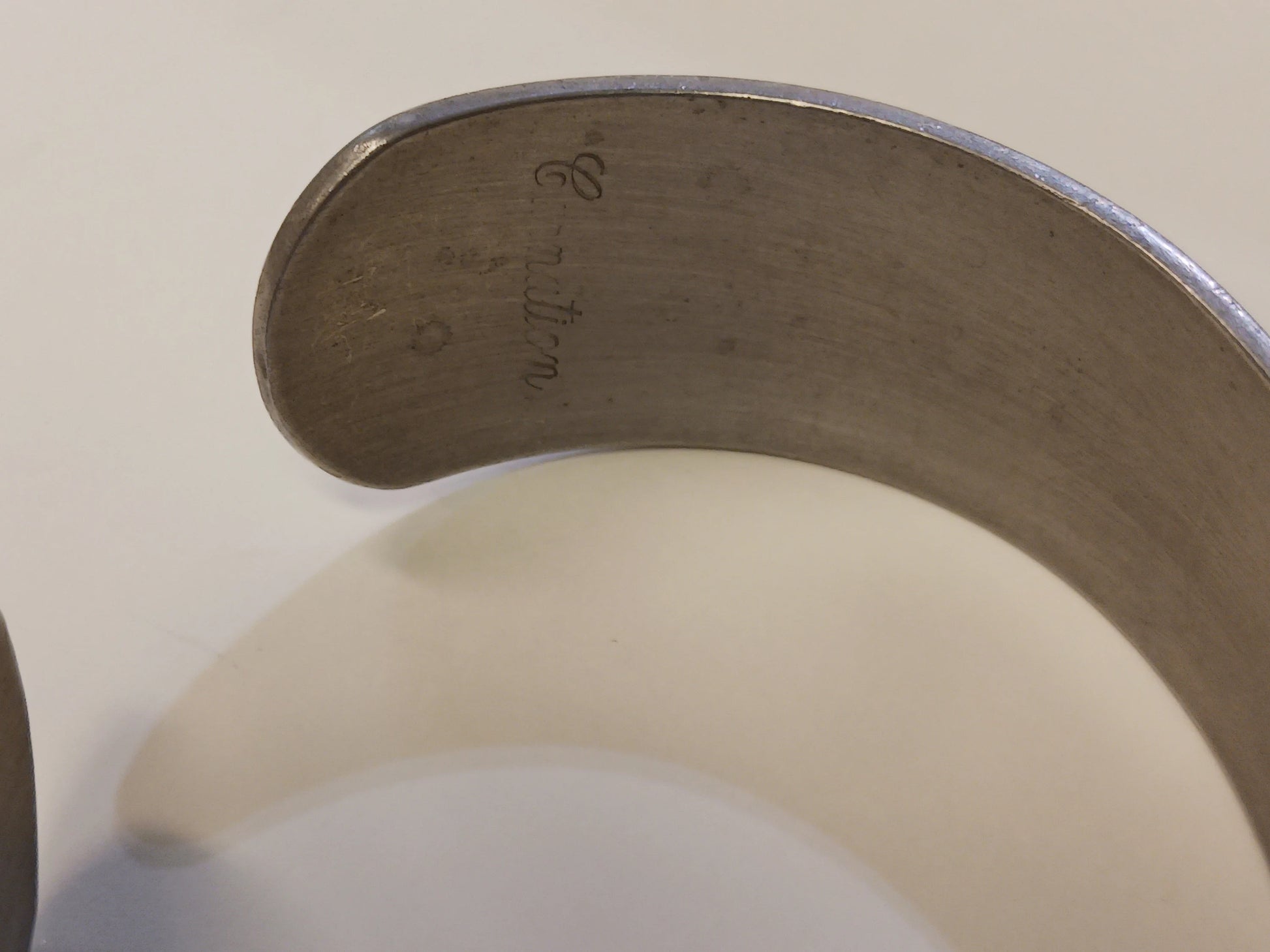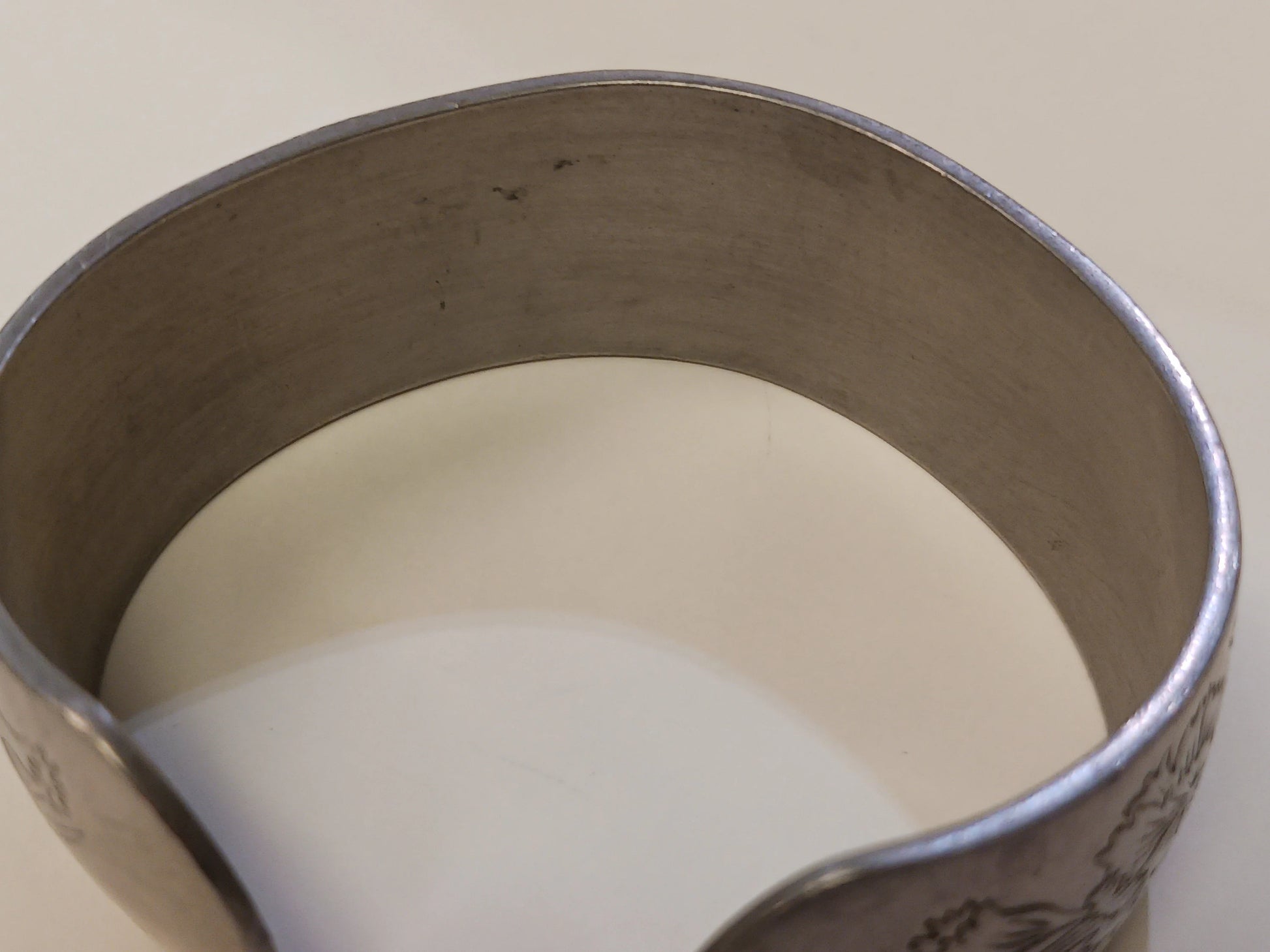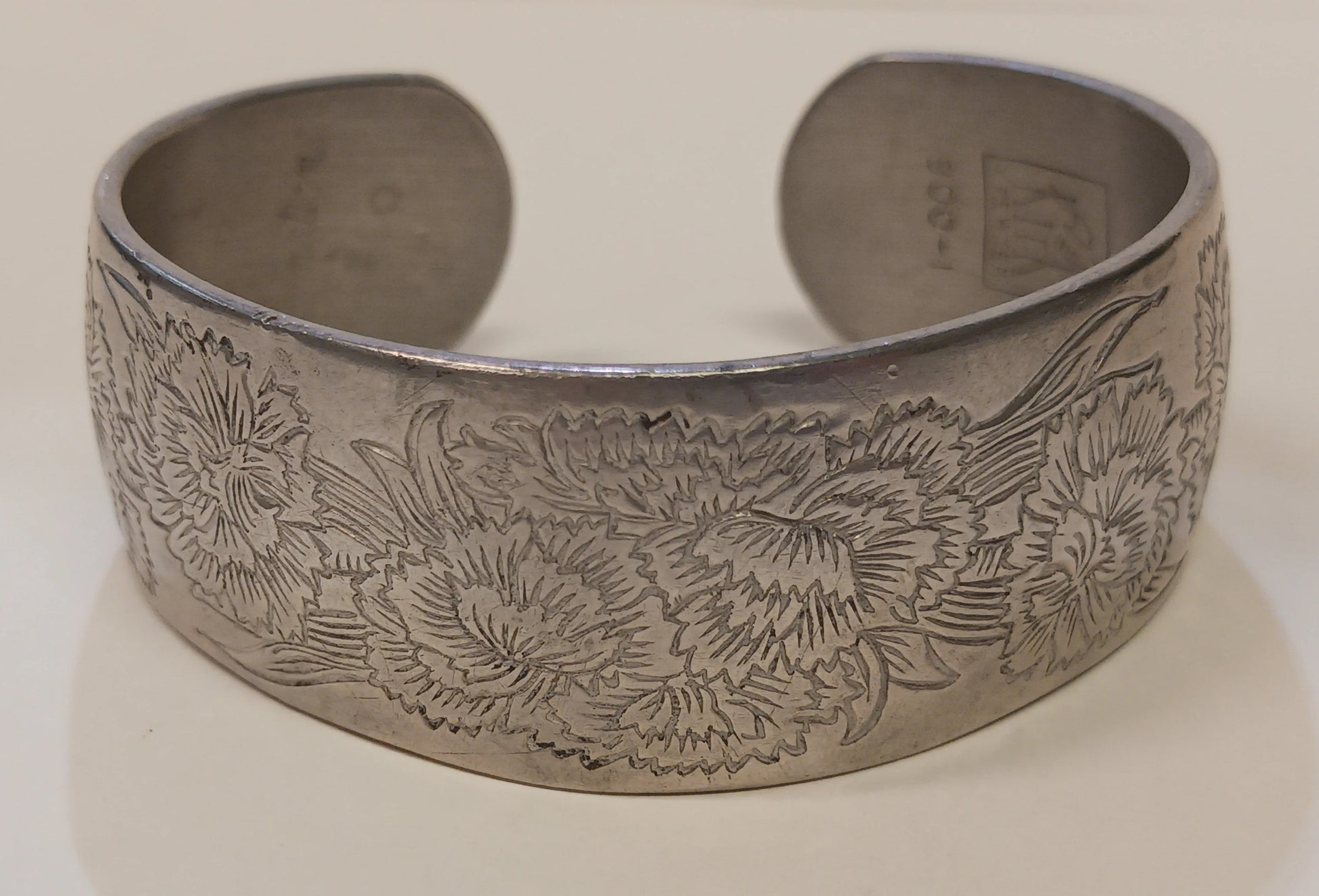 The company that produced this piece has quite a storied history. It went through a few different names before officially being founded in 1904 under the name Stieff Company. The Stieff Company changed hands several times and survived until 1990. This cuff was created between 1979-1989, after the Stieff Company purchased their rival, S. Kirk & Son. As part of the purchase agreement, Stieff Company agreed to add the Kirk name to their name, becoming the Kirk-Stieff Company. As such, this cuff, and all jewelry and products made during this period, bear a "Kirk" Makers Mark. The cuff has a width of 1", with a diameter of 2.5", which can be somewhat adjusted with a gentle pull to the sides. At the inside ends, there are a couple of different markings. The left end reads, "Carnations," while the right bears the "KirK PEWTER 900-1" stamp. The bracelet is in good condition, with a low shine and limited signs of wear. There are a few small surface-level scratches, which are to be expected on a vintage pewter piece. (see photos). Otherwise, this bracelet is beautiful and ready to go to a good home.